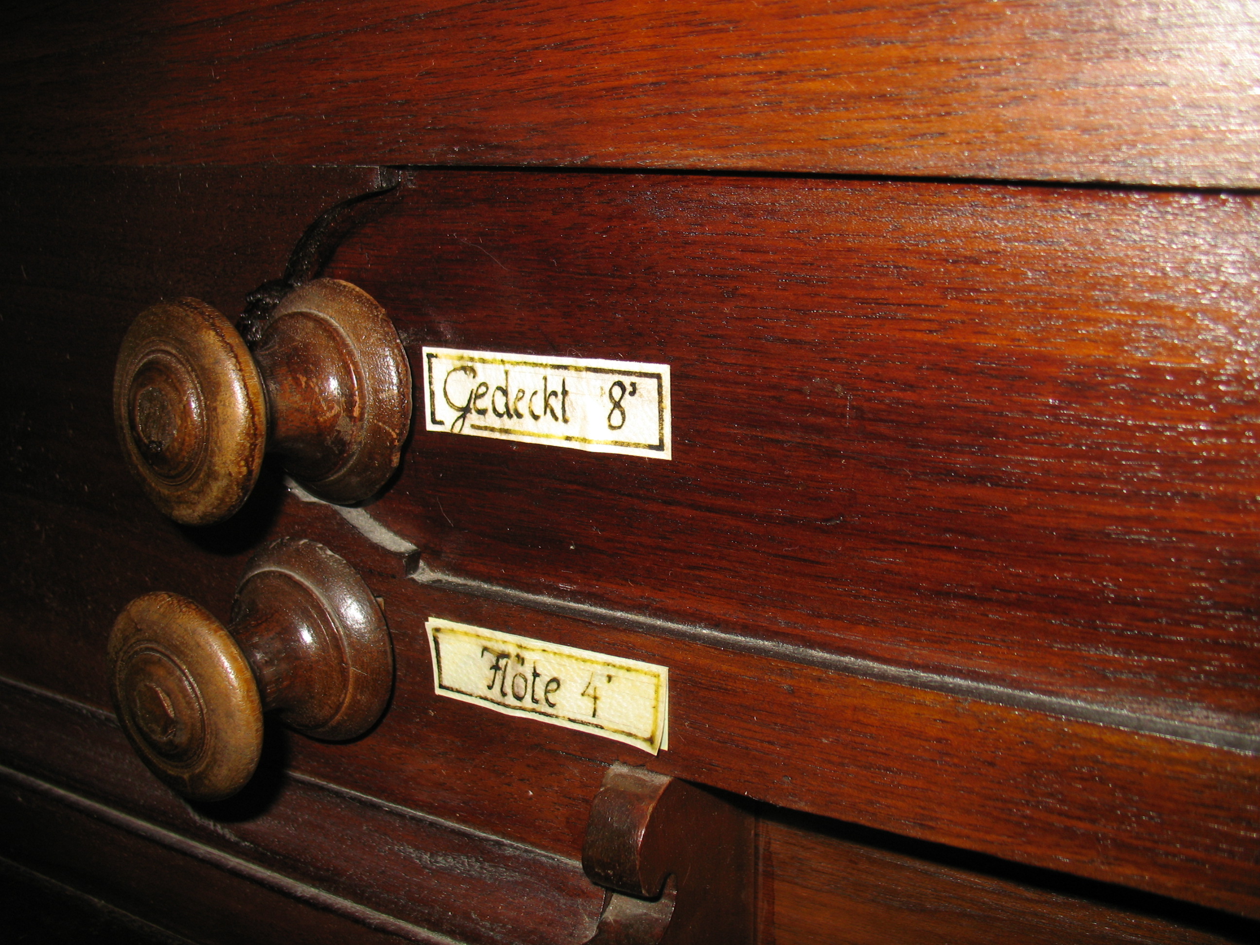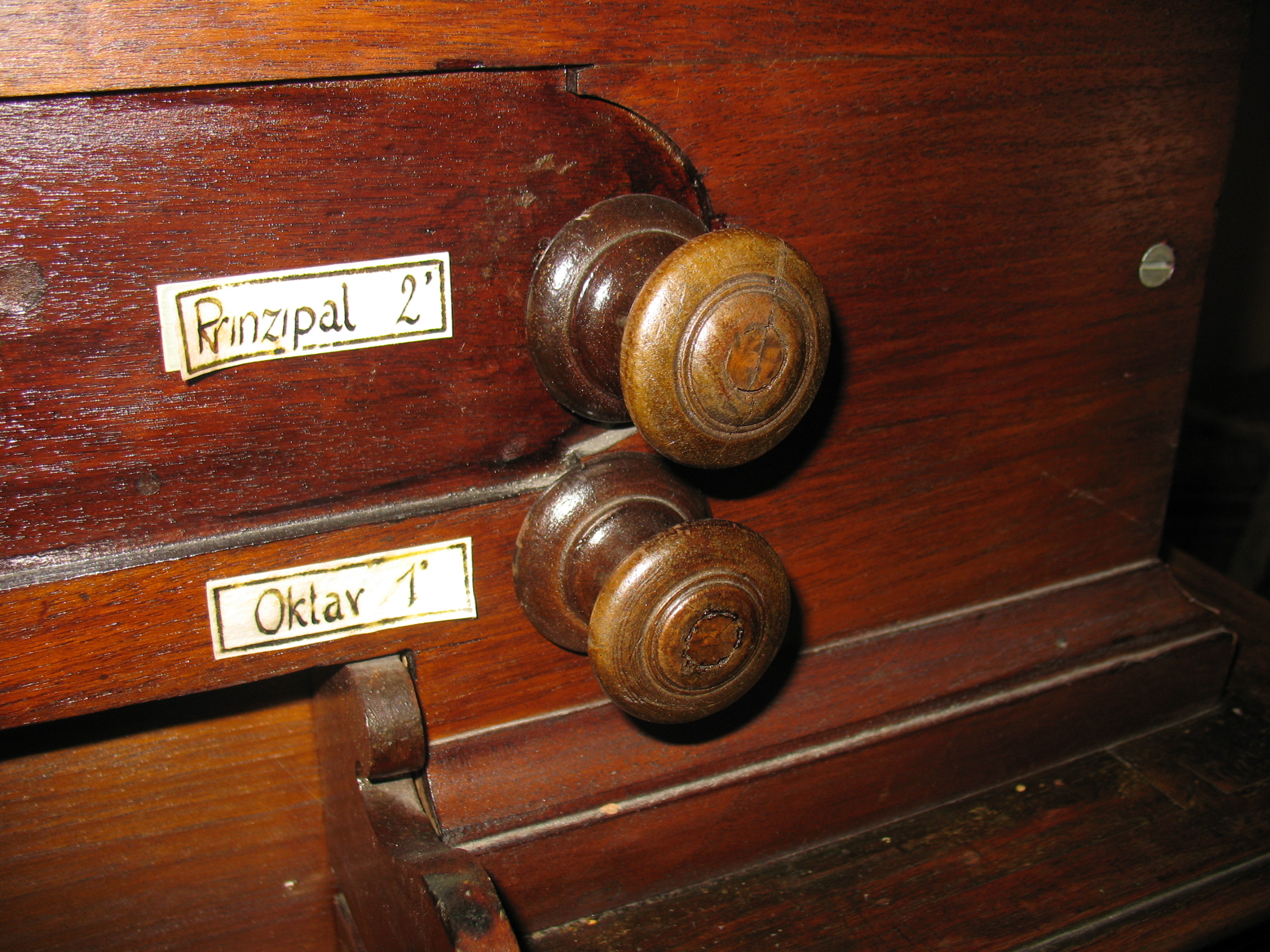 Die gedrechselten Registerzüge ragen links und rechts seitlich über dem Manual aus der Vorderwand des Oberkastens. Die Registerbezeichnungen stehen auf weissen Kunststoffschildern, die neben den Registerzügen angebracht wurden.