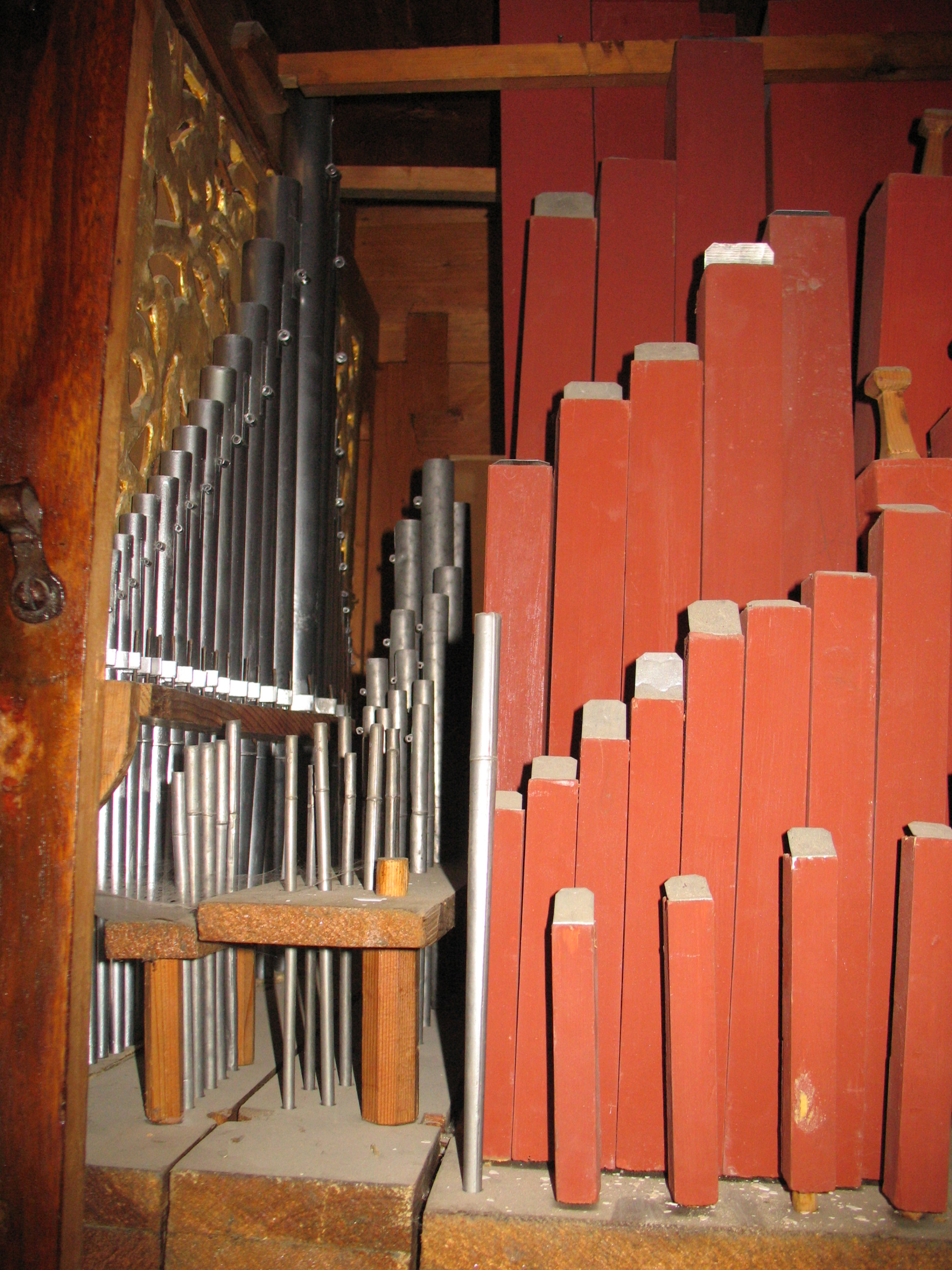 Traktur mechanisch; Wellen aus Holz; Tonkanzellenschleiflade; Rahmen und Kanzellenspünde aus Hartholz; Schiede, Windkasten und Ventile aus Fichte; Lederpulpeten; Federn, Führungsstifte und Abzugdraht original aus Eisen (teilweise durch Messingdraht ersetzt).