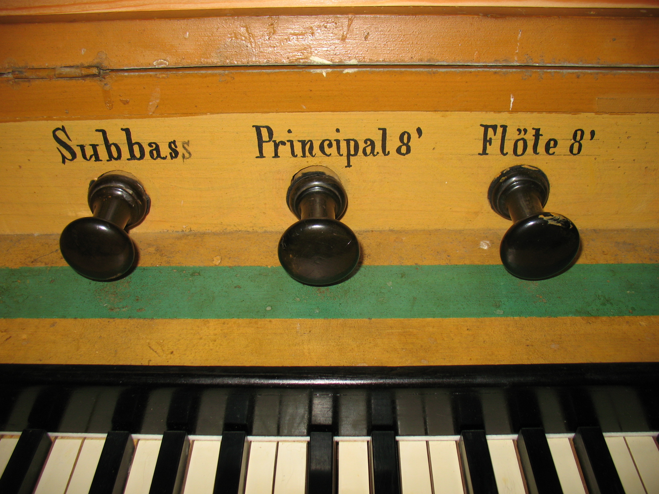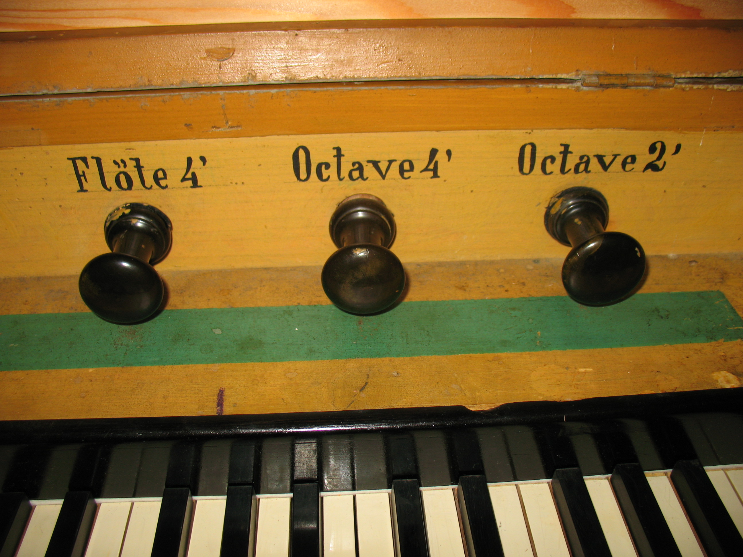 Die Registerzüge sind in einer Reihe über der Klaviatur angebracht. Sie sind messergriffähnlich. Die Registerbezeichnungen stehen üner den Zügen.