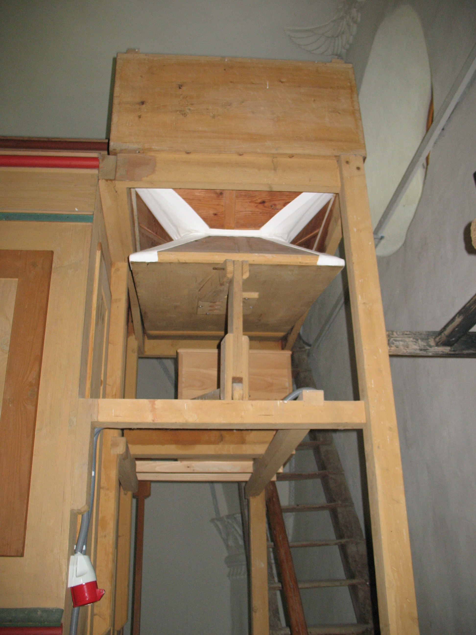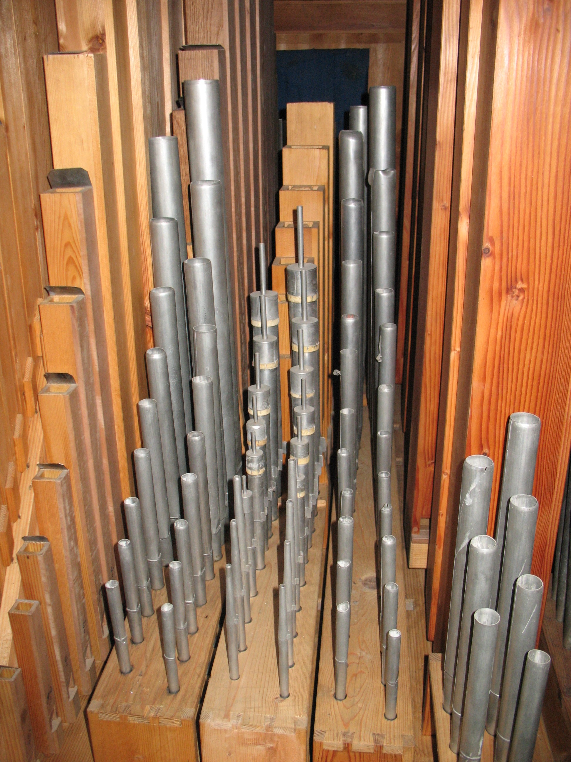 Der Spieltisch steht vor der Orgel an der Brüstung.