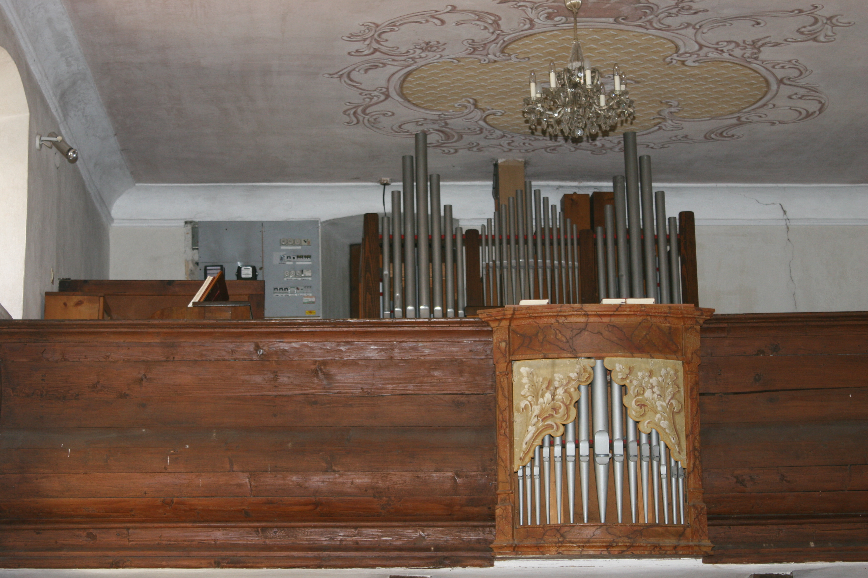 In die Emporenbrüstung ist das Rückpositiv einer nicht mehr vorhandenen Orgel eingebaut. Zwei kleine Pilaster begrenzen ein Feld mit 15 Pfeifen (ursprünglich 30 Pfeifen), das in einem flachen Bogen hervortritt. Auf die Schleierbretter sind zwei Blumensträuße gemalt. Das Gebälk ist profiliert.