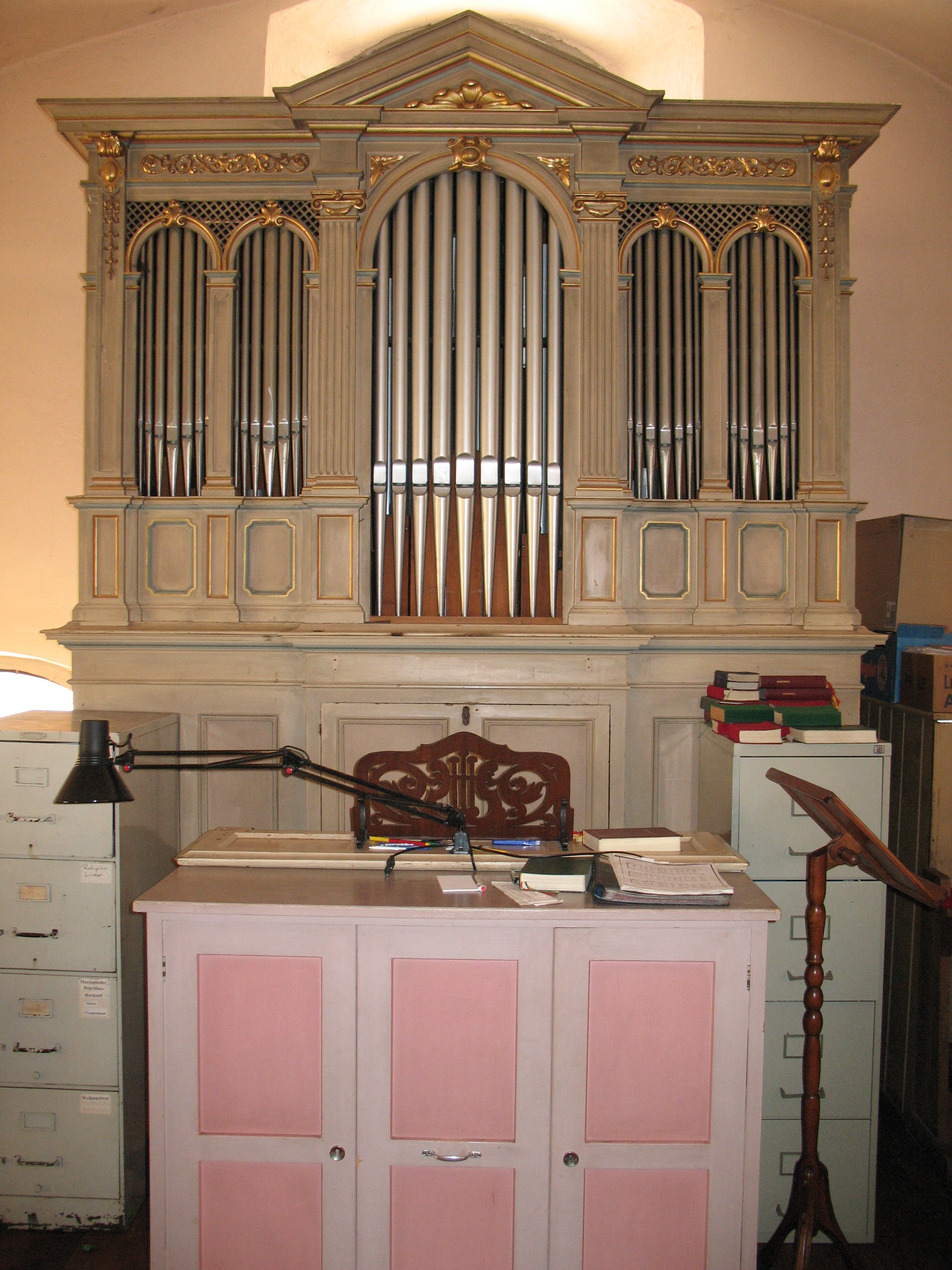 Das beige gehaltene Gehäuse wird von einem profilierten Gesims in Ober- und Unterteil gegliedert. Der Prospekt besitzt fünf Felder 7/7/9/7/7. Vier Pilaster mit Postament gliedern den Prospekt in drei Teile. Die beiden mittleren sind mit kanneliertem Schaft und vergoldetem Volutenkapitell ausgeführt. Den oberen Abschluß der Felder bildet je ein Bogen mit angedeutetem Kämpfergesims. An den Scheiteln der Bögen ist je eine geschnitzte, vergoldete Applikation angebracht. Auf den Zwickeln des mittleren Feldes befindet sich je eine geschnitzte, vergoldete Blattapplikation. Die beiden Seitenteile werden je von einem jleineren Pilaster mit Postament in zwei Pfeifenfelder unterteilt. Über ihnen befindet sich ein Gitter. Darüber ist eine längliche, geschnitzte und vergoldete Applikation angebracht: verschlungene Ranken mit Blättern. Das profilierte Gebälk über den Seitenteilen ist gerade, das über dem Mittelteil hat die Form eines Dreieckgiebels. Im Giebelfeld befindet sich eine geschnitzte, vergoldete Blattapplikation.