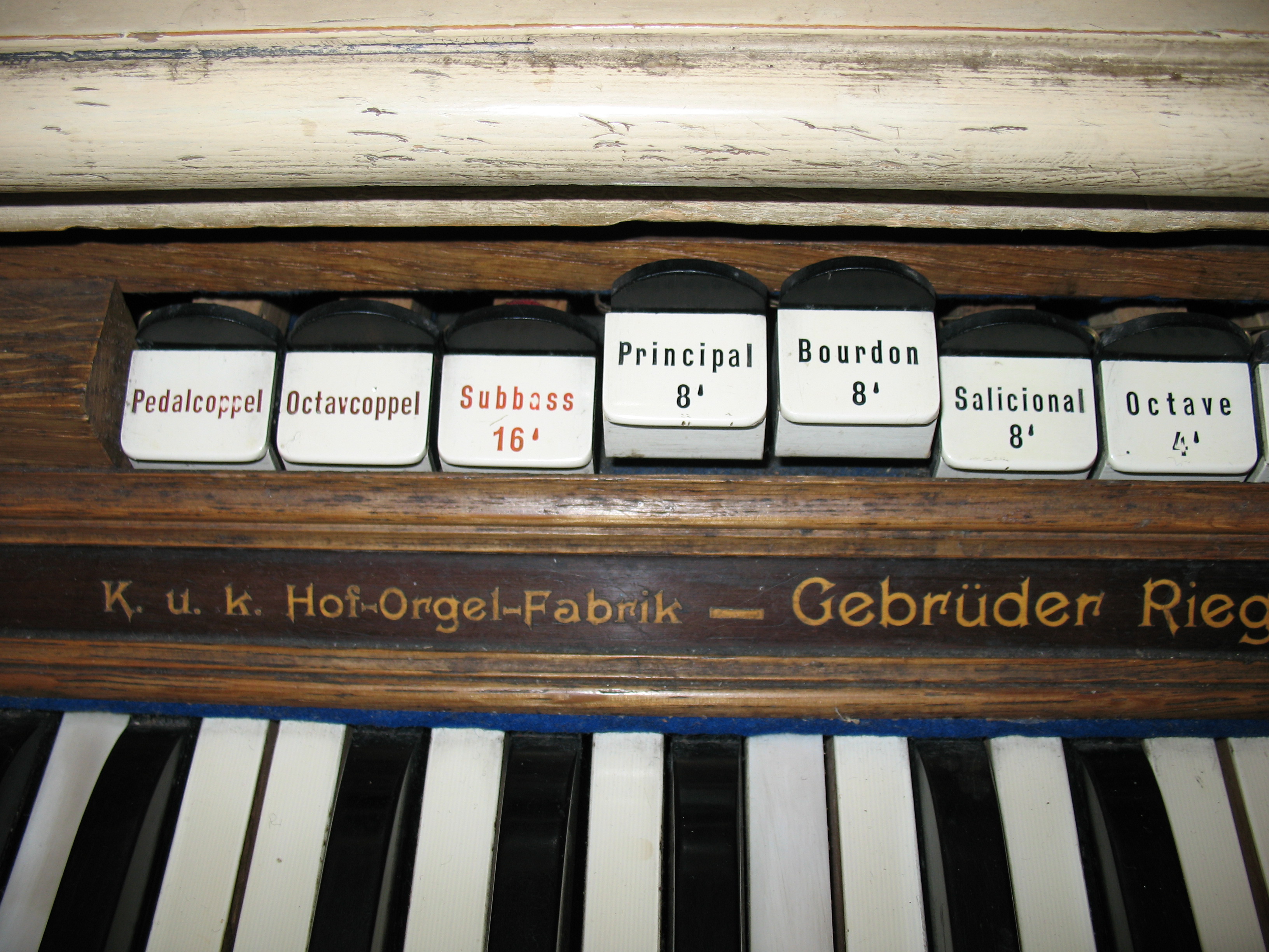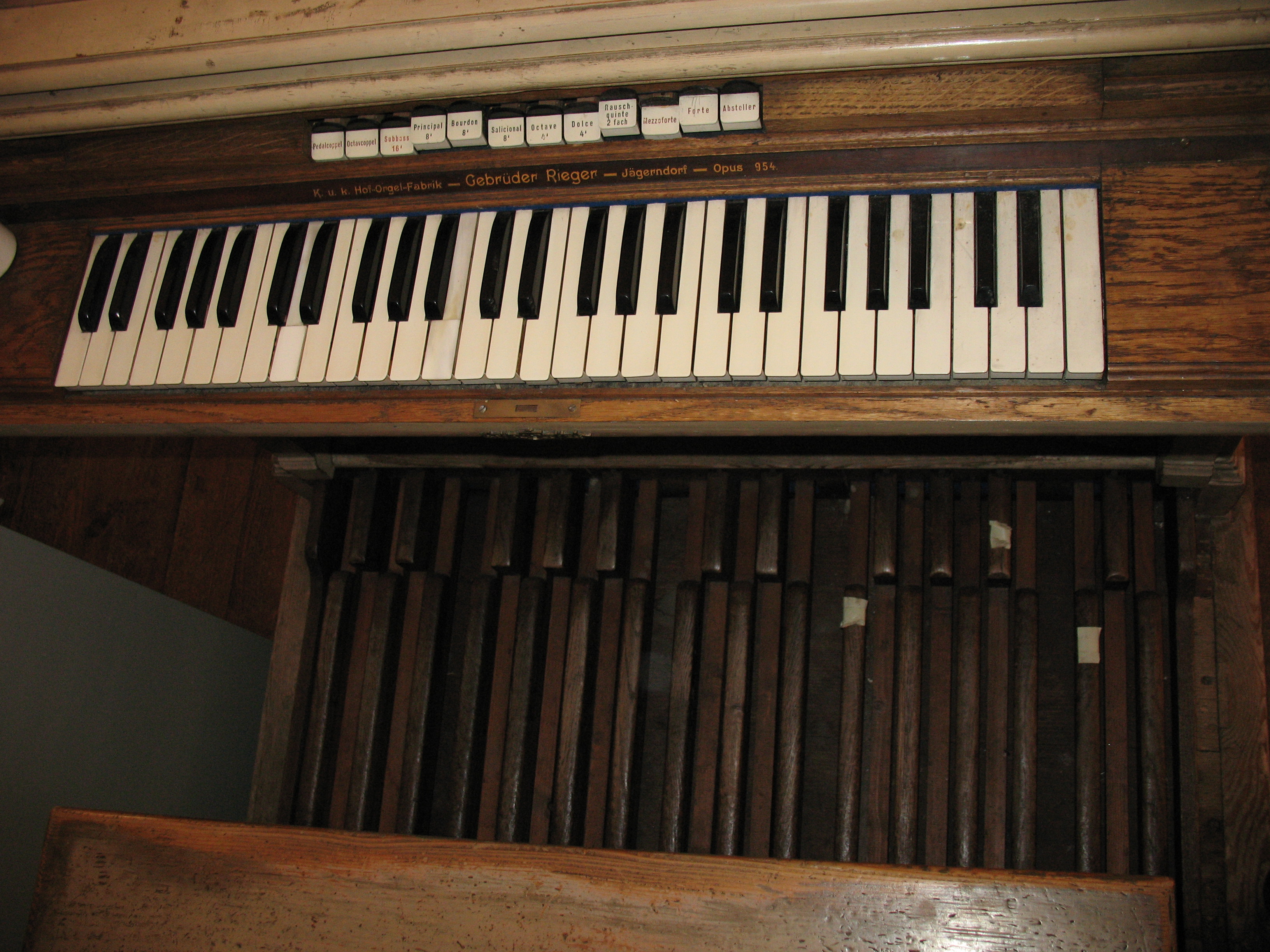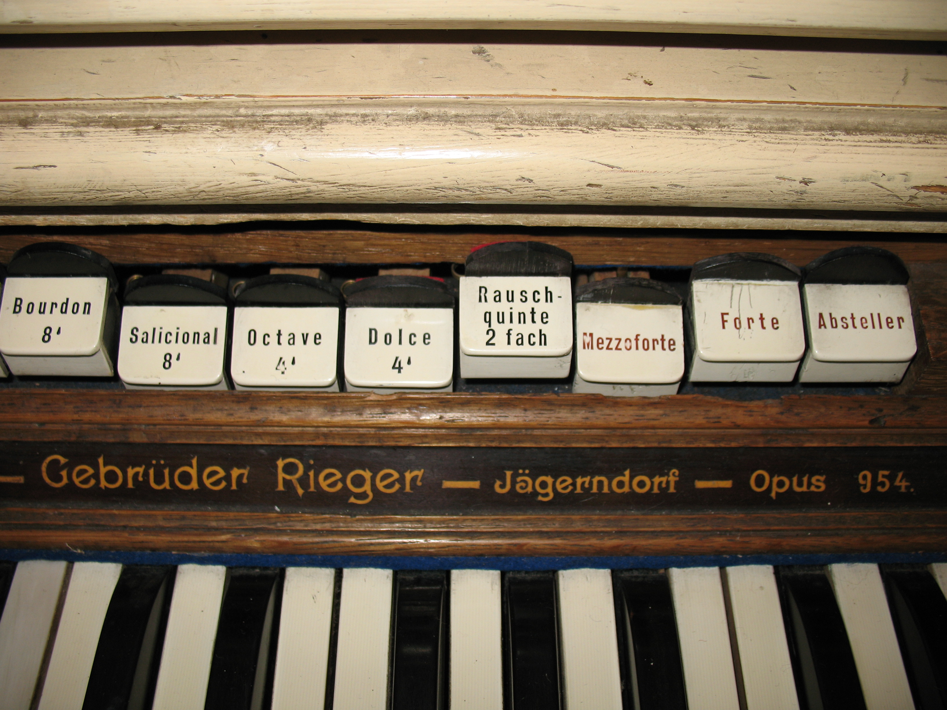 Auf der Klaviaturabdeckung (innen) befindet sich ein längliches Schild mit der Aufschrift: "Gebrüder Rieger Jägerndorf Op. 954". Die Orgel wurde im Jahre 1902 aufgestellt.