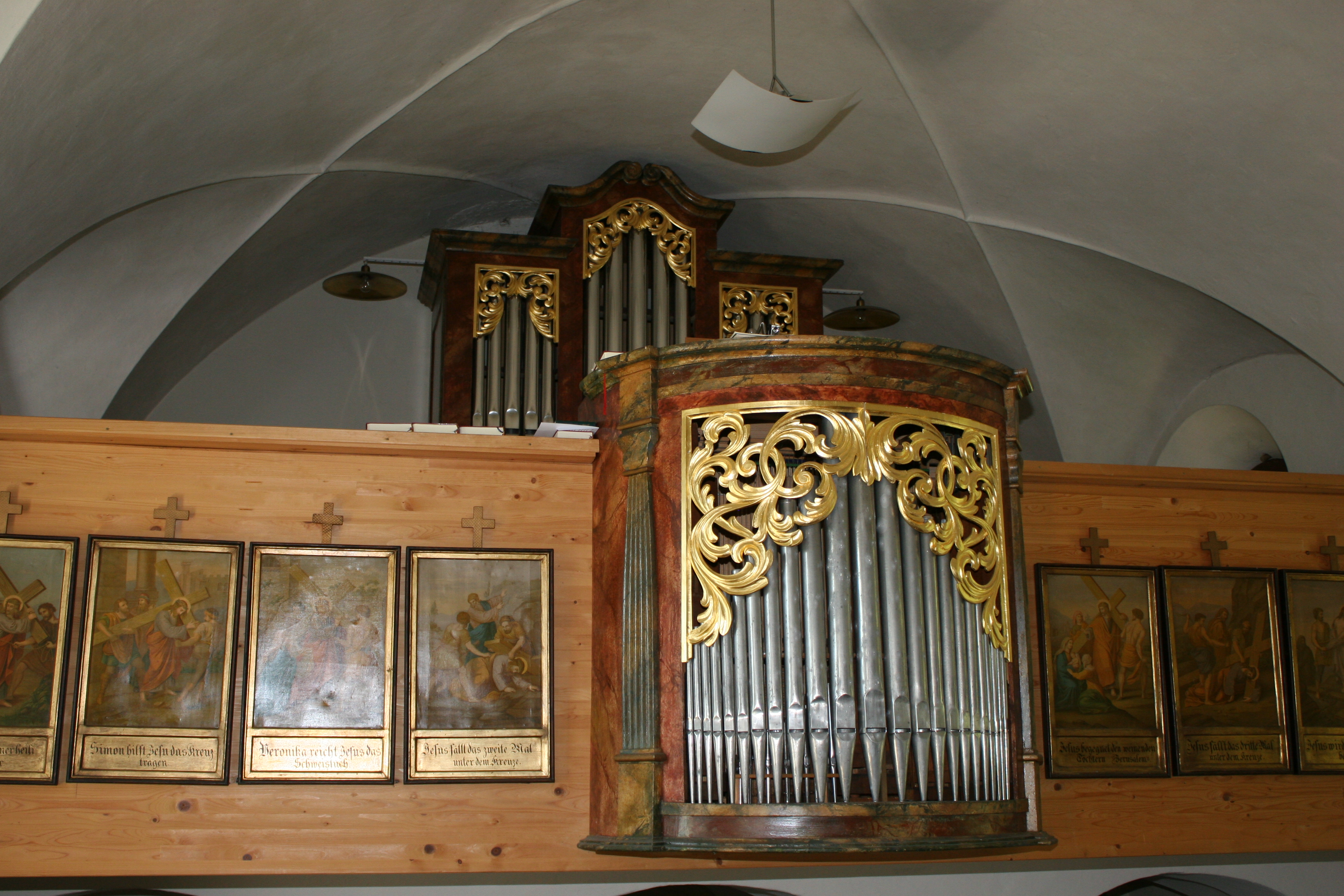 Der Erbauer ist nicht bekannt. Auf Grund der Gehäusegestaltung muß das Instrument in der 1. Hälfte des 19. Jahrhunderts entstanden sein. Die Orgel wurde 1895 von Franz Colaric in St. Ulrich aufgestellt.