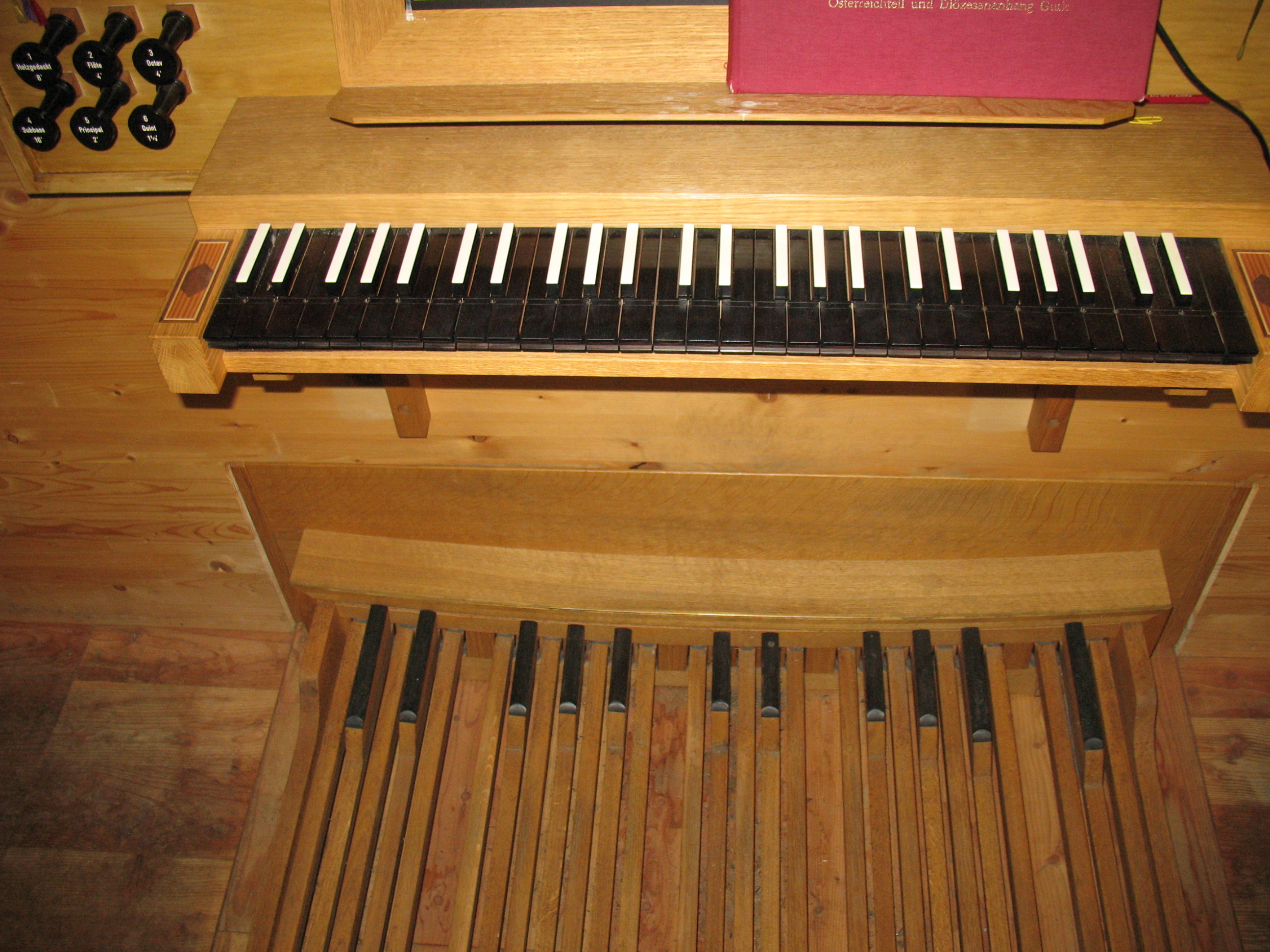 Der Spieltisch ist am Rückpositiv angebracht. Unteres Manual Hauptwerk, oberes Rückpositiv.