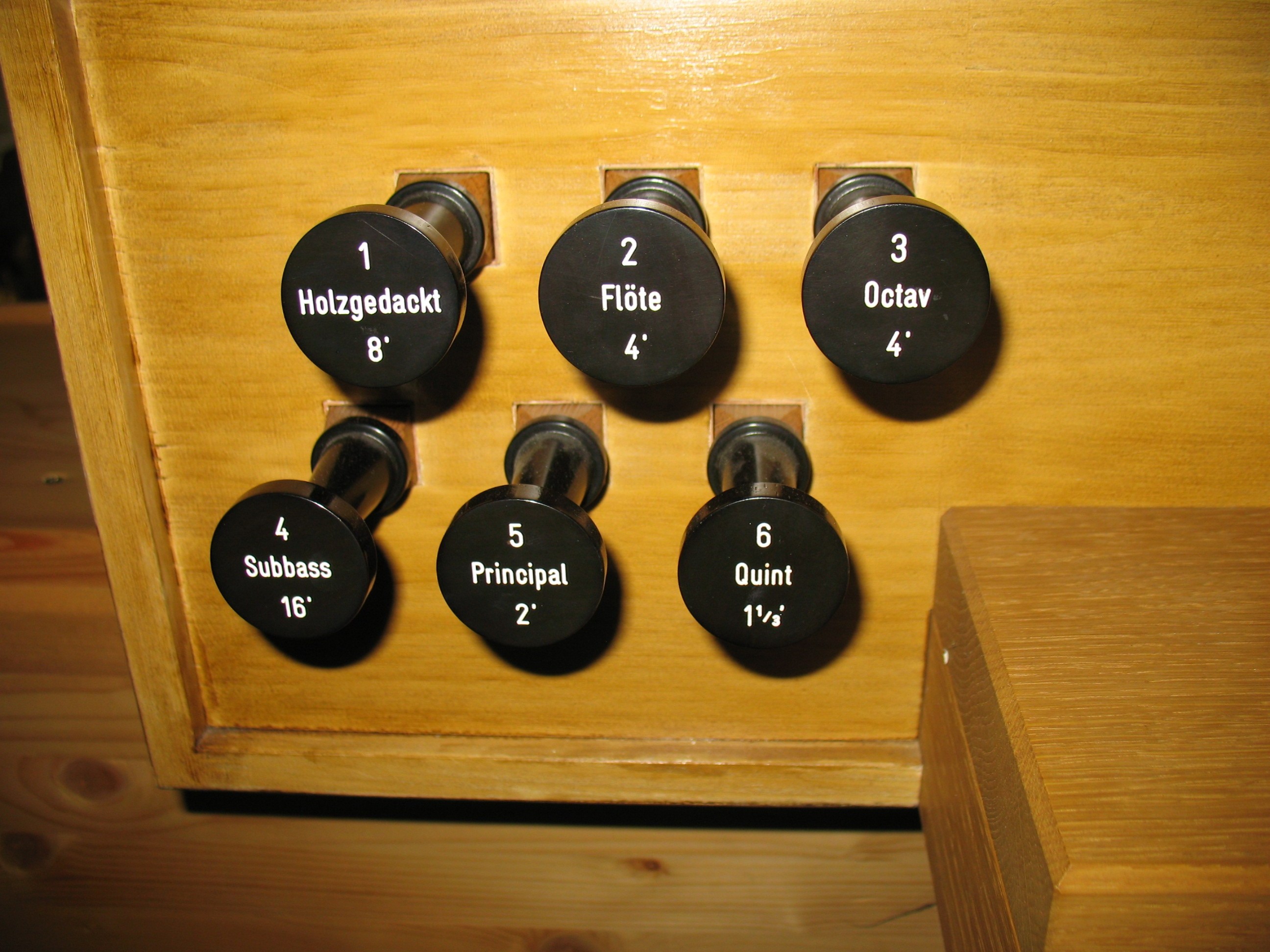 Die Registerzüge sind in einer waagrechten Reihe rechts und links der Klaviatur angebracht. Registerzüge: auf den Stirnflächen runder Holzstangen sind gedrechselte Knöpfe angebracht.