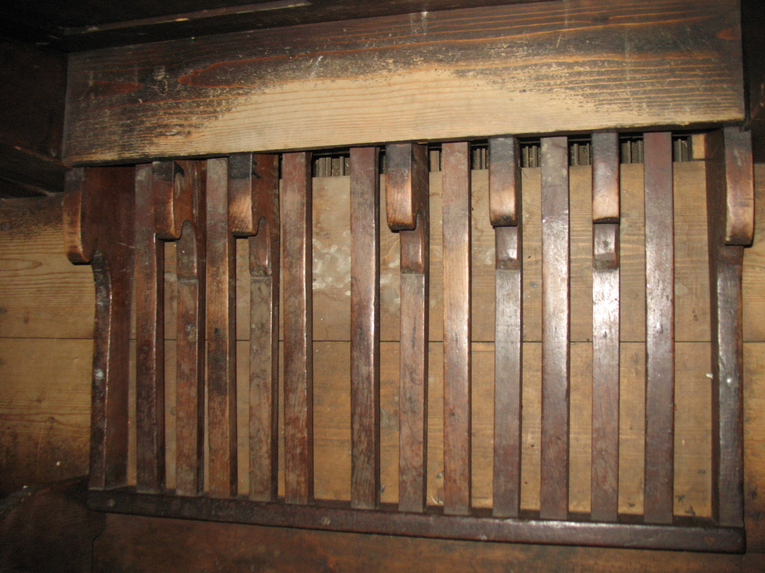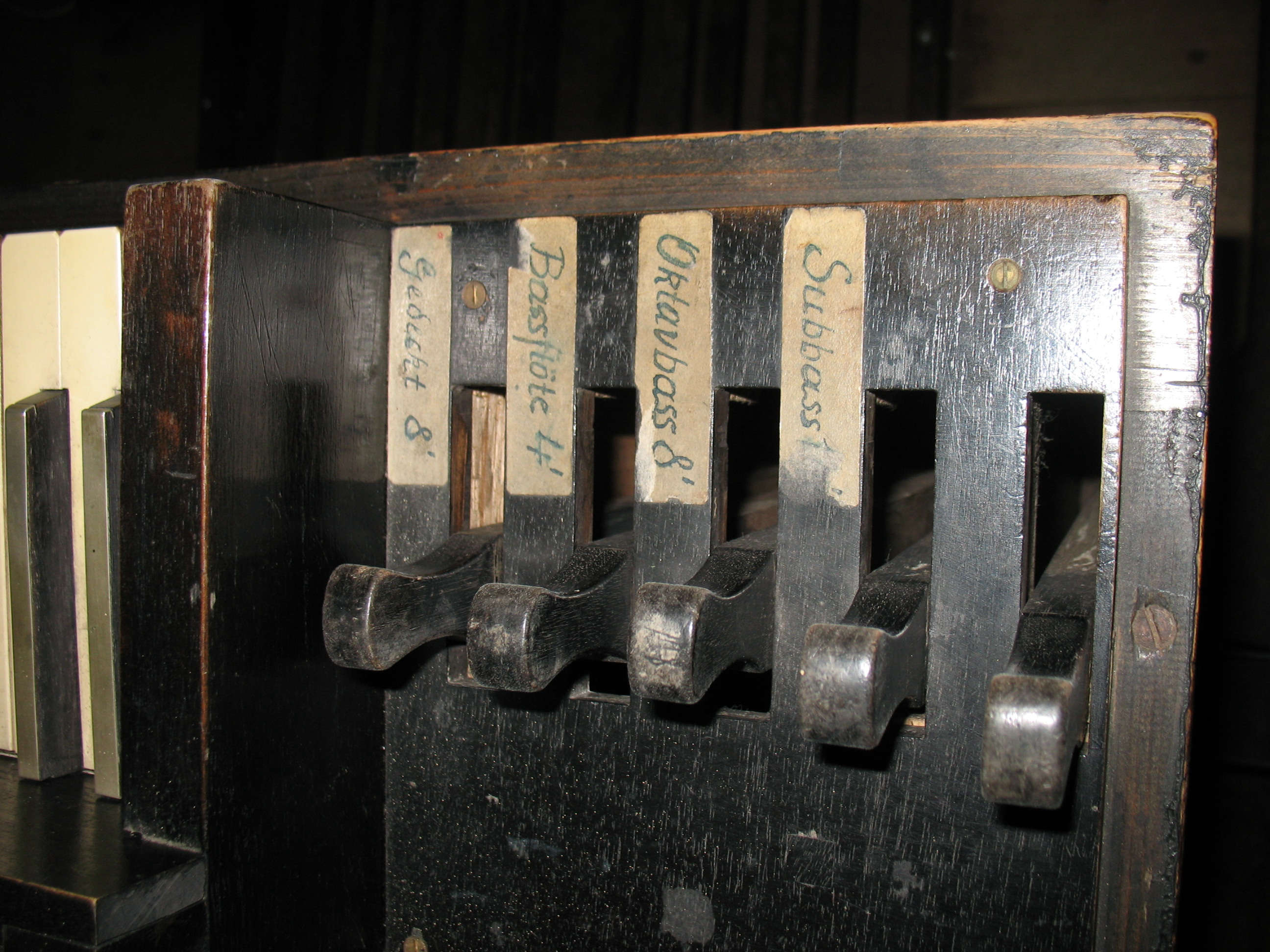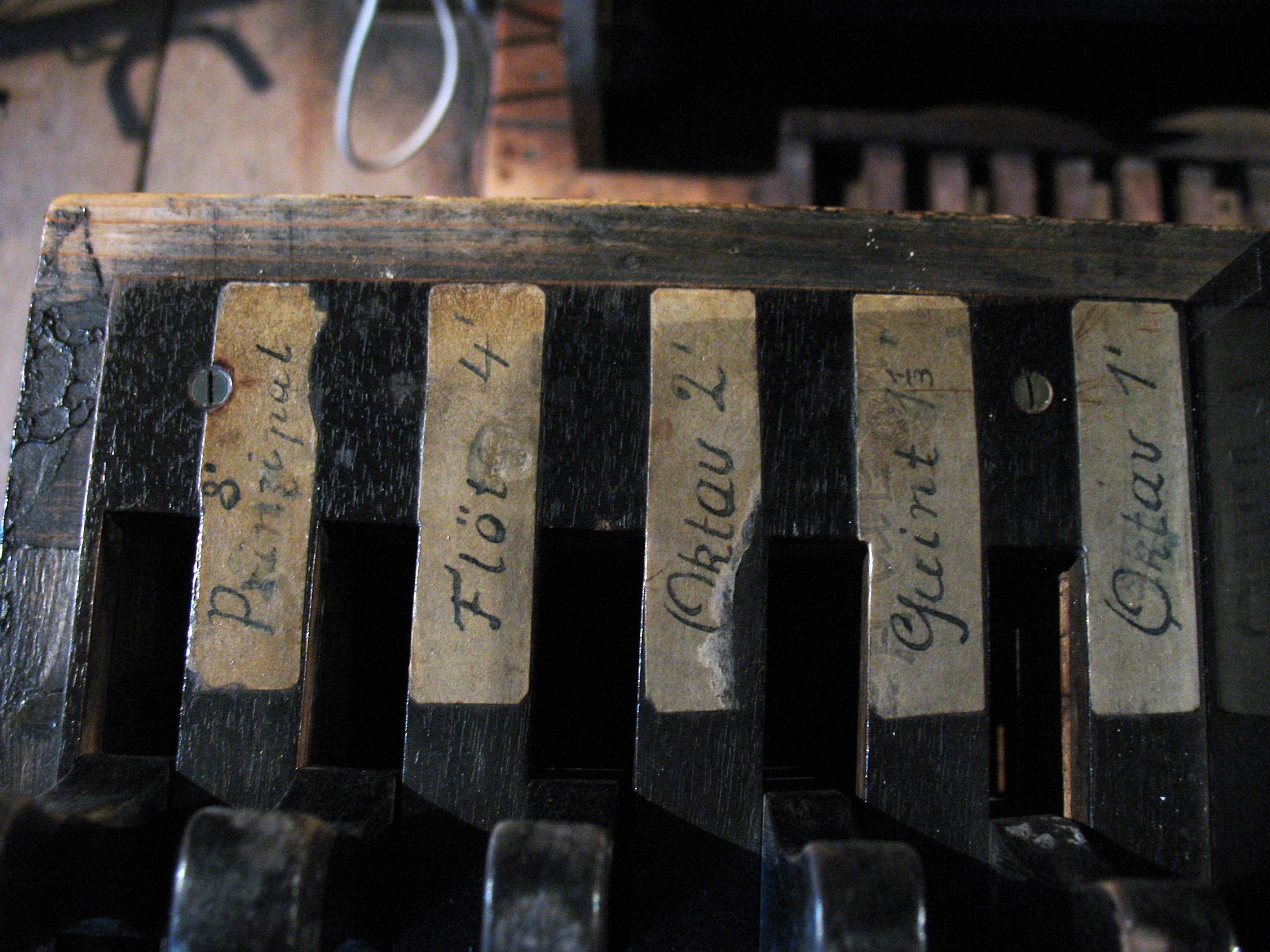 Die Registerhebel sind in einer waagrechten Linie rechts und links der Klaviatur angebracht. Sie sind einfache, aus einem dickeren Holzbrett ausgeschnittene Stangen (an einen Messergriff erinnernd). Die Registerbezeichnungen sind mit schwarzer Tinte auf Papierzetteln geschrieben.