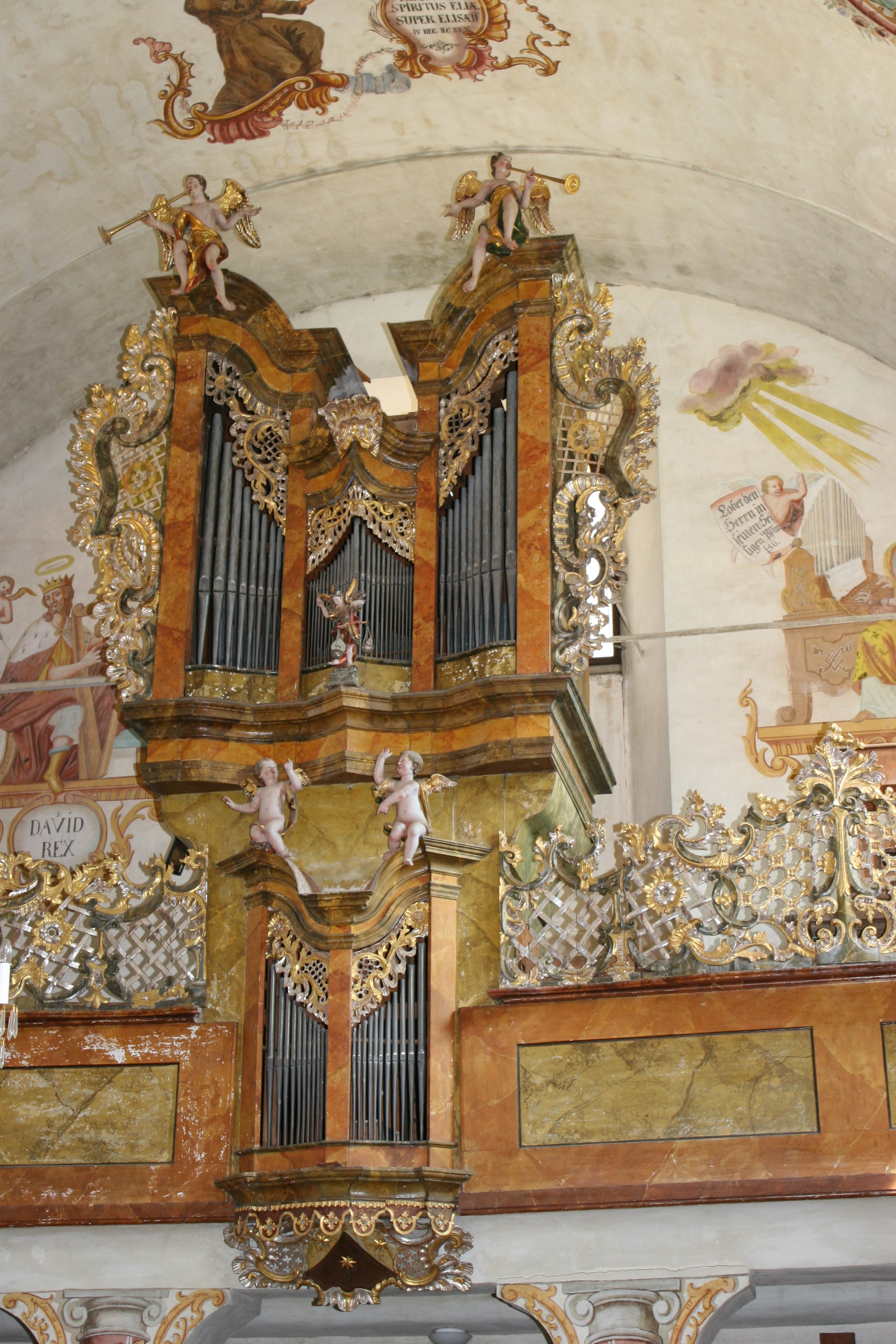 Oberteil: Vier Wandstreifen gliedern den Prospekt in drei Felder 9/27/9. Die Pfeifen des Mittelfeldes treten spitz hervor, die der Seitenteile treten etwas zurück (von außen nach innen). Die Felder besitzen geschnitzte, vergoldete und versilberte Schleierbretter: Rokokoornamentik (mit Gitter) in durchbrochener Arbeit. Das Gebälk der Pfeifentürme erhebt sich bogenförmig nach außen, das des niederen Mittelteils erhebt sich giebelförmig. Auf ihm befindet sich eine vergoldete Applikation mit Rokokoornamentik. Auf den Pfeifentürmen "sitzt" jeweils ein Engel, der eine gerade Trompete "bläst". Der Oberteil besitzt geschnitzte, vergoldete und versilberte Ohren: C-Schwünge in Rokokoornamentik (mit Flammen und Gitter). Vor dem Mittelfeld steht eine Engelsfigur, die eine Waage in der linken Hand hält (Erzengel Michael als Seelenwäger).