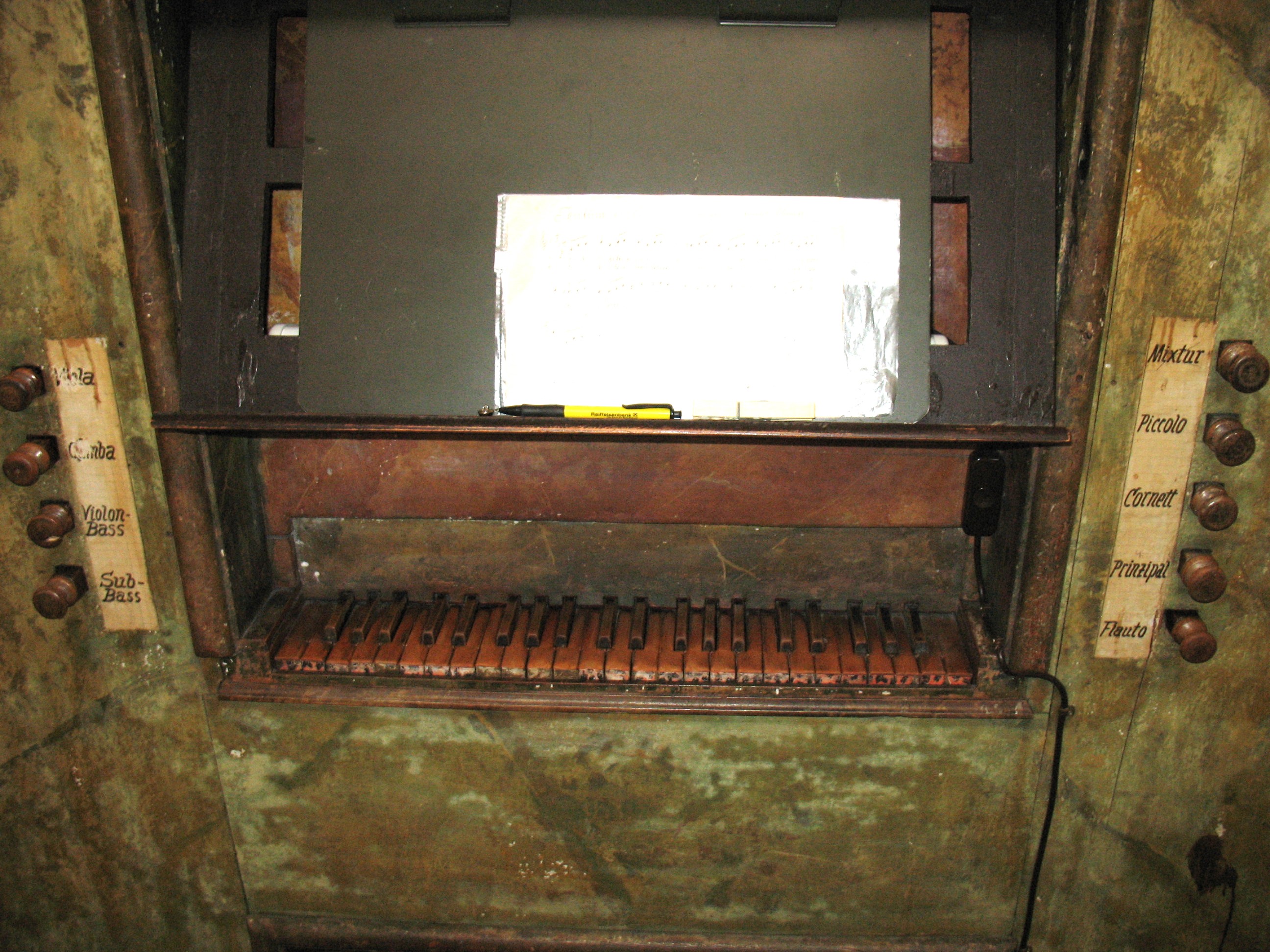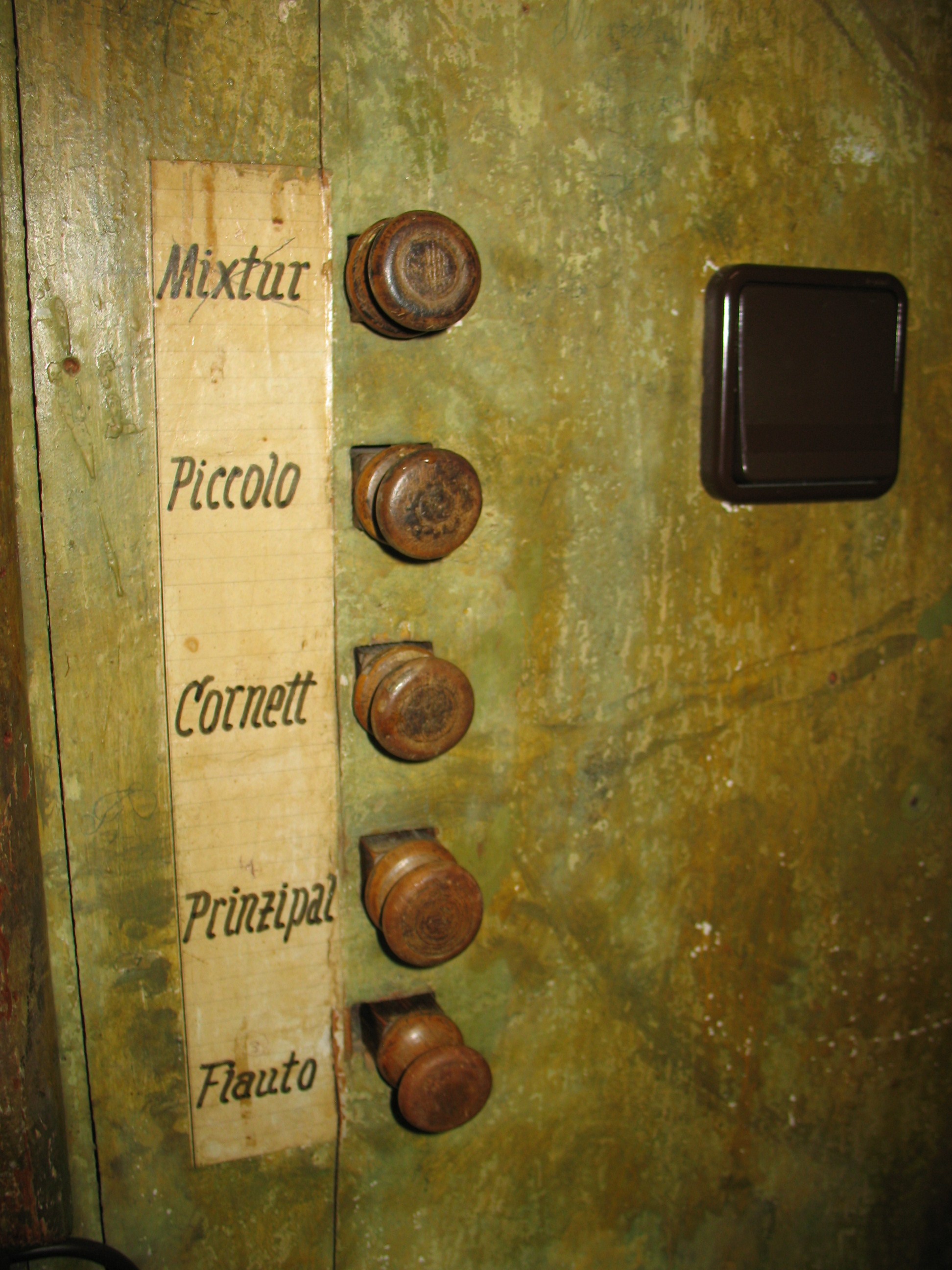 rechts: Mixtur 1 1/3', Piccolo 2', Cornett 2 2/3', Prinzipal 4', Flauto 4'