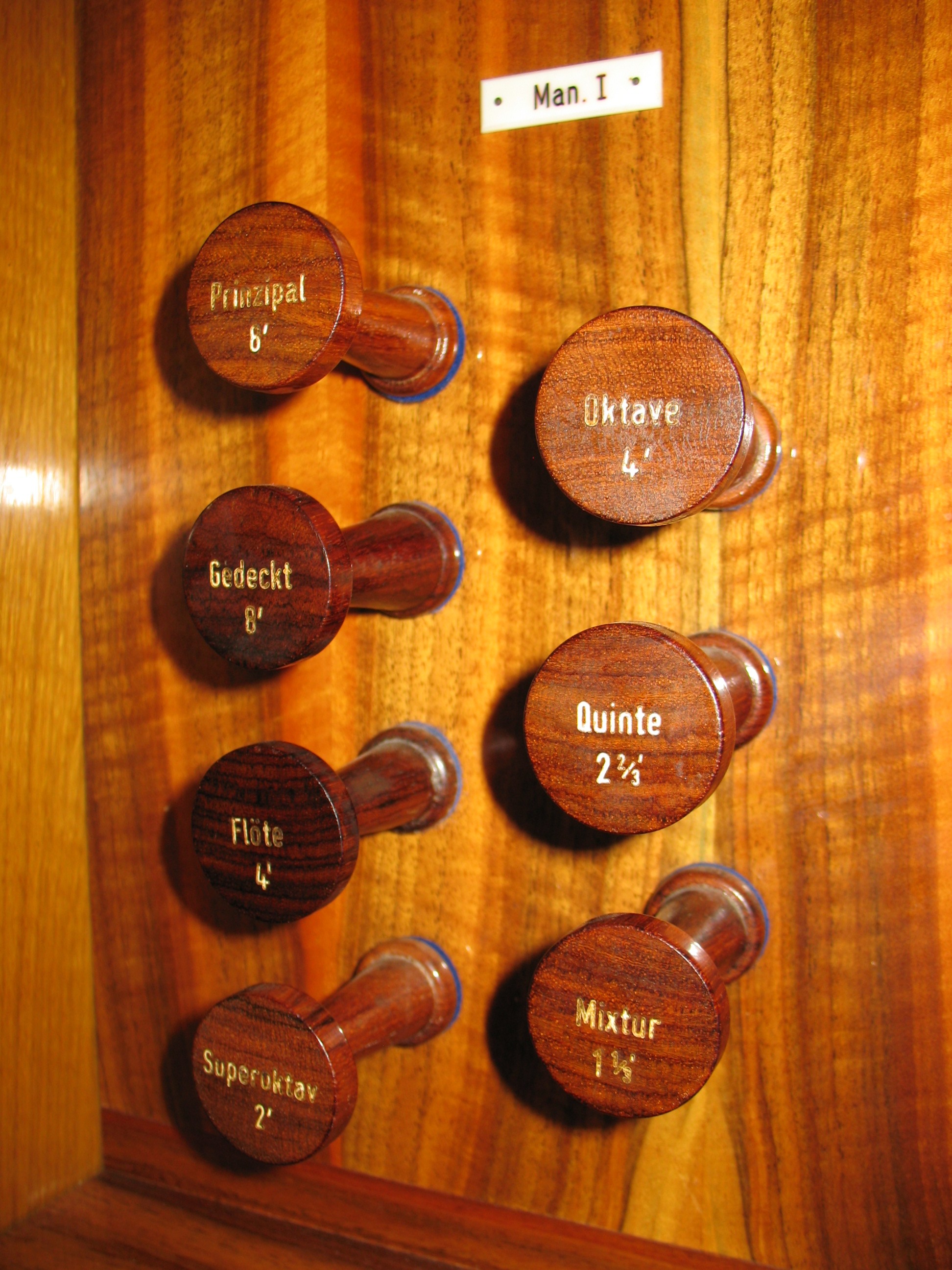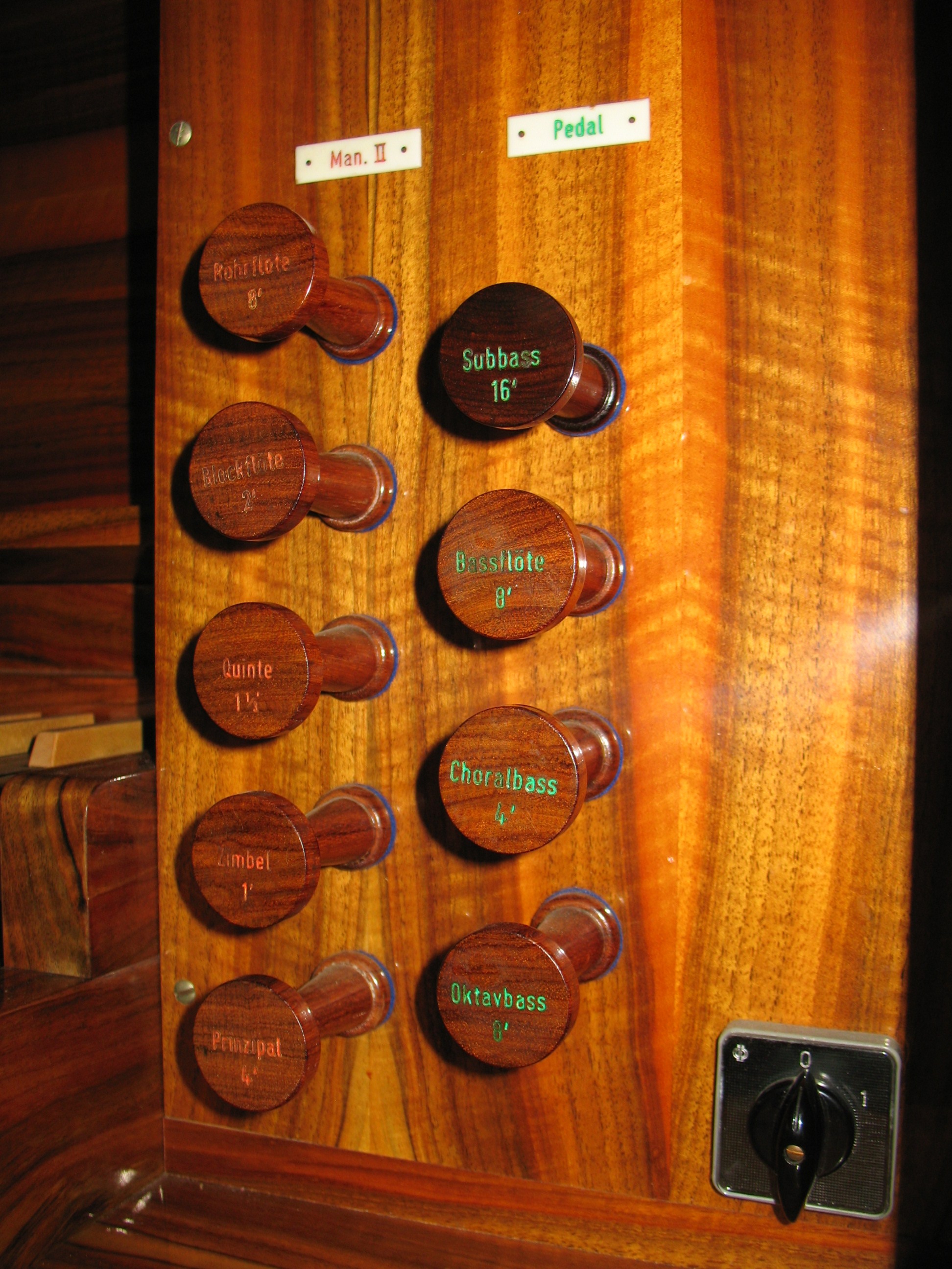 links: Prinzipal 8', Gedeckt 8', oktav 4' Flöte 4', Quint 2 2/3', Superoktav 2',