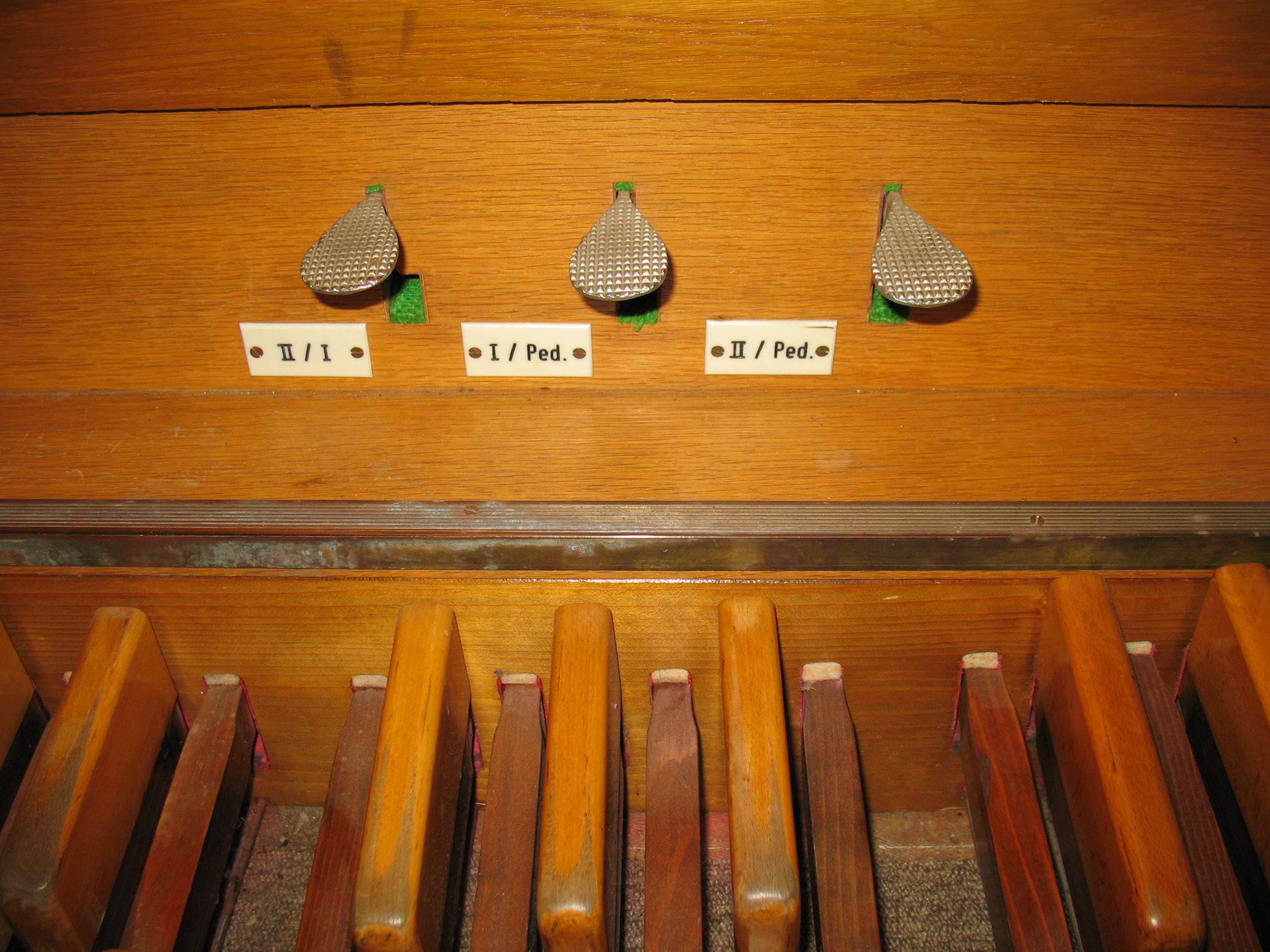 | Spielhilfen | Die Koppeln sind als Tritte über der Pedalklaviatur ausgeführt |
