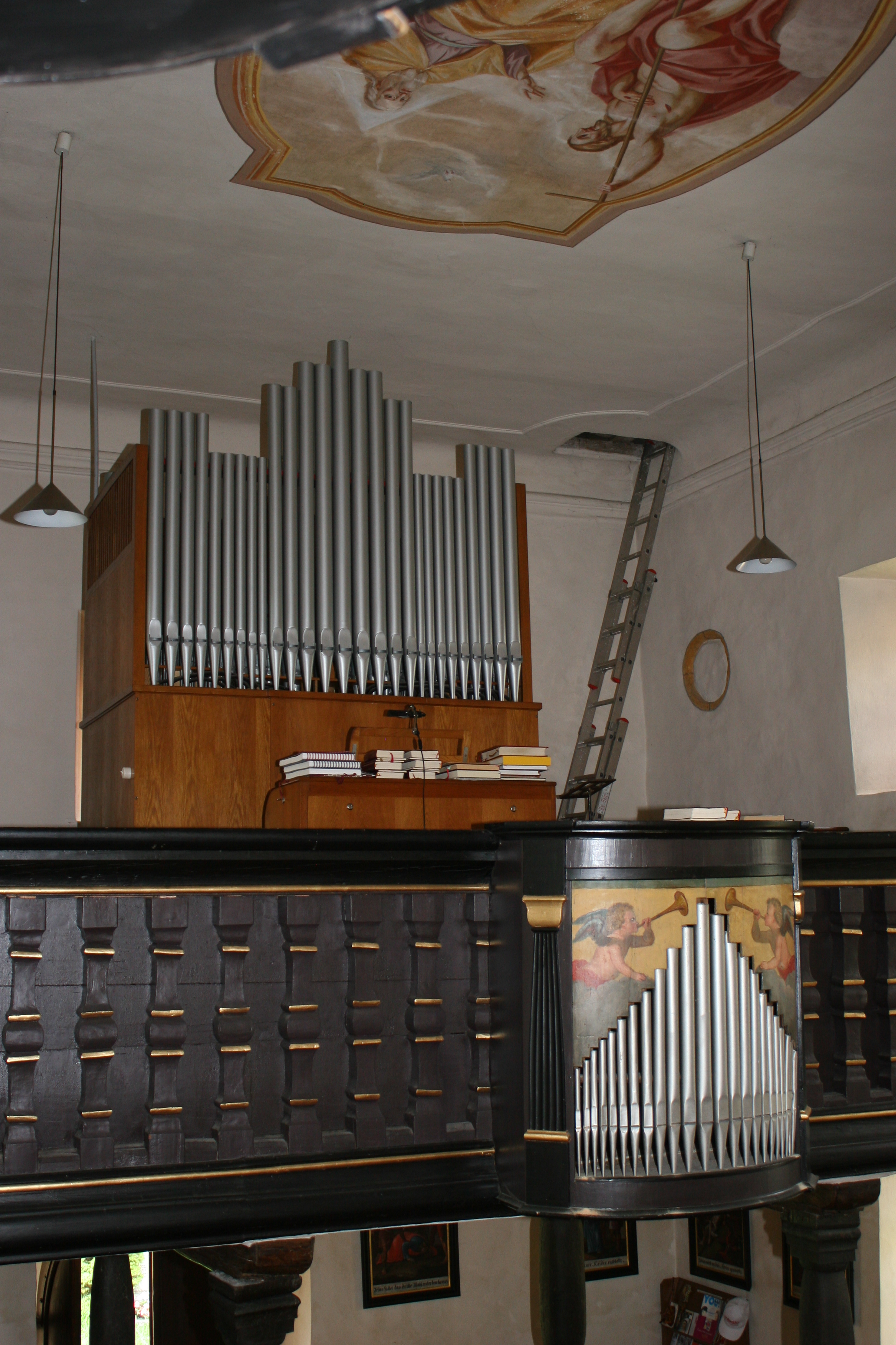 In die Emporenbrüstung ist ein Rückpositiv einer nicht mehr vorhandenen Orgel eingelassen. Der Prospekt ragt leicht bogenförmig in den Raum. Zwei Pilaster (kannelierter Schaft, vergoldetes Korbkapitell) begrenzen ein Pfeifenfeld (23 Pfeifen). Die Schleierbretter sind als "Bretter" ausgeführt, auf denen je ein Engel mit gerader ventilloser Trompete gemalt ist. Die Bemalung stammt von Adam Brandstätter.
