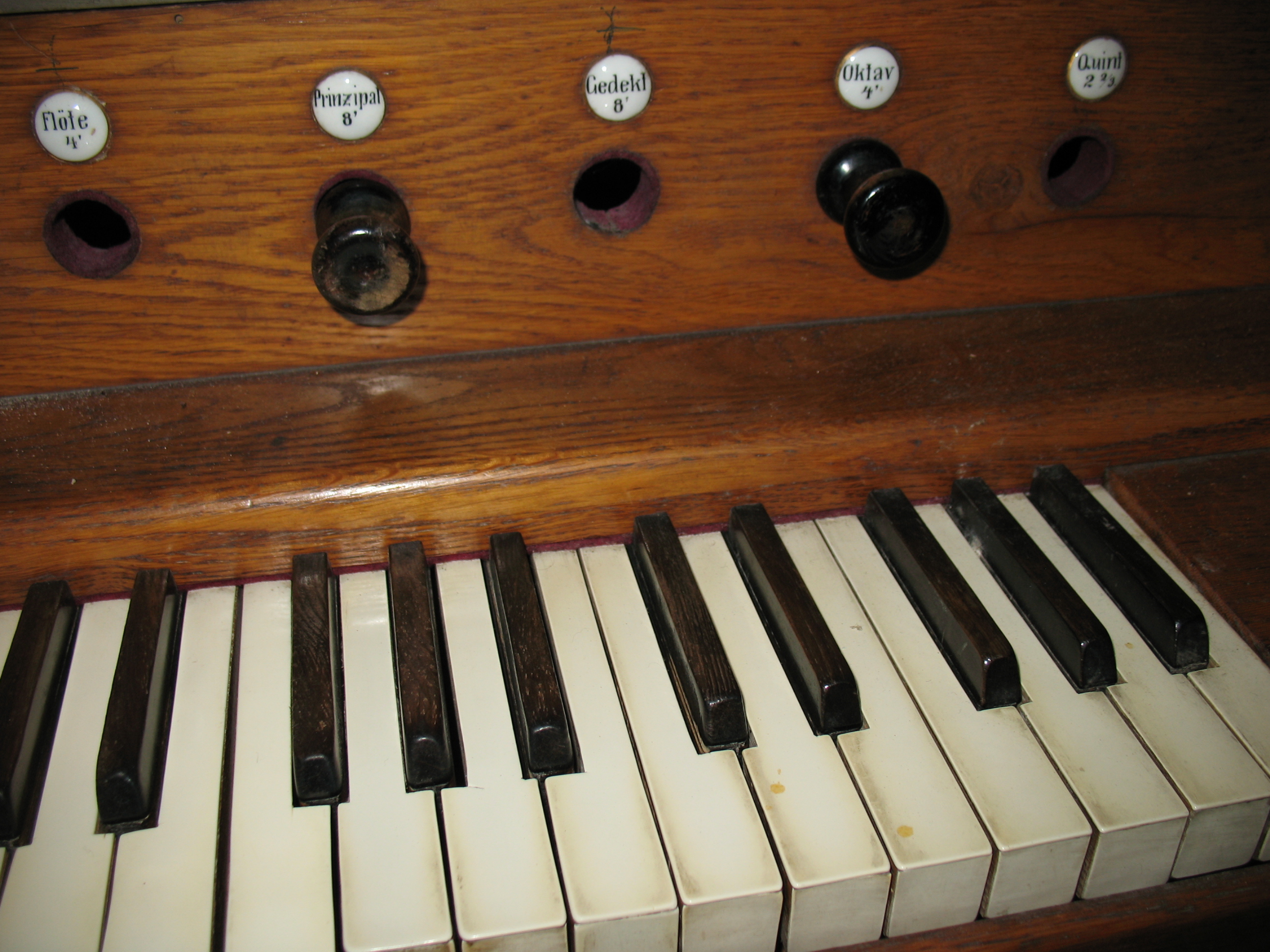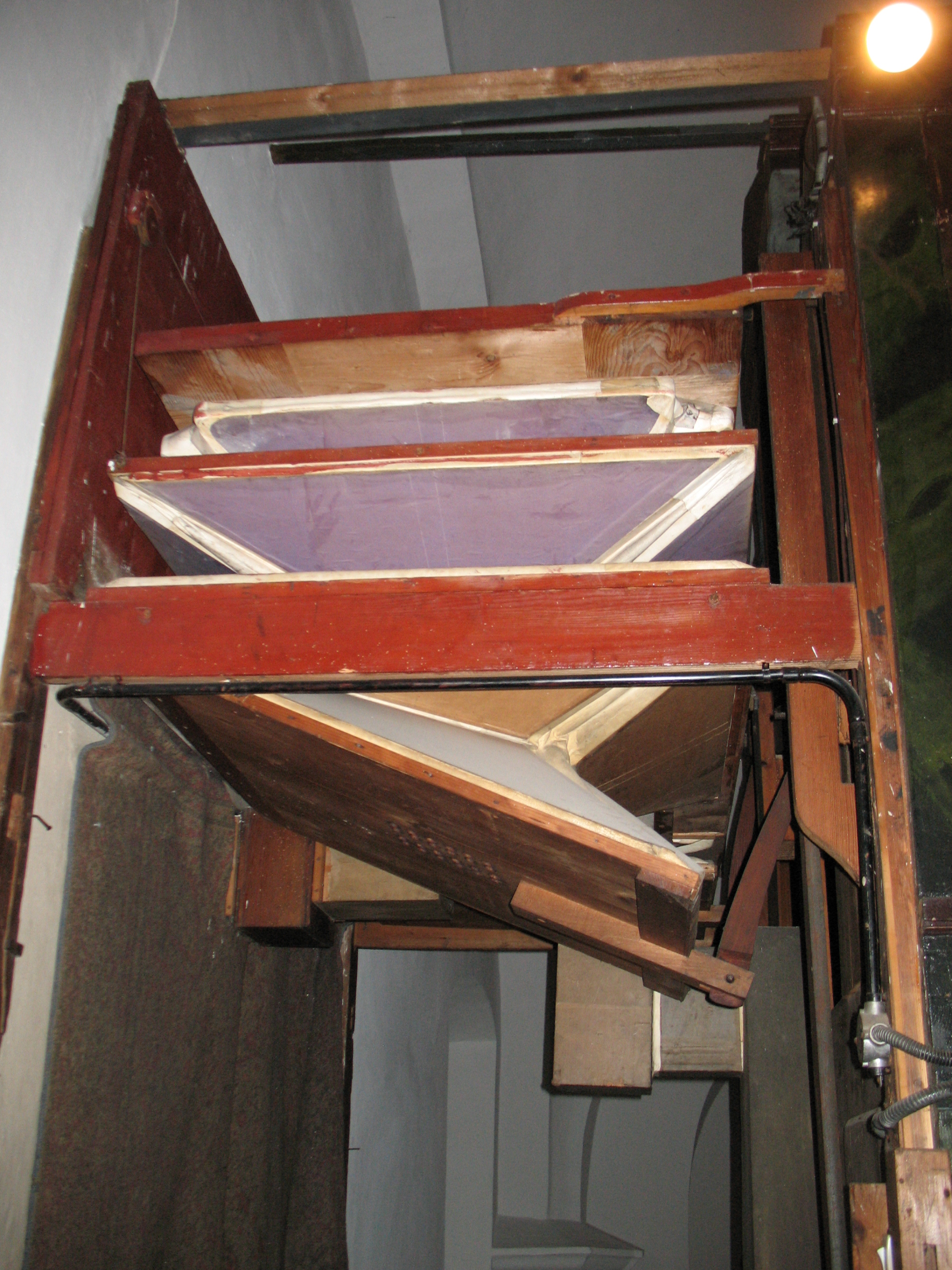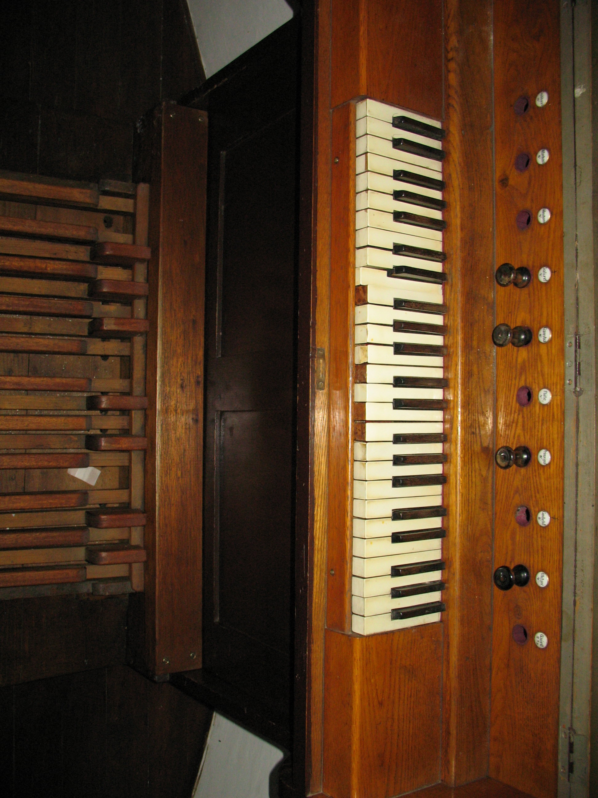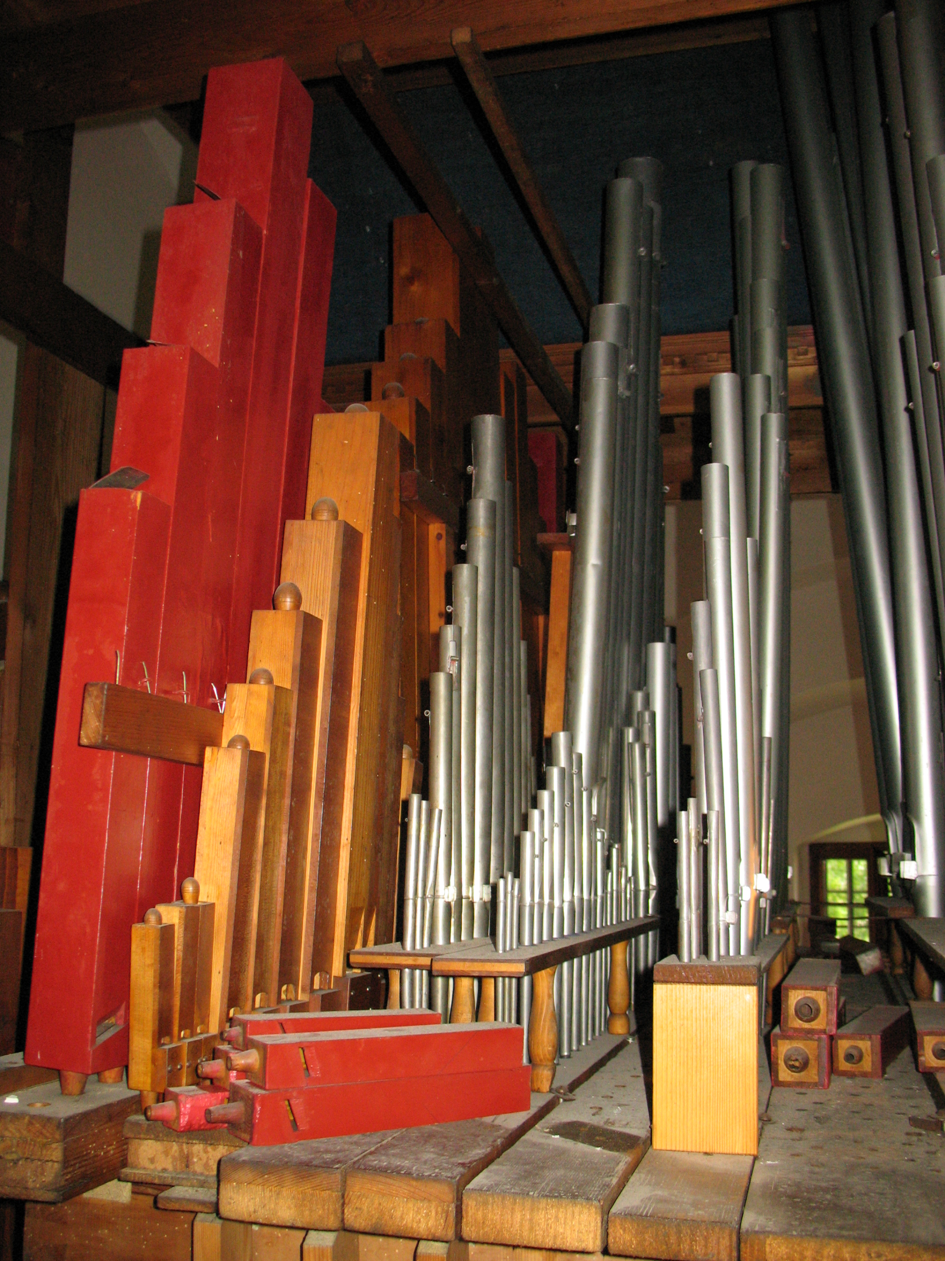 Traktur ist mechanisch; Tonkanzellenschleiflade; auf vier Schleifen stehen keine Pfeifen.
