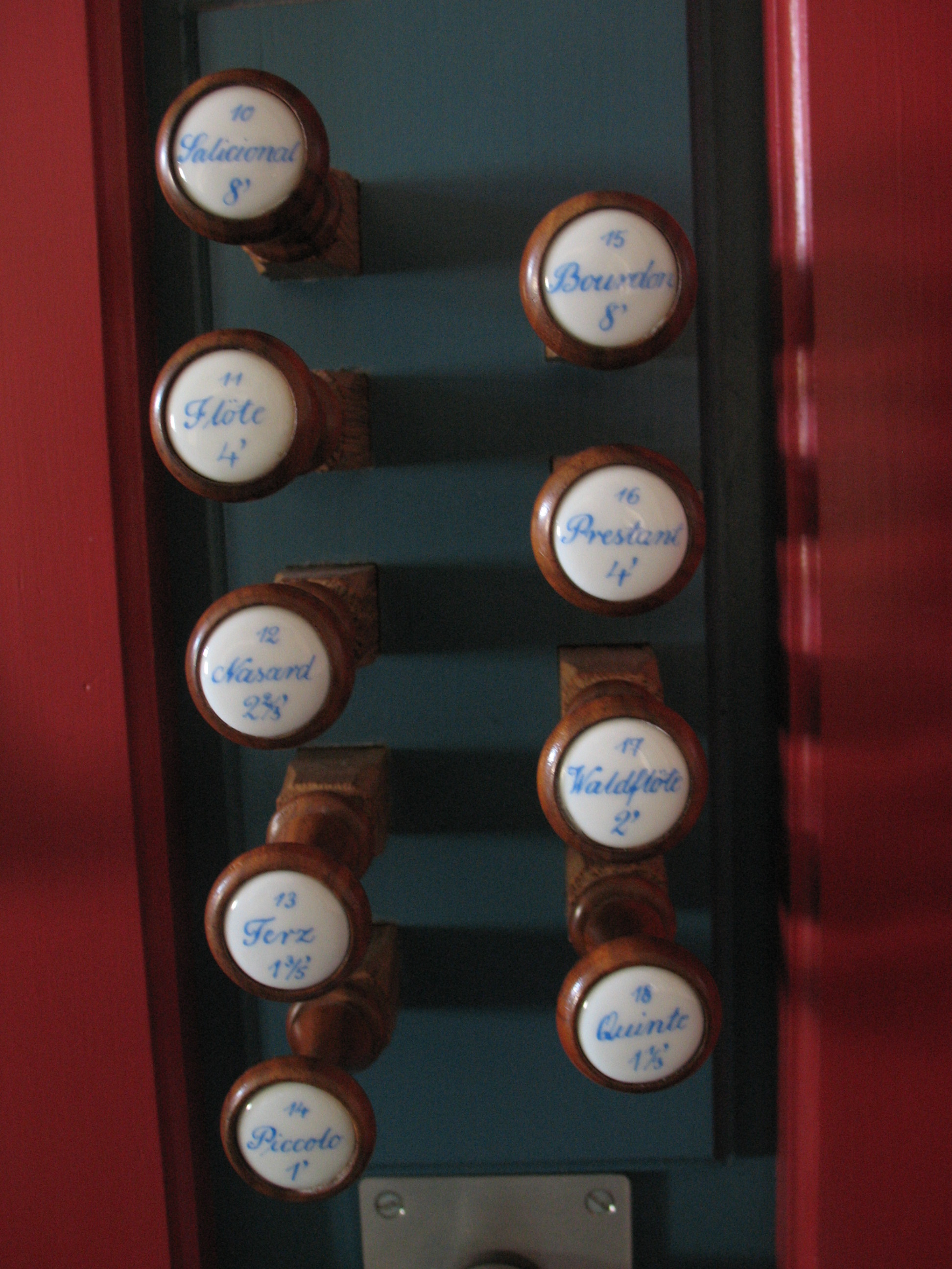 Die Registerzüge (schwarz) sind in einer Reihe über der Klaviatur angebracht. Die Registerschilder (längliche Plättchen) liegen darüber.