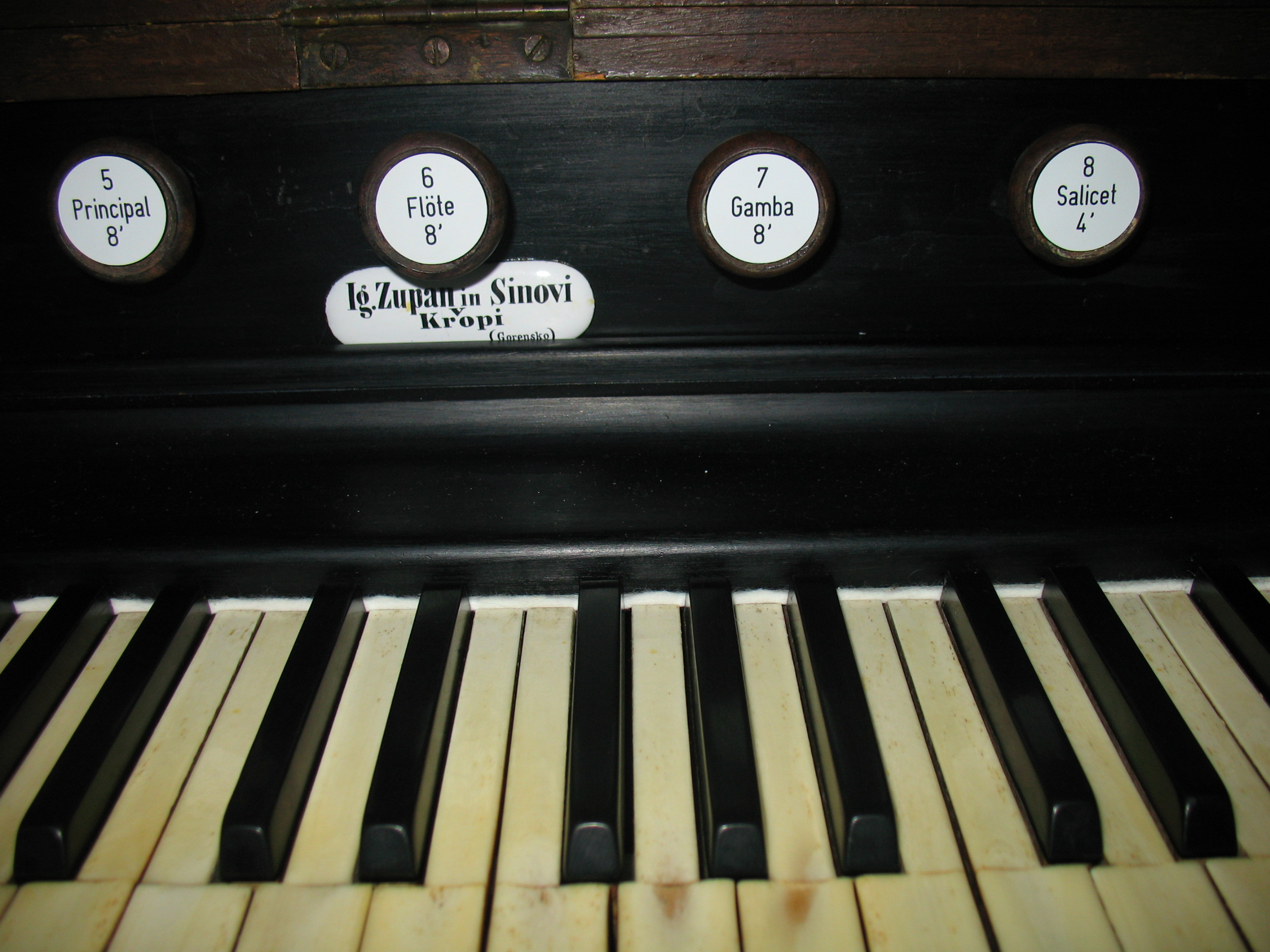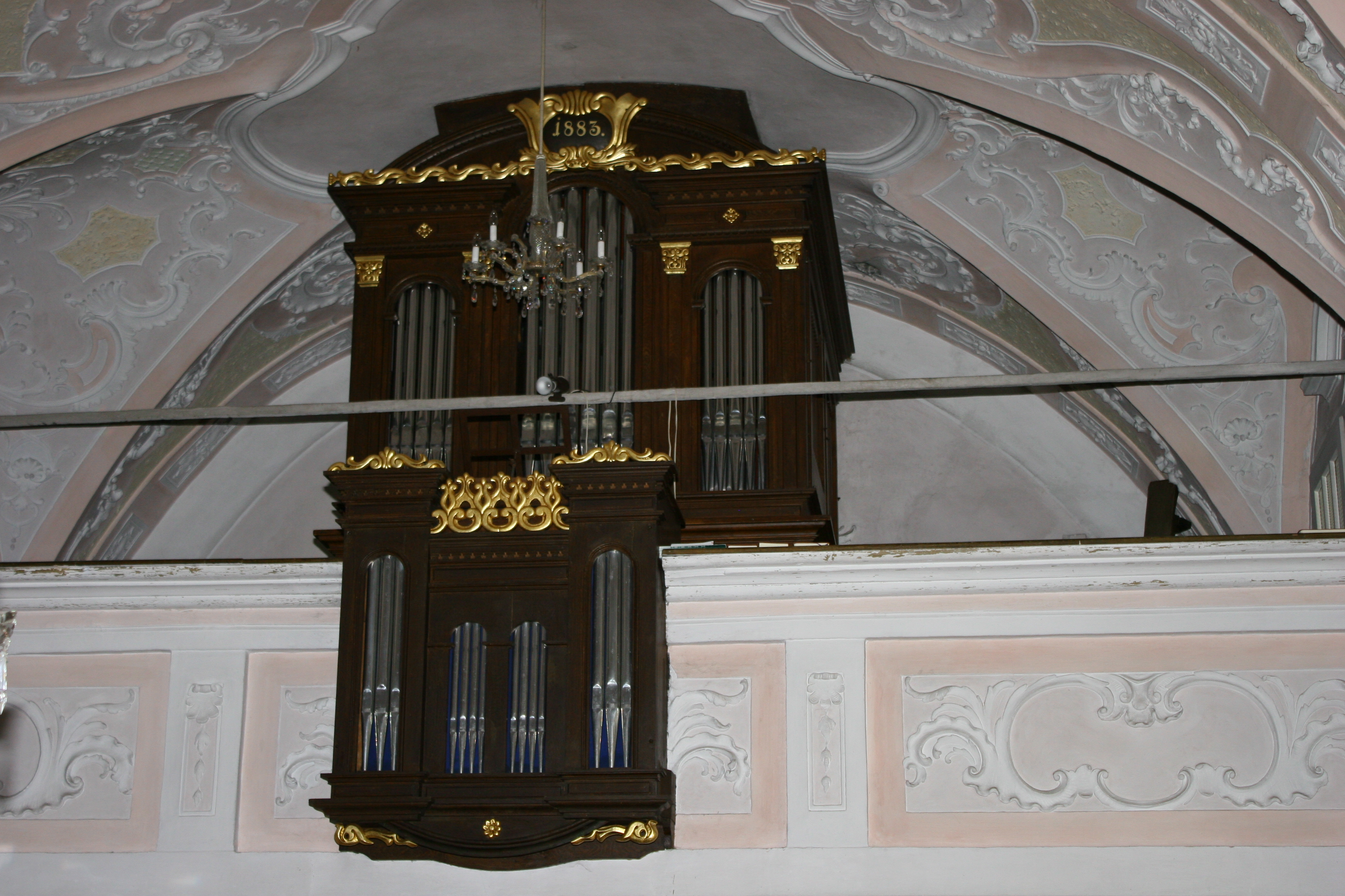 Die Orgel wurde im Jahre 1883 von Ignaz Zupan erbaut. Über dem mittleren Pfeifenfeld befindet sich die Jahreszahl "1883". Über der Klaviatur ist ein längliches Emailschild angebracht, auf dem: "Ig. Zupan in Sinovi" steht (schwarze Lettern auf weissem Grund).