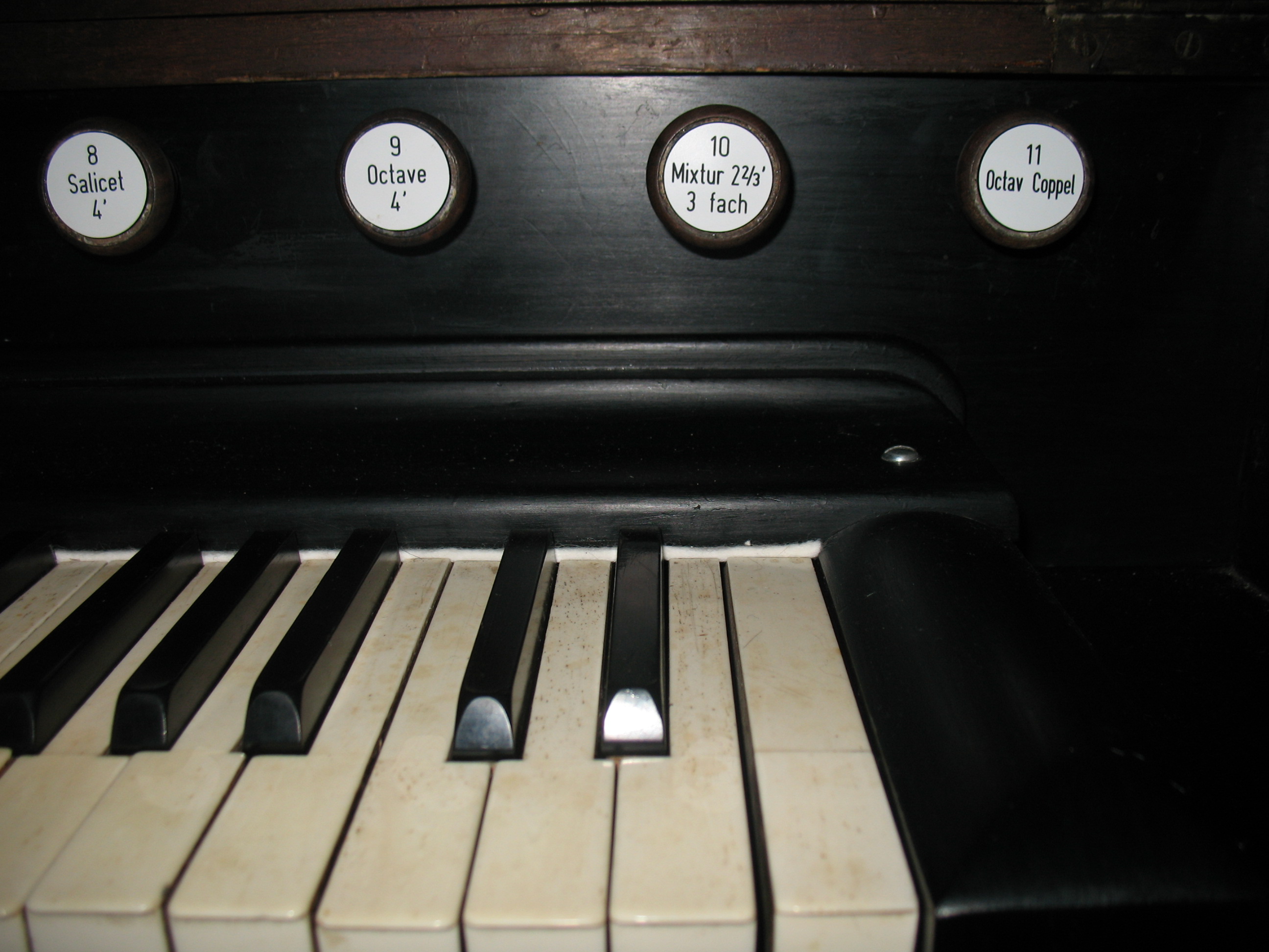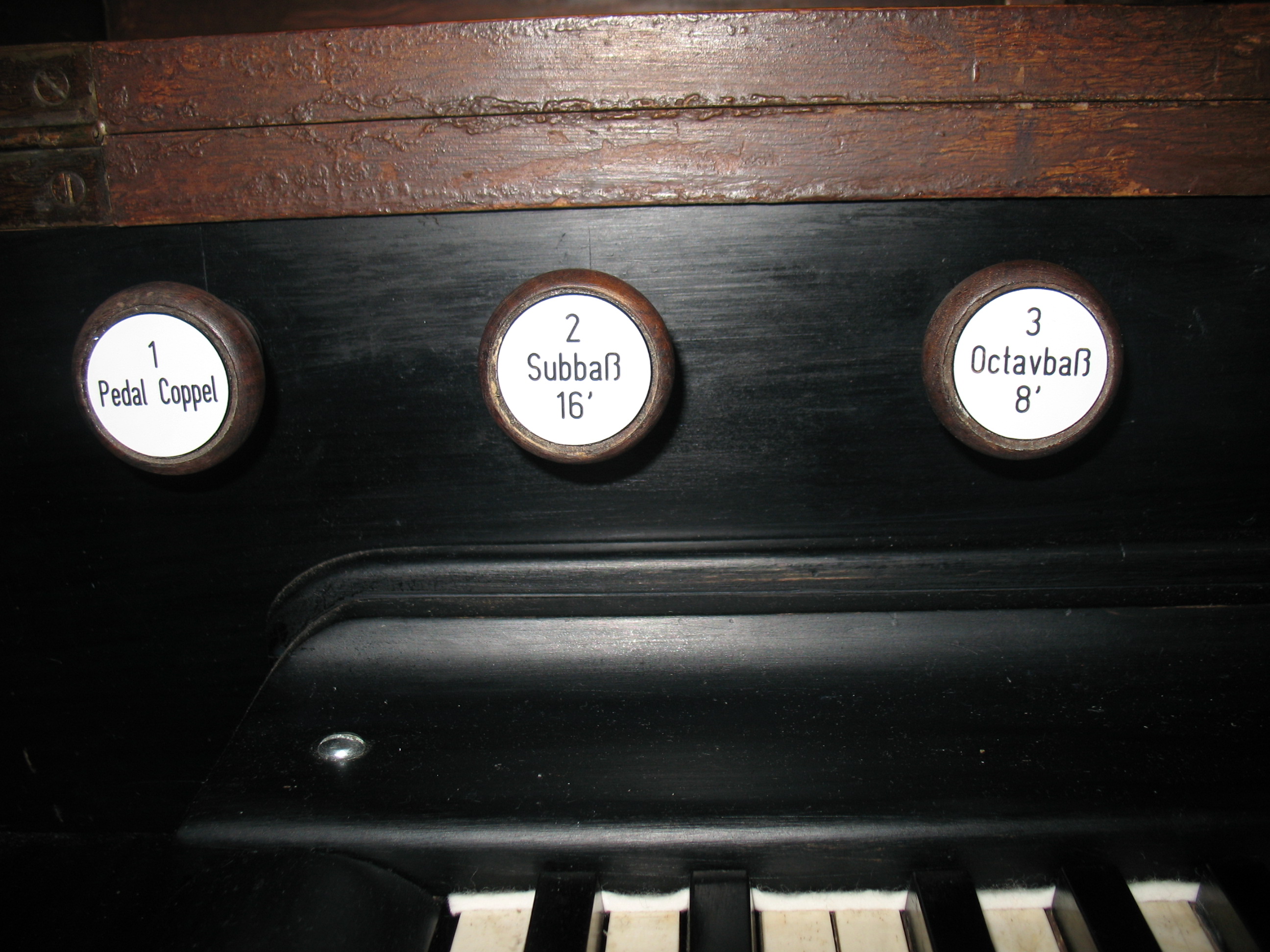 Die Registerzüge sind über der Klaviatur angebracht. Sie haben an den Stirnflächen runde Porzellanscheibchen, auf denen die Registerbezeichnung steht.