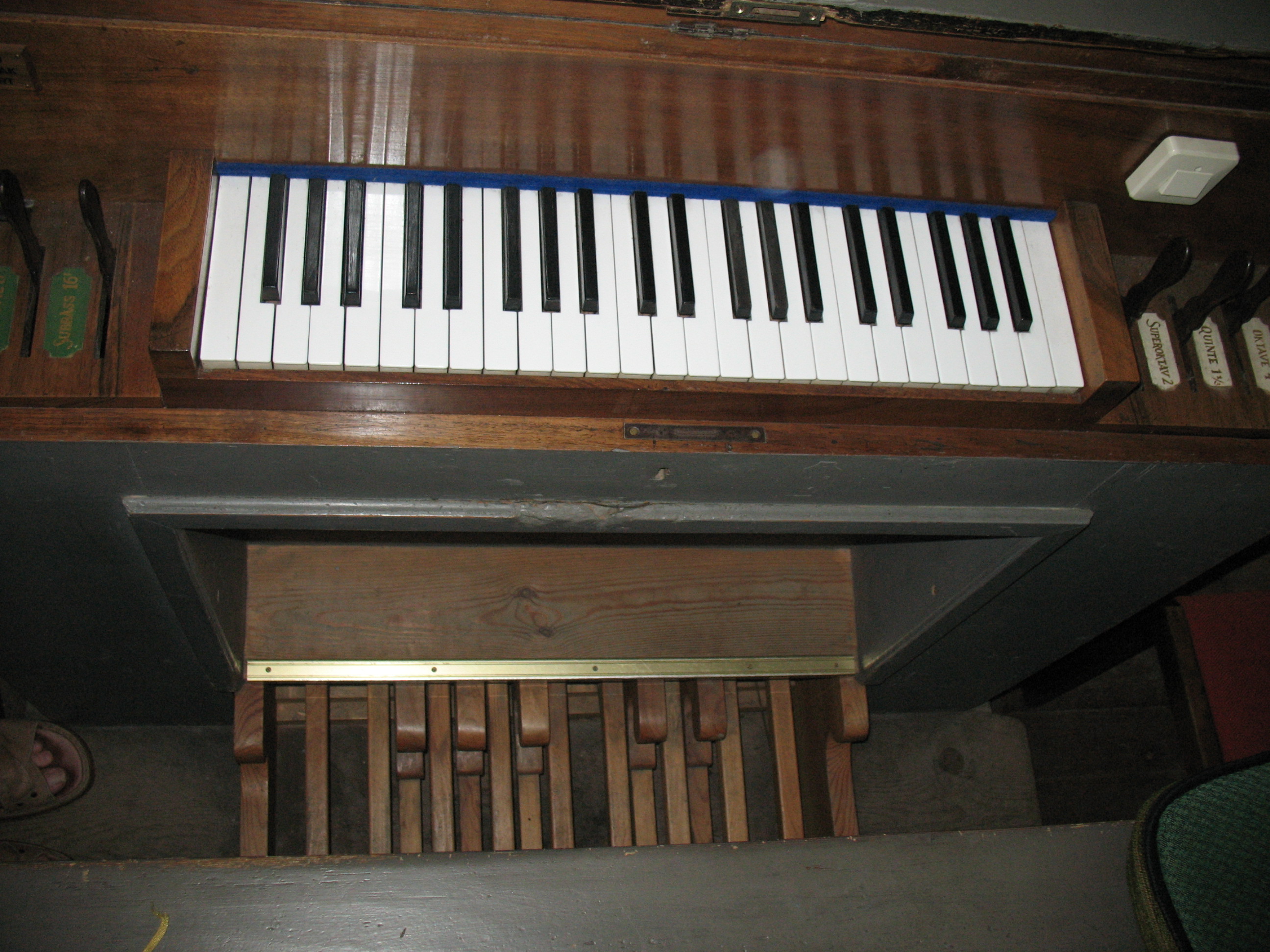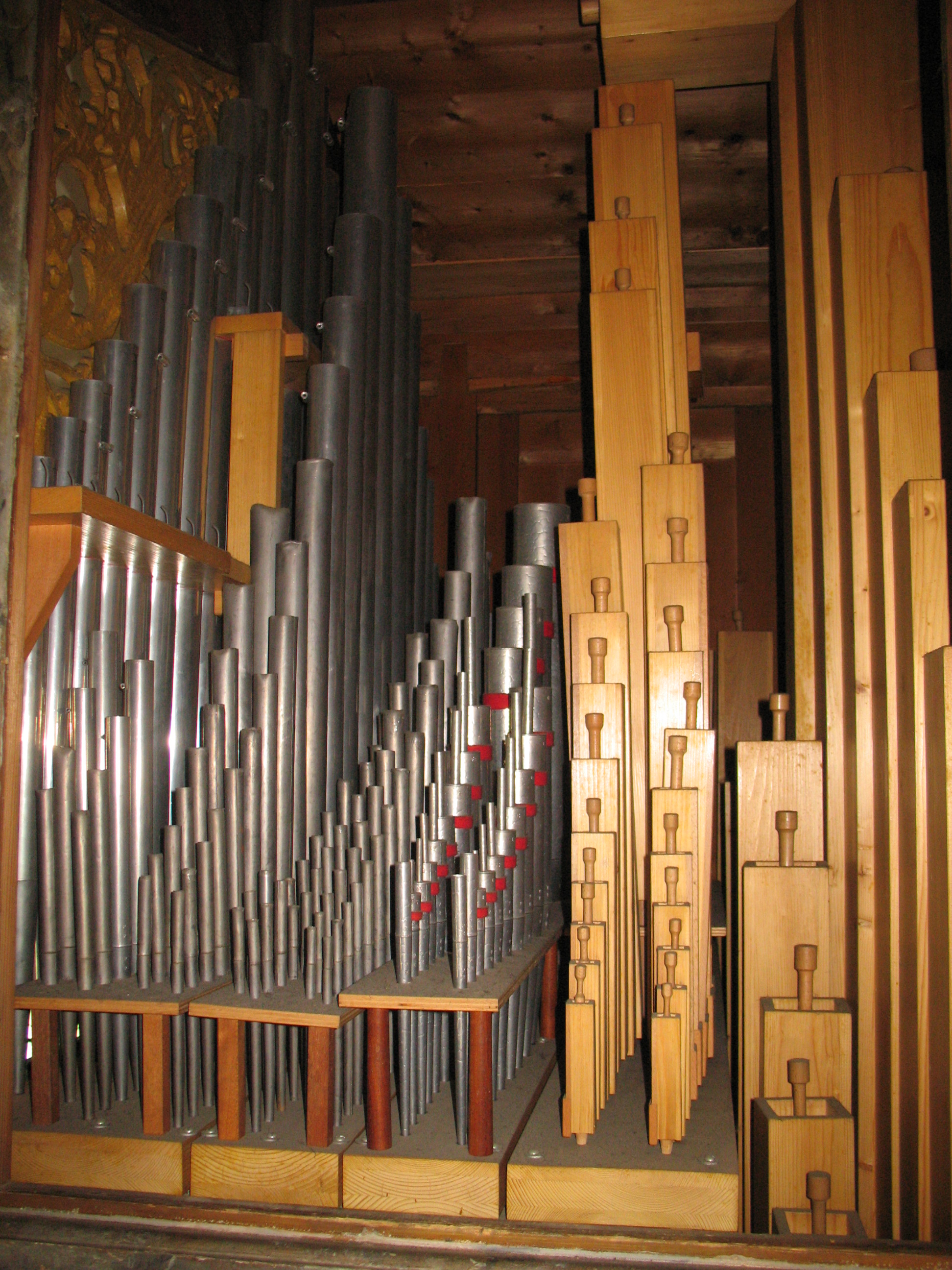 Der Spieltisch steht vor der Orgel an der Emporenbrüstung.