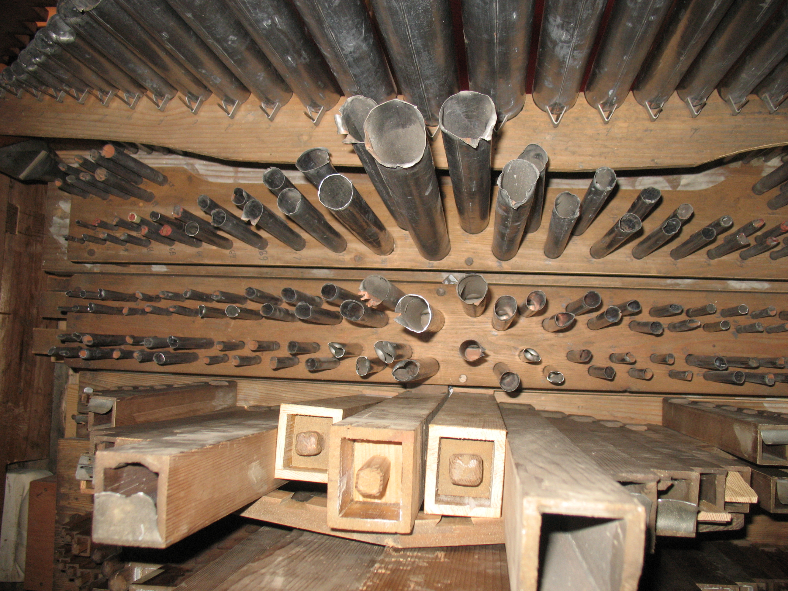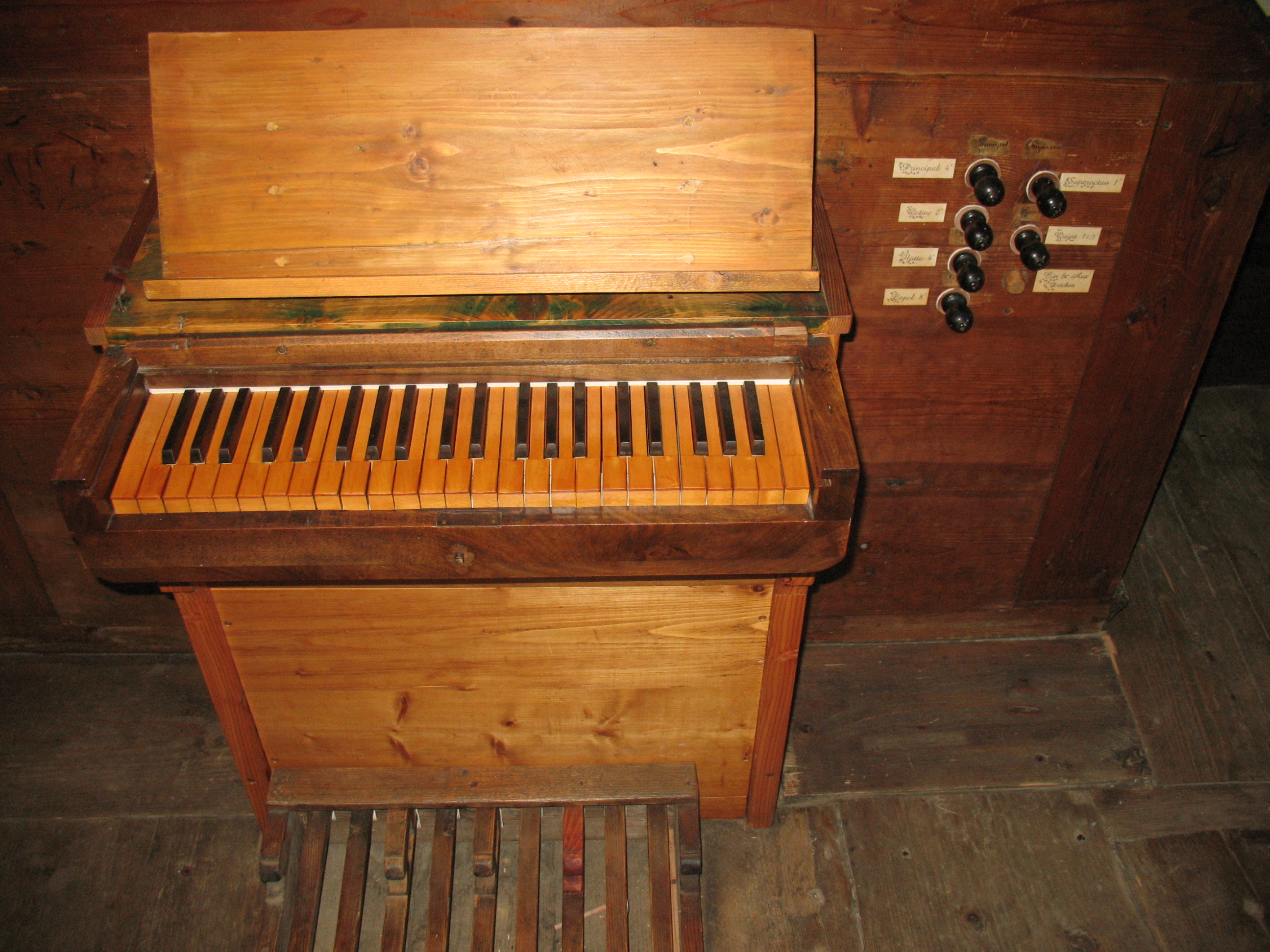Der Spieltisch ist an der Rückwand des Gehäuses angebracht (der Organist sieht über das Gehäuse zum Altar).