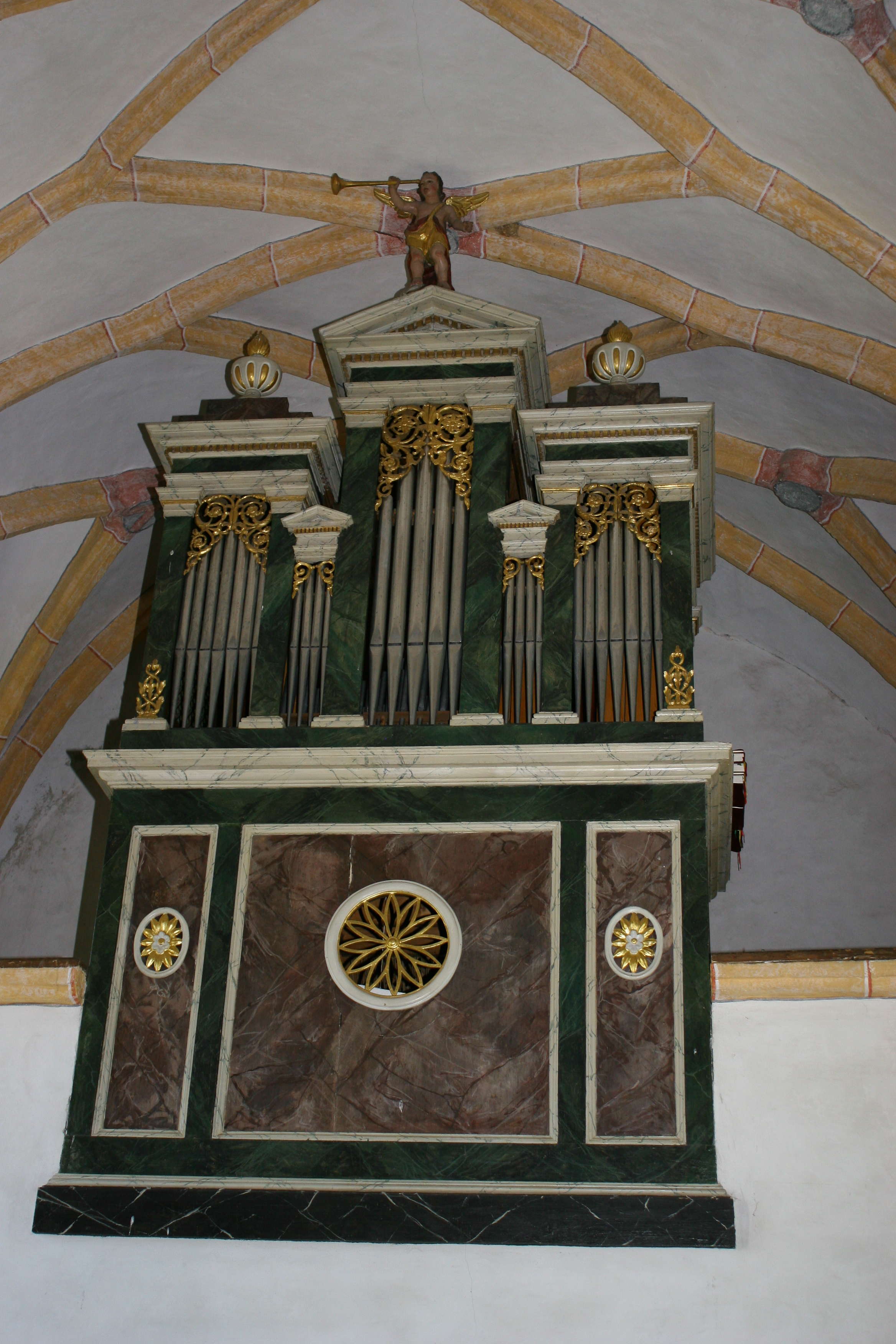 Das klassizistische Gehäuse ist schieferfarben marmoriert. Es besteht aus drei Pfeifentürmen, zwischen denen sich noch zwei Felder befinden. Sechs Pilaster (Basis und Kapitell weiss-grau marmoriert) gliedern den Prospekt in fünf Felder 7/4/5/4/7. Alle Felder besitzen geschnitzte, vergoldete Schleierbretter: Blumen- und Rankenmotivik in durchbrochener Arbeit. Das Gebälk des Mittelfeldes (weiss-grau marmoreirt) besteht aus einem Zahnschnittfried´s) bekrönt wird. Auf dem Giebel steht eine Engelsfigur, die in der rechtsn Hand eine gerade ventillose Trompete hält. Das Gebälk der Zwischenfelder (weiss-grau marmoriert) ist leicht profiliert. Unter dem aufgesetzten Dreiecksgiebel (weiss-grau marmoriert) befindet sich ein Zahnschnittfries. Das Gebälk der Außentürme ist gleich wie das des Mittelturmes gestaltet. Darüber befindet sich je eine weiße Vase mit Fuß, aus deren Mitte sich eine geschnitzte, vergoldete Flamme erhebt. Über der Basis der äußersten Pilaster ist je eine vergoldete Schnitzerei appliziert. Ein ausladendes stark profiliertes Gesims (grau-weiss marmoriert) teilt das Gehäuse in Ober- und Unterteil. Der Unterteil ist bis zur Hälfte in die Emporenbrüstung eingebaut. Seine Prospektseite ist als großer Rahmen (mit zwei Querbalken) mit drei Füllungen gestaltet. Zwischen den Rahmenteilen und den Füllungen sind weiss-grau marmorierte, gekehlte Leisten angebracht. In der Mitte der mittleren großen Füllung befindet sich eine Rosette, von deren Mittelpunkt vergoldete blattähnliche Gebilde in radialer Anordnung ausgehen. In die Mitte der Seitenfüllungen ist je ein elliptischer Rahmen (weiss), der ein blumenähnliches Gebilde mit vergoldeten Blütenblättern umschließt, eingelassen.