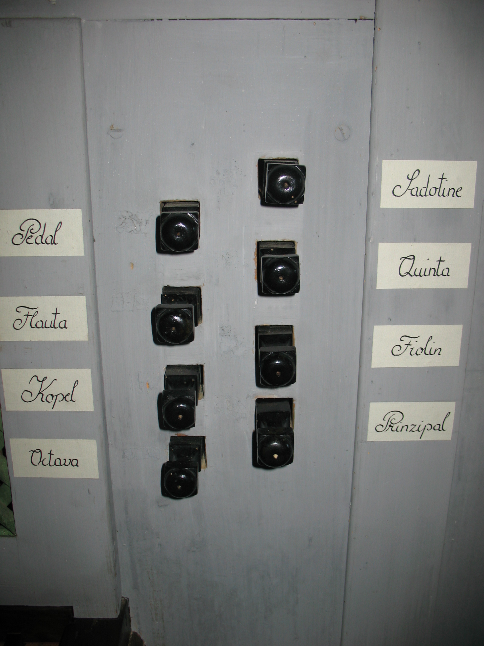 Die Registerzüge ragen rechts der Klaviatur aus der Gehäusewand. Sie sind quadratische Stangen mit geschnitzten Knöpfen. Neben den Zügen befinden sich zweierlei Registerschilder: a) längliche Kartonschilder, auf die die Registerbezeichnungen geschrieben ist (20. Jhdt.), b) längliche Papierschilder, auf denen die Registerbezeichnung steht (19. Jhdt.).