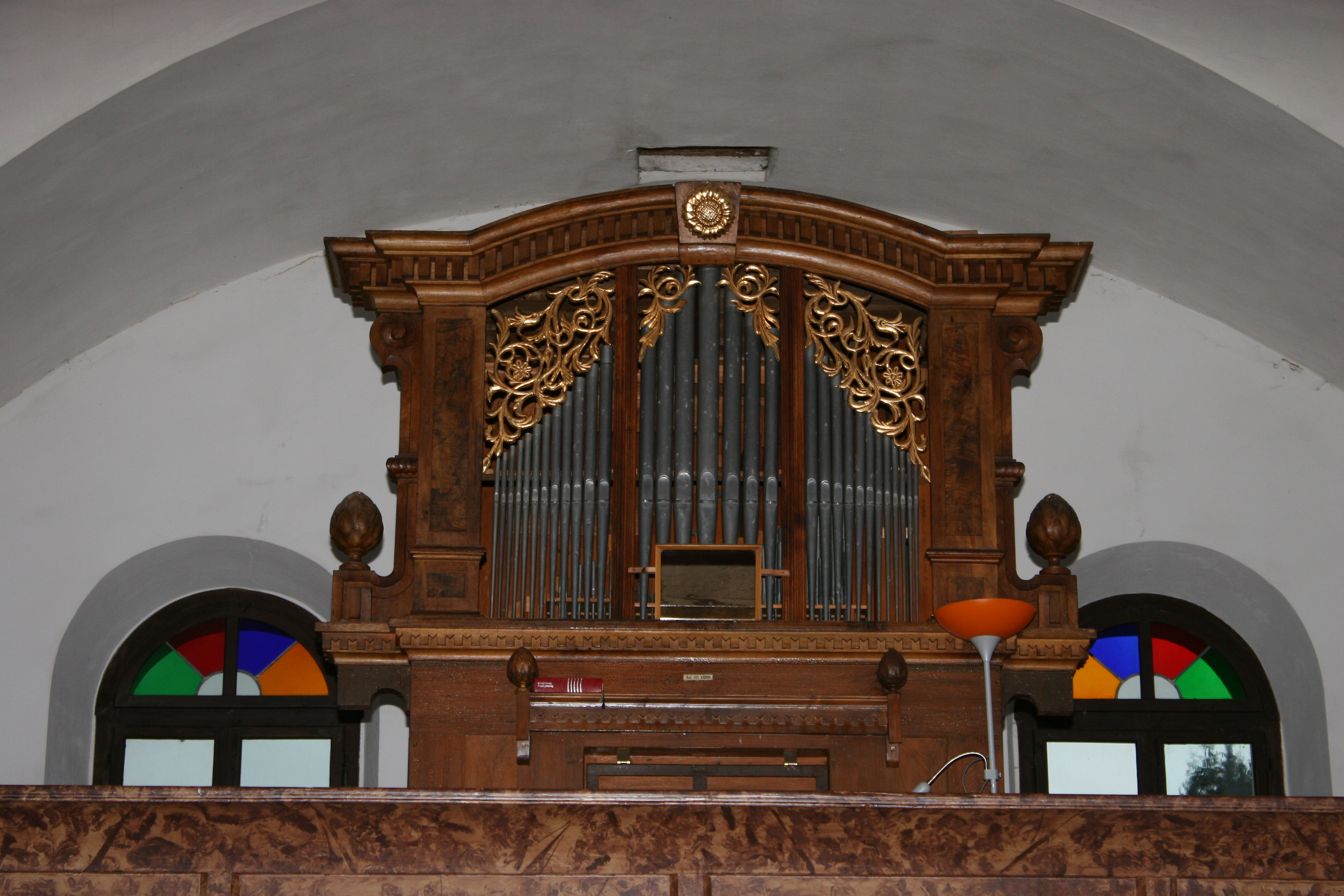 Ein Zinnenfries gliedert das braun gebeizte Gehäuse in Ober- und Unterteil. Zwei breitere (außen) und zwei schmale Wandstreifen teilen den Prospekt in drei Felder 12/7/12. Auf den beiden äußeren Wandstreifen befinden sich oben je ein längliches, Wurzelholz imitierendes Brettchen und unten je ein kleines, zwischen denen sich ein kleines profiliertes Gesims befindet. Den oberen Abschluß der drei Felder bildet das flachbogenförmige Gebälk (mit Zinnenfries). Am Bogen befindet sich eine Art Schlußstein, auf dem eine geschnitzte, vergoldete Blüte appliziert ist. Die Schleierbretter sind in durchbrochenem Rankenwerk, das in schmalen Blättern ausläuft, ausgeführt. Seitlich des Prospektes sind Ohren angebracht: auf einer Konsole, die das gehäusegliedernde Zinnenfries fortsetzt, befindet sich eine Art Volute, die in einer Volute endet, übergeht. Auf der unteren Volute ist ein geschnitzter Pinienzapfen angebracht. In der Mitte des geraden Teils befindet sich eine Art Schaftring mit senkrechten Kerben. An den Seitenwänden des Oberteils befindet sich je ein Rahmen, von dessen unterer Rahmenleiste (mitte) schmälere Holzleisten strahlenförmig ausgehen. Unter den Pfeifenfeldern befindet sich eine Füllung (Zugang zum Windkasten). An den Seitenwänden des Unterteils ist je ein Rahmen mit Füllung angebracht.