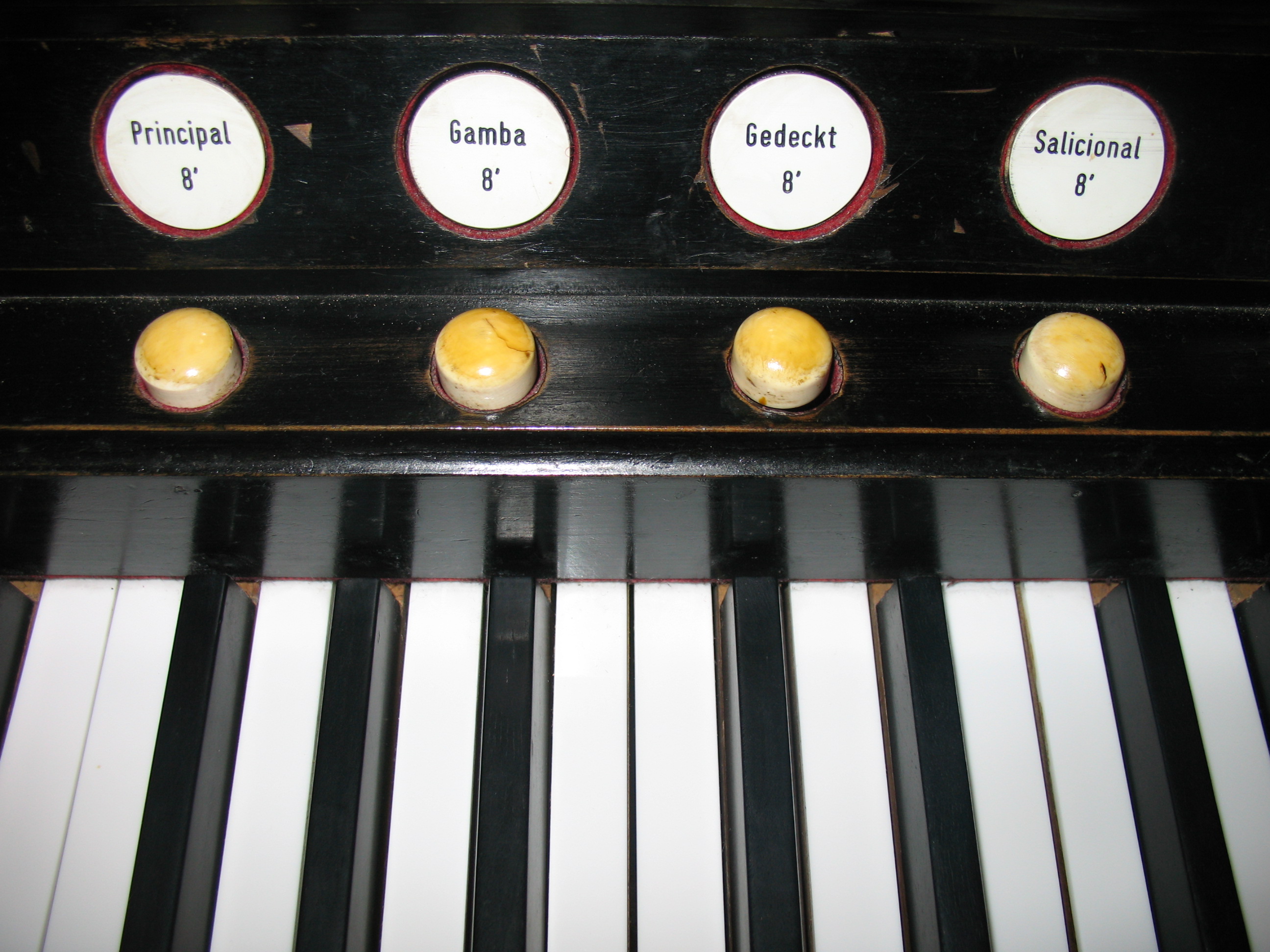 Die Registerknöpfe sind in einer Reihe über der Klaviatur angebracht. Die Registerbezeichnungen (auf Porzellanplättchen) liegen darüber.