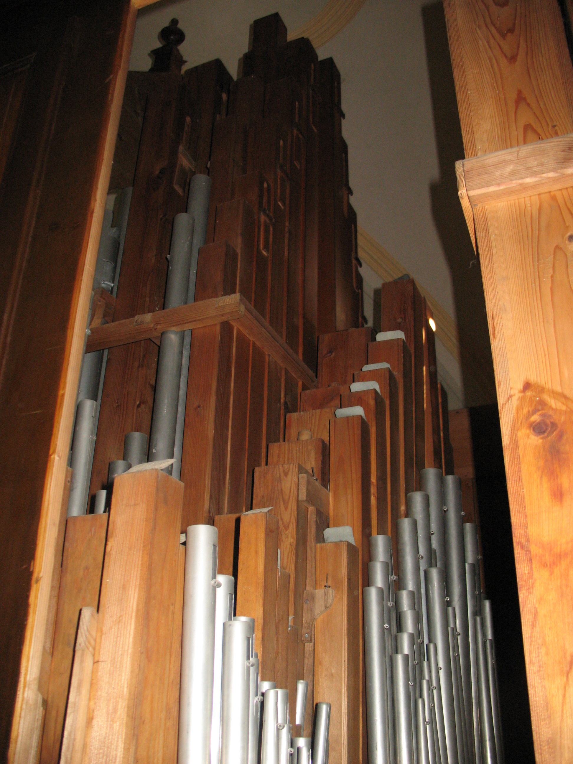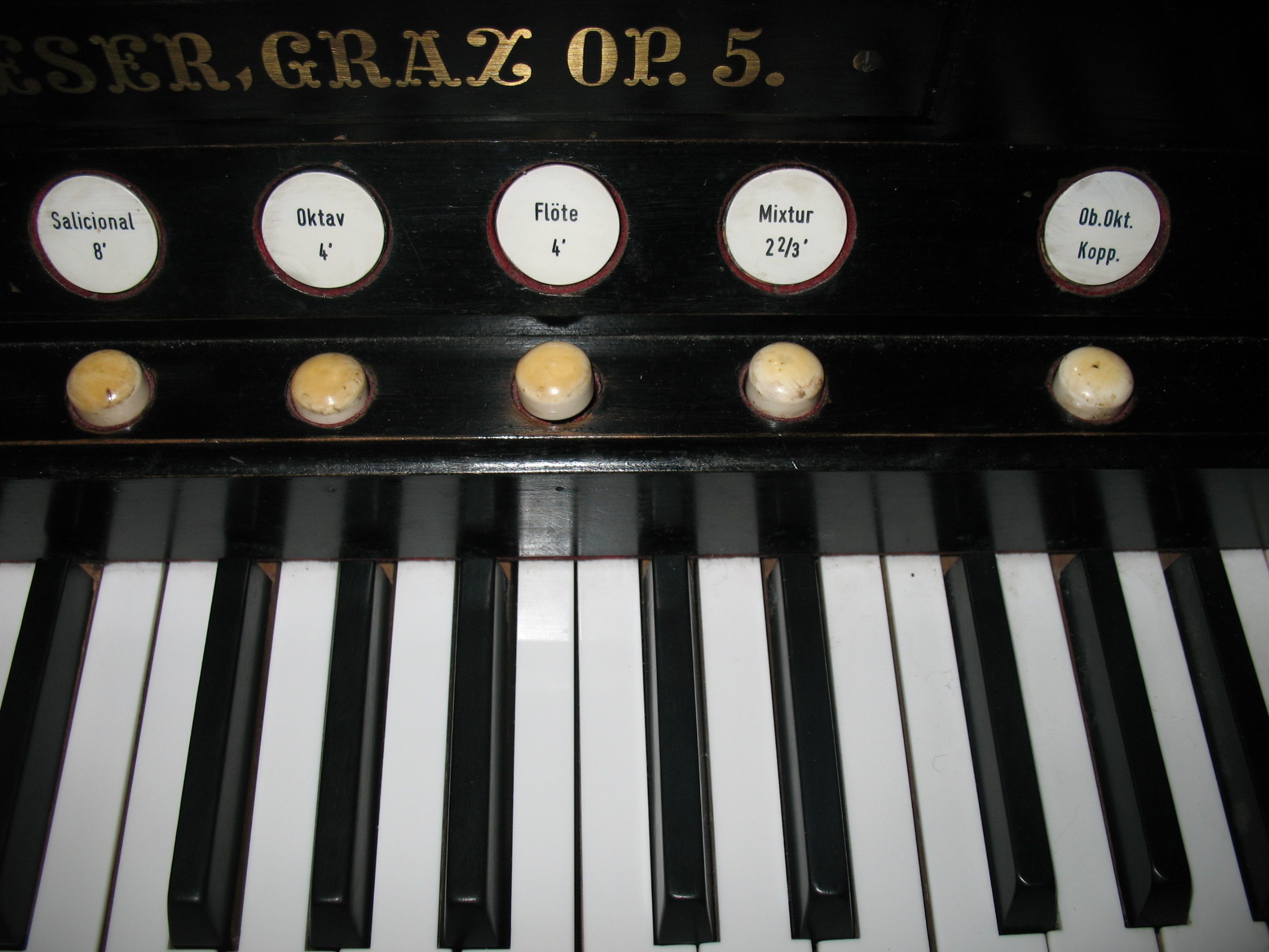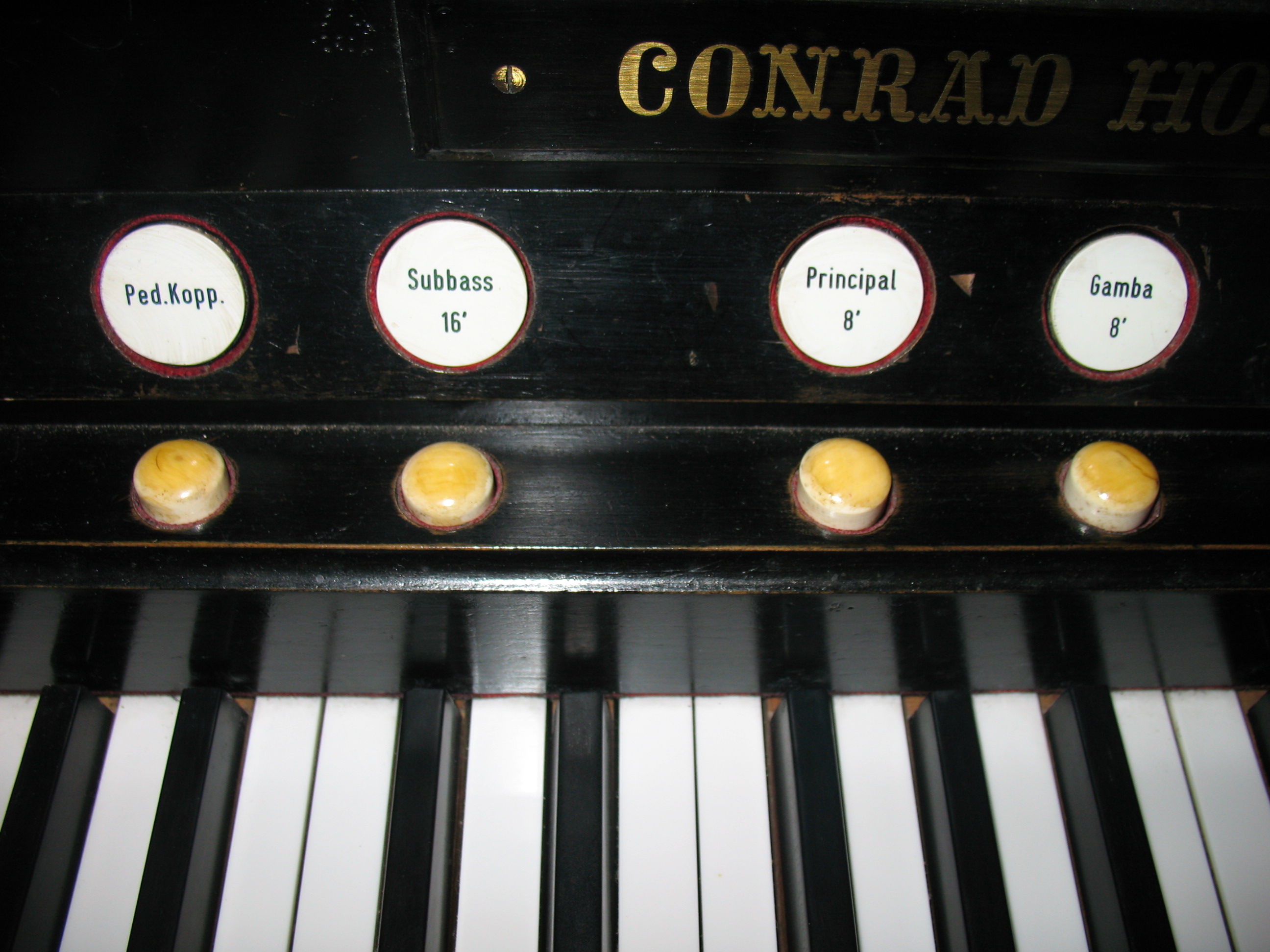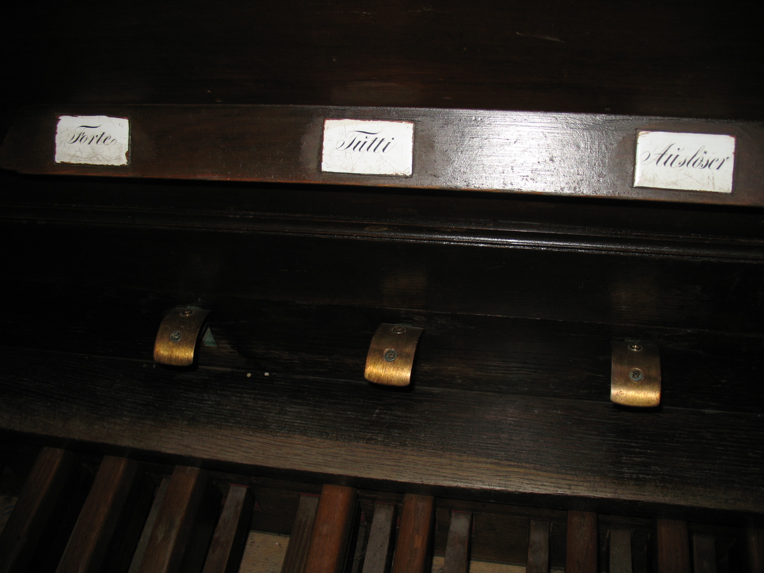 | Spielhilfen | Die beiden Koppeln sind als Knöpfe ausgeführt Die beiden festen Kombinationen sind als Tritte über der Pedalklaviatur ausgeführt |