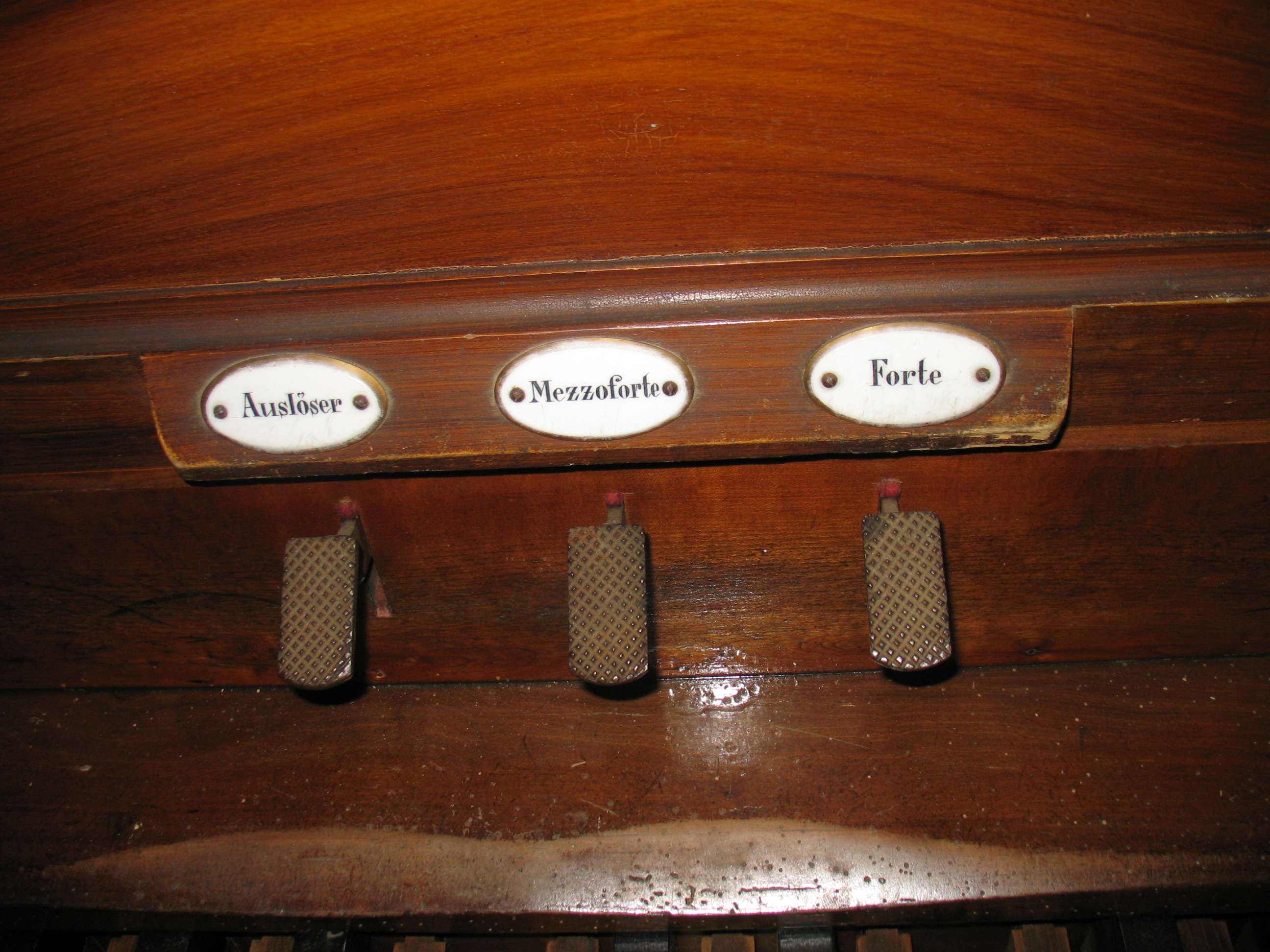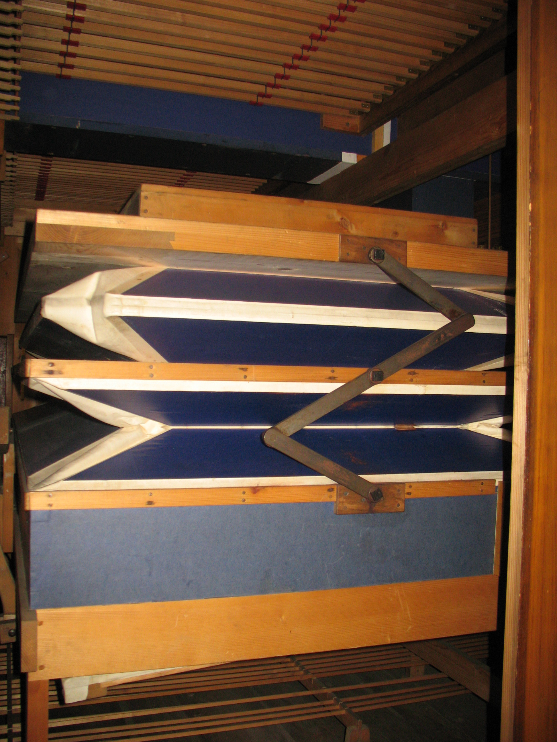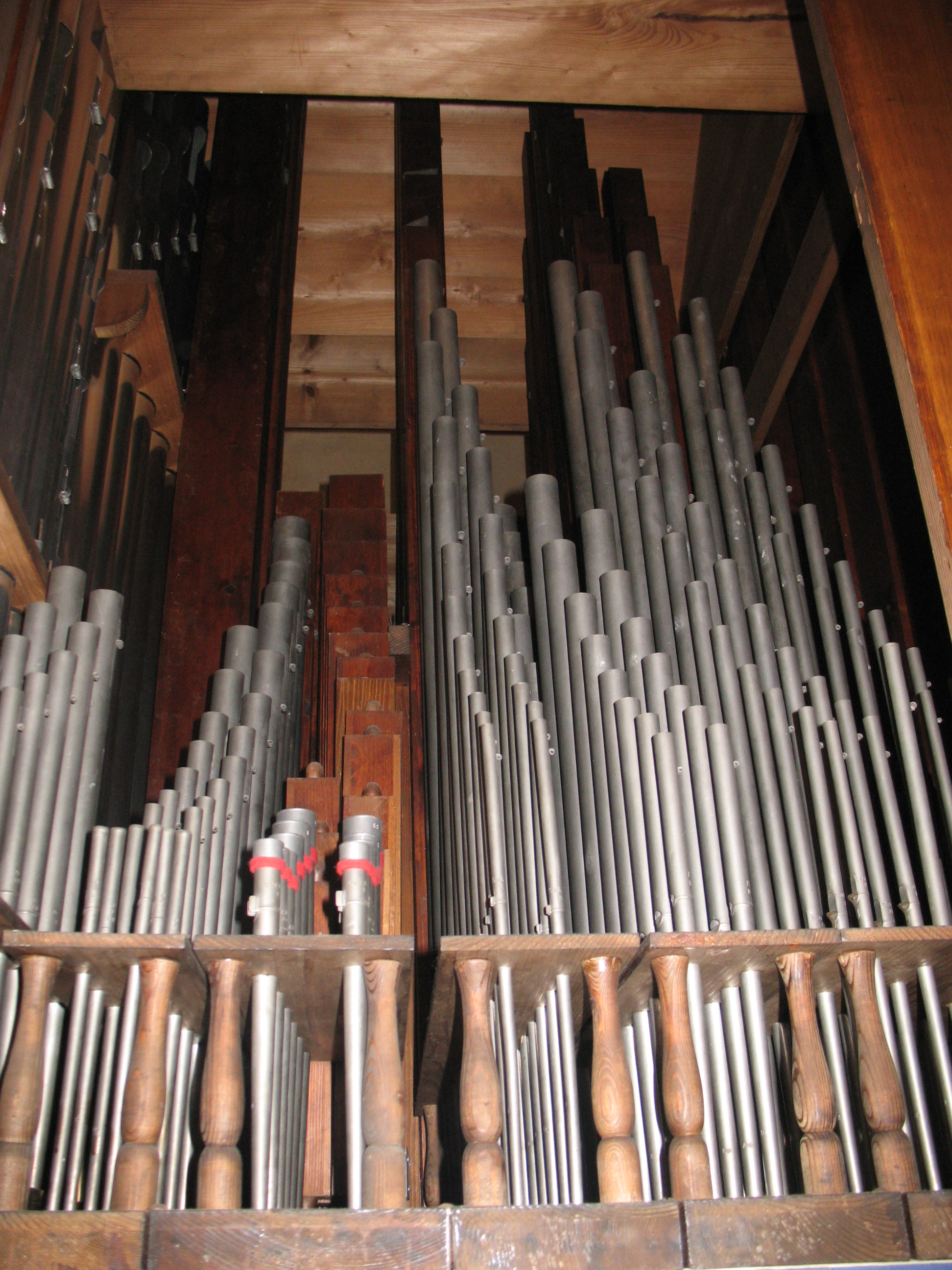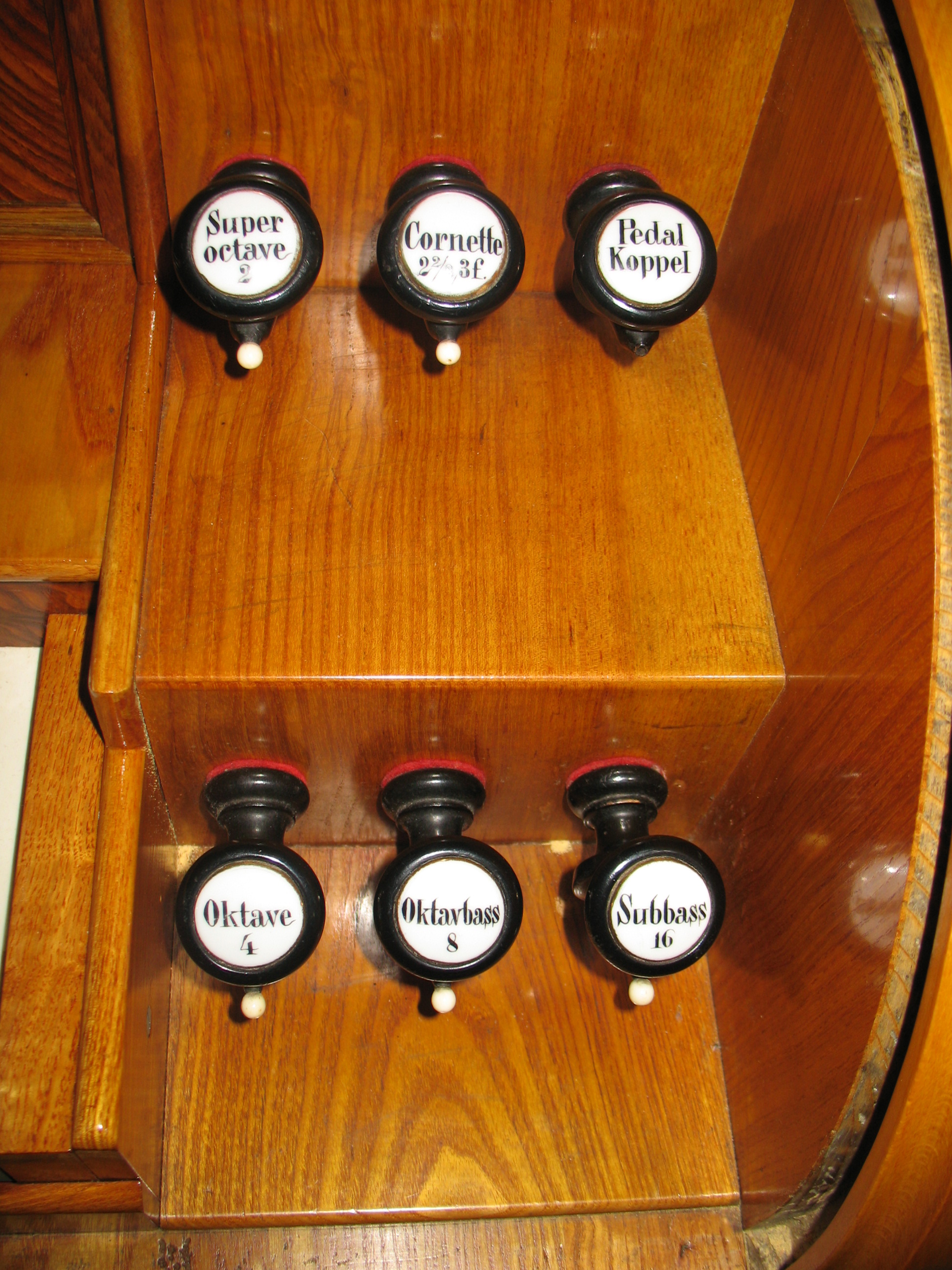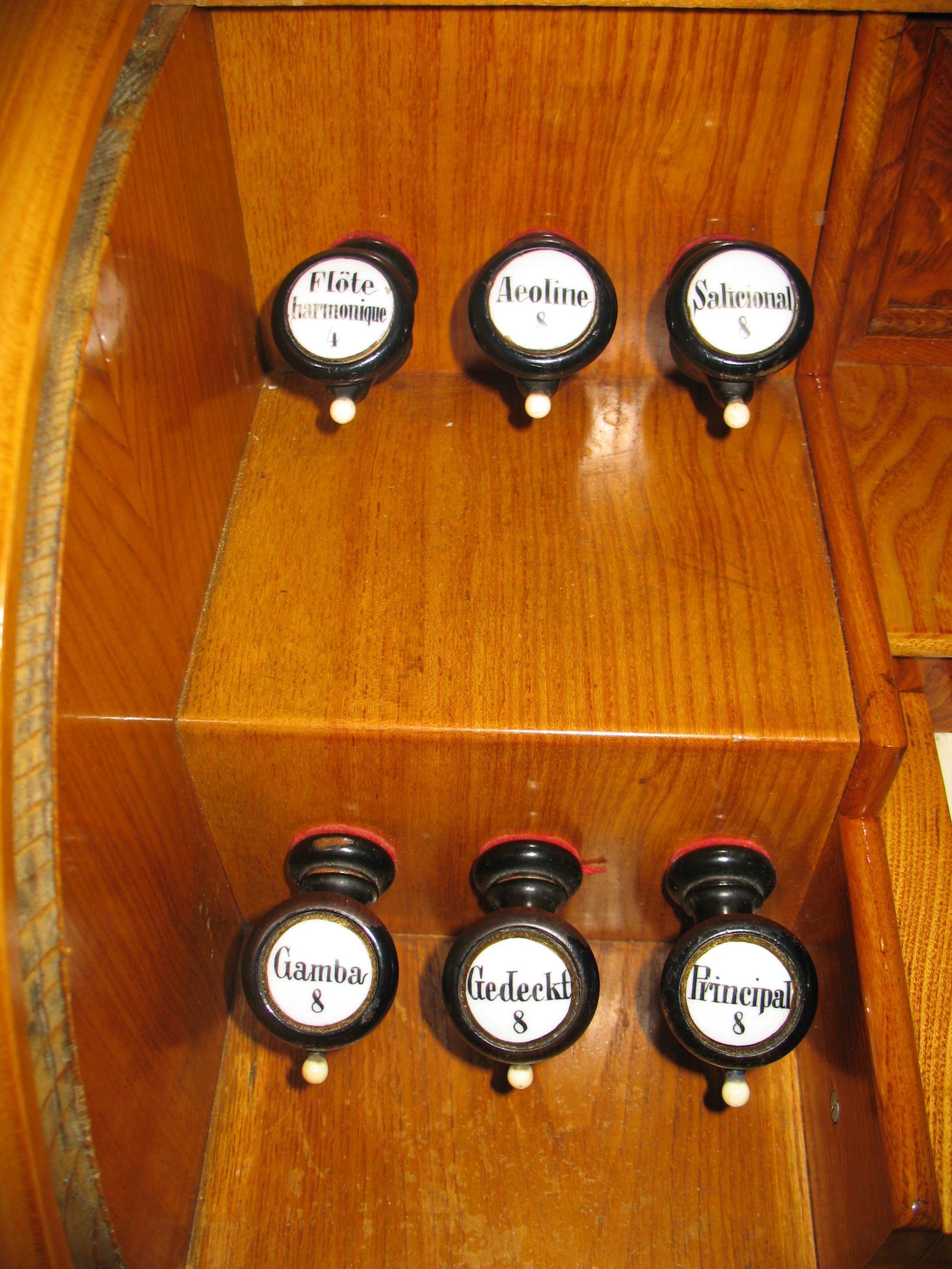 | Spielhilfen | Die Koppel ist als Registerzug rechts von der Manualklaviatur ausgeführt. Die festen Kombinationen sind als Tritt mittig über der Pedalklaviatur ausgeführt. |