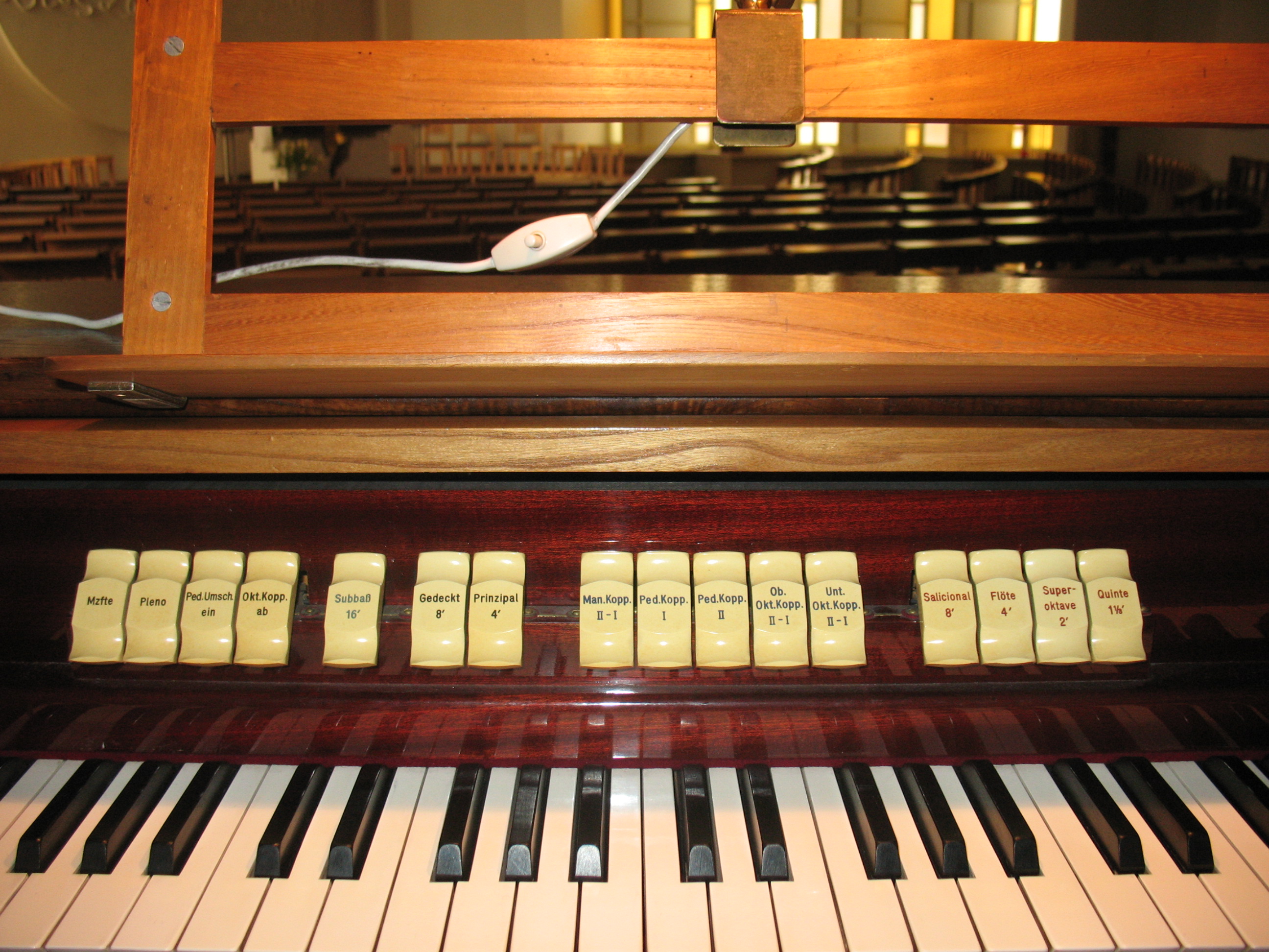 | Spielhilfen | Alle Spielhilfen sind als Registerwippen über der Klaviatur ausgeführt. |