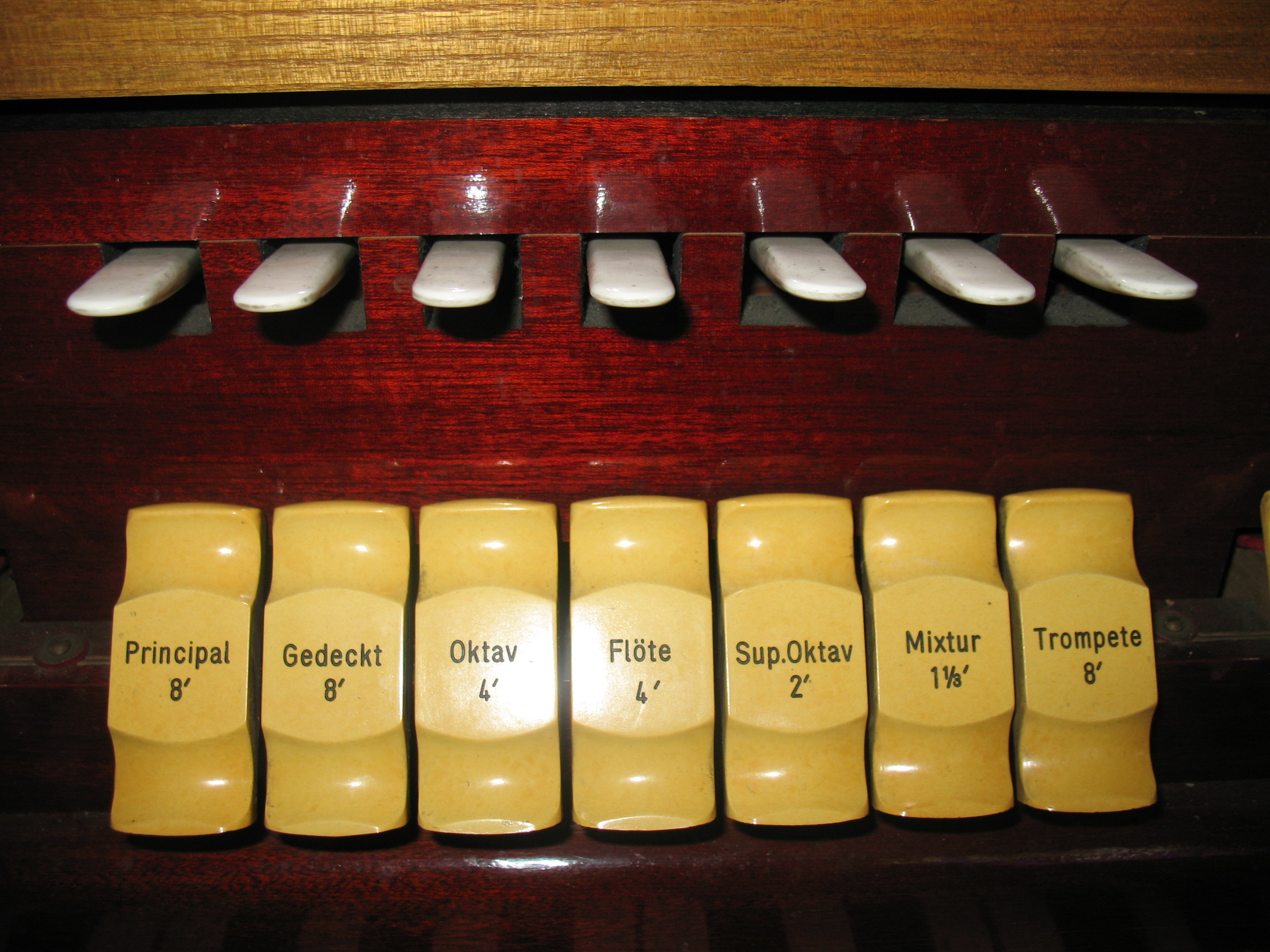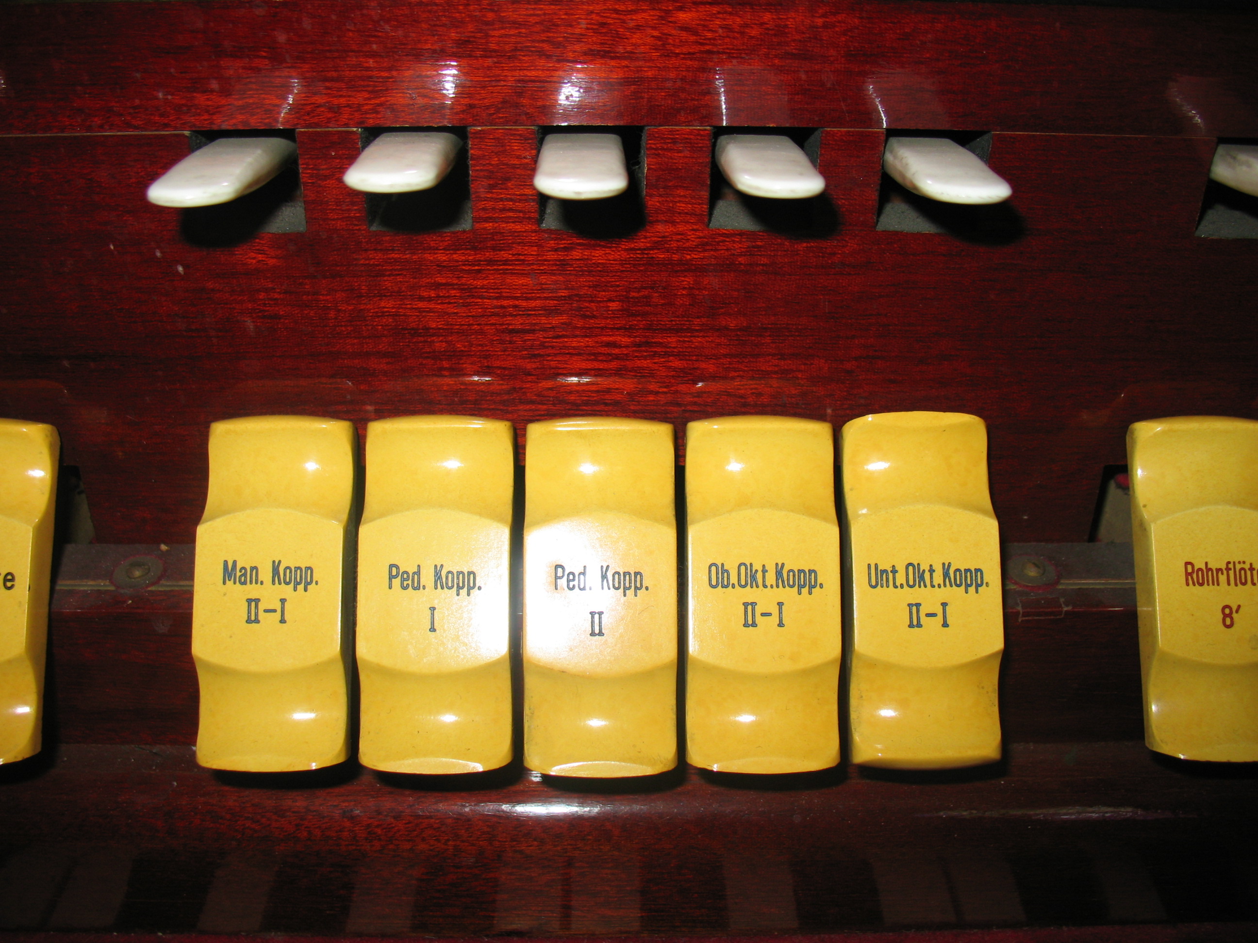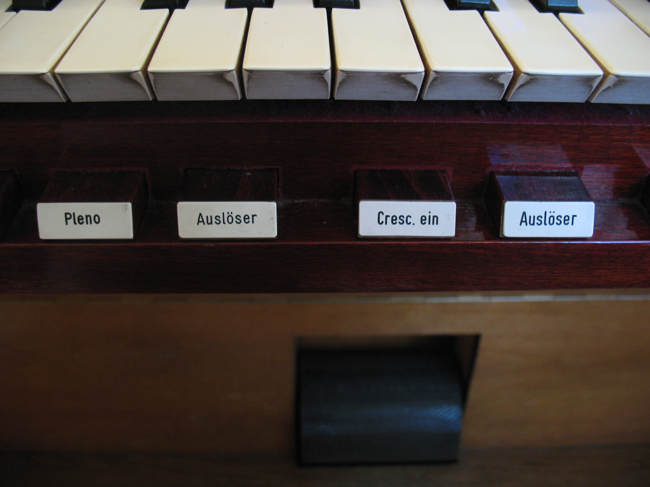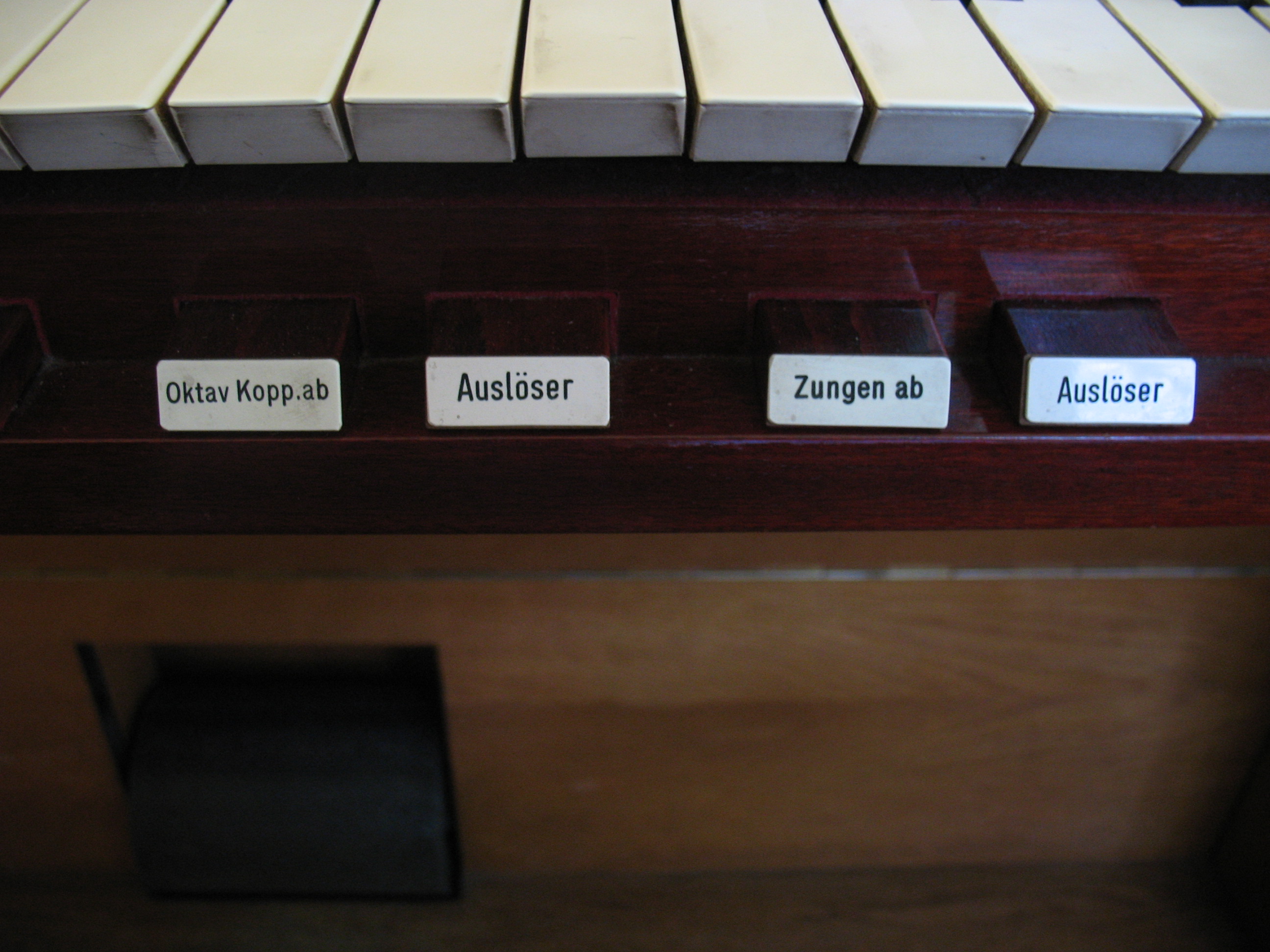 | Spielhilfen | Die Koppeln sind als Registerwippen über der Manualklaviatur ausgeführt. Die sonstigen Spielhilfen sind als Taster unter der Manualklaviatur ausgeführt. |