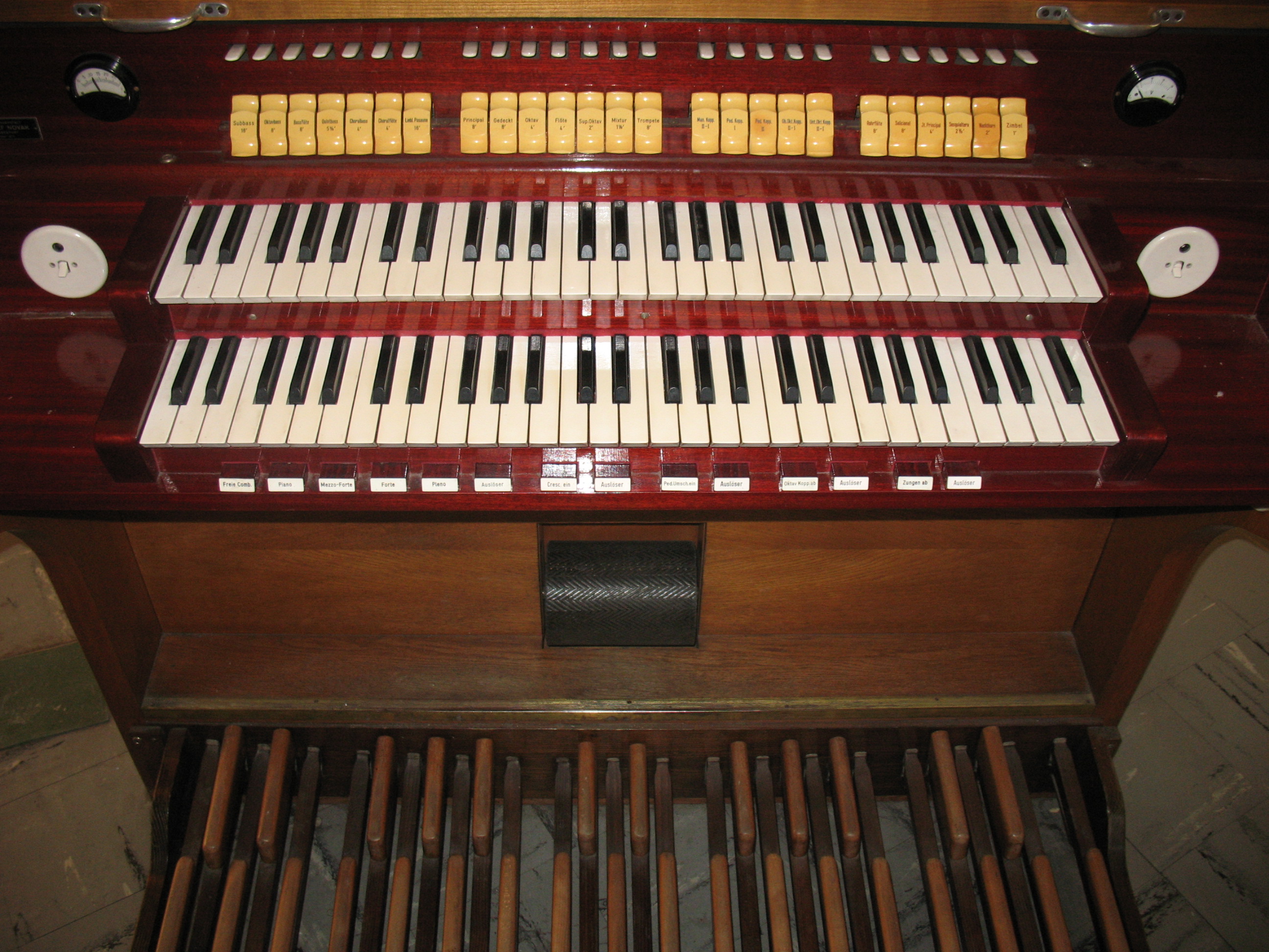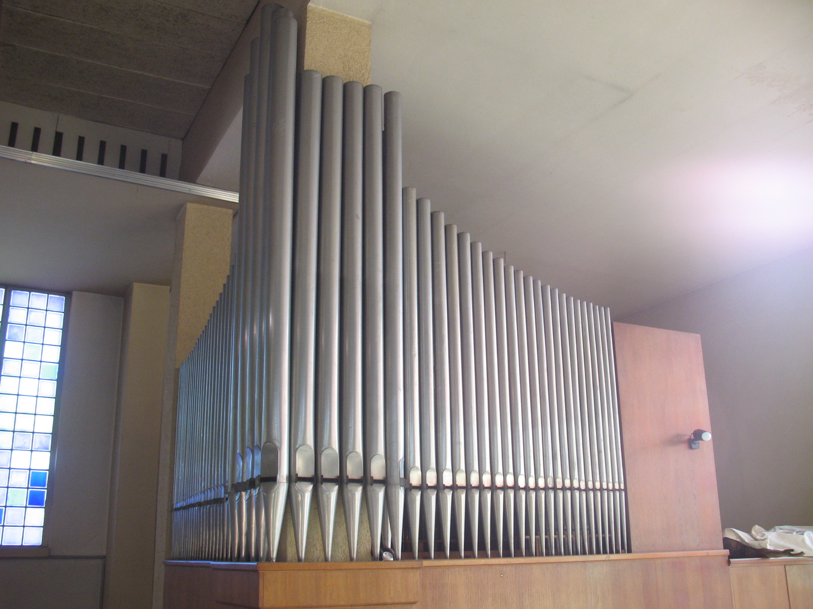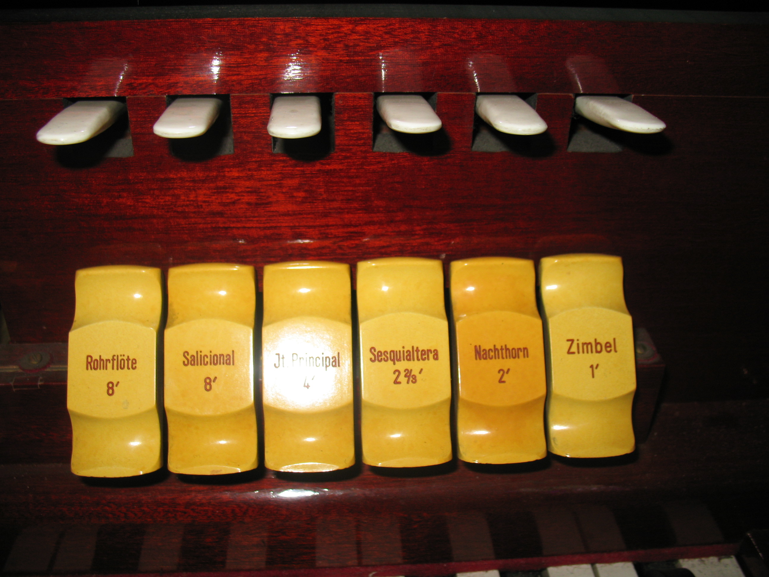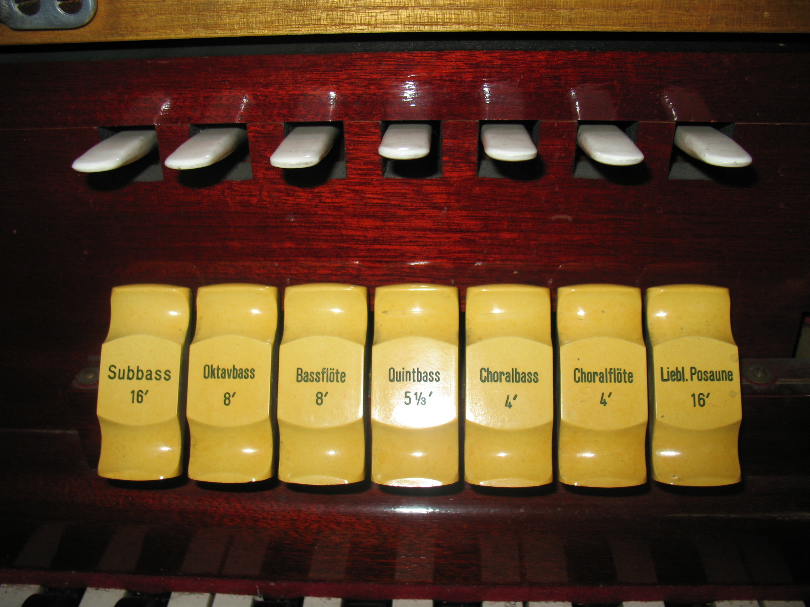 | Spielhilfen | Die Koppeln sind als Registerwippen über der Manualklaviatur ausgeführt. Die sonstigen Spielhilfen sind als Taster unter der Manualklaviatur ausgeführt. |