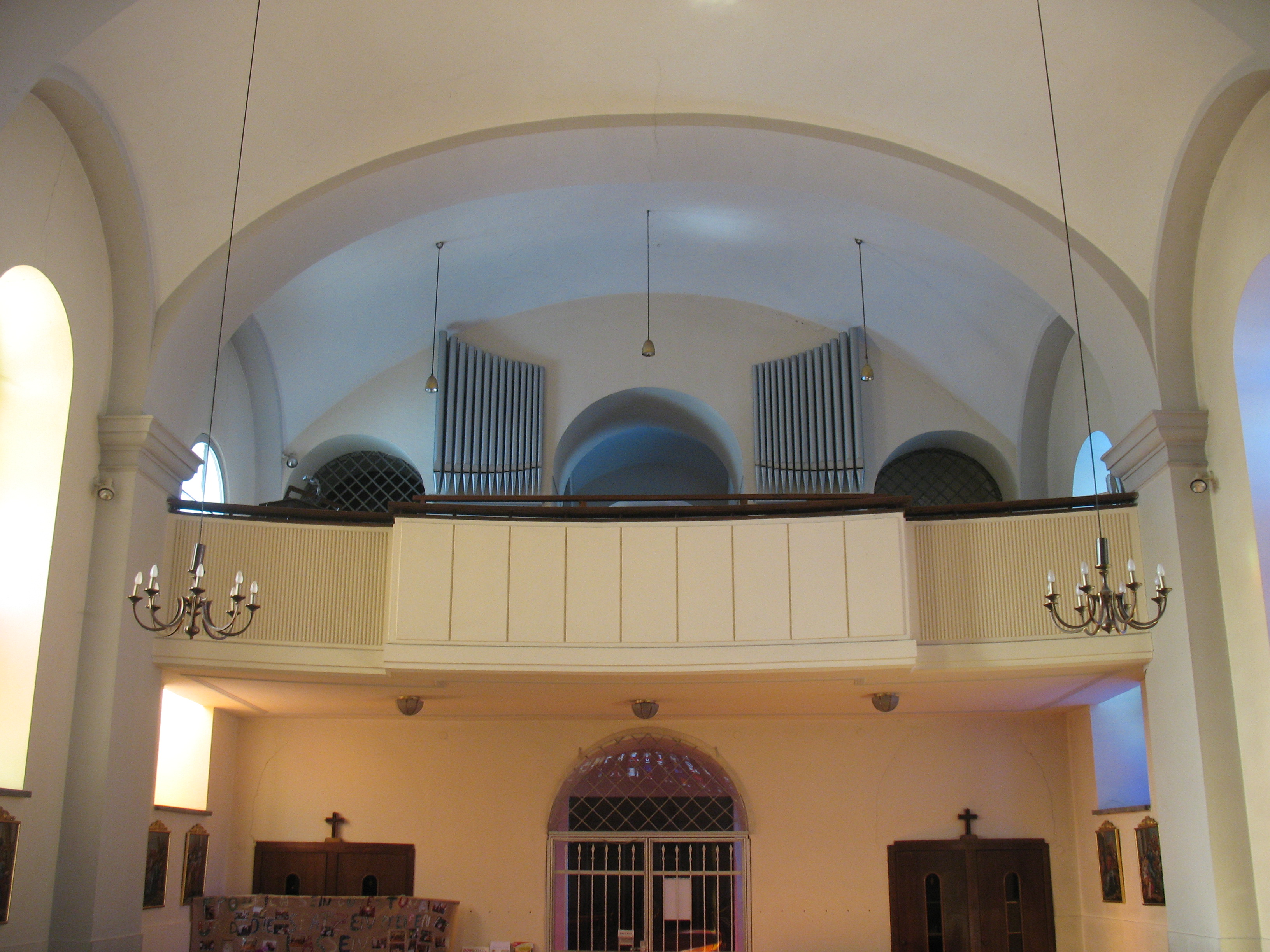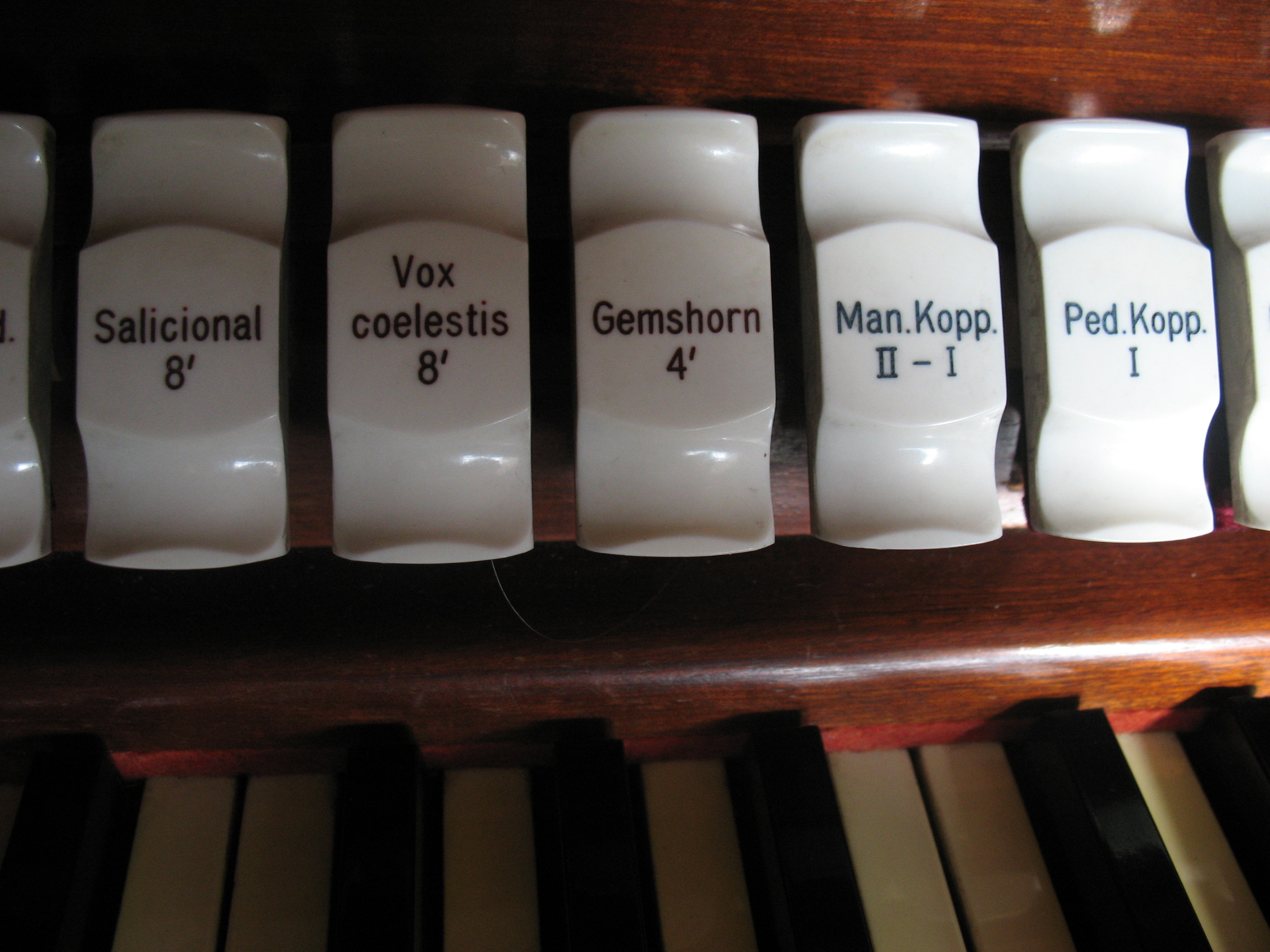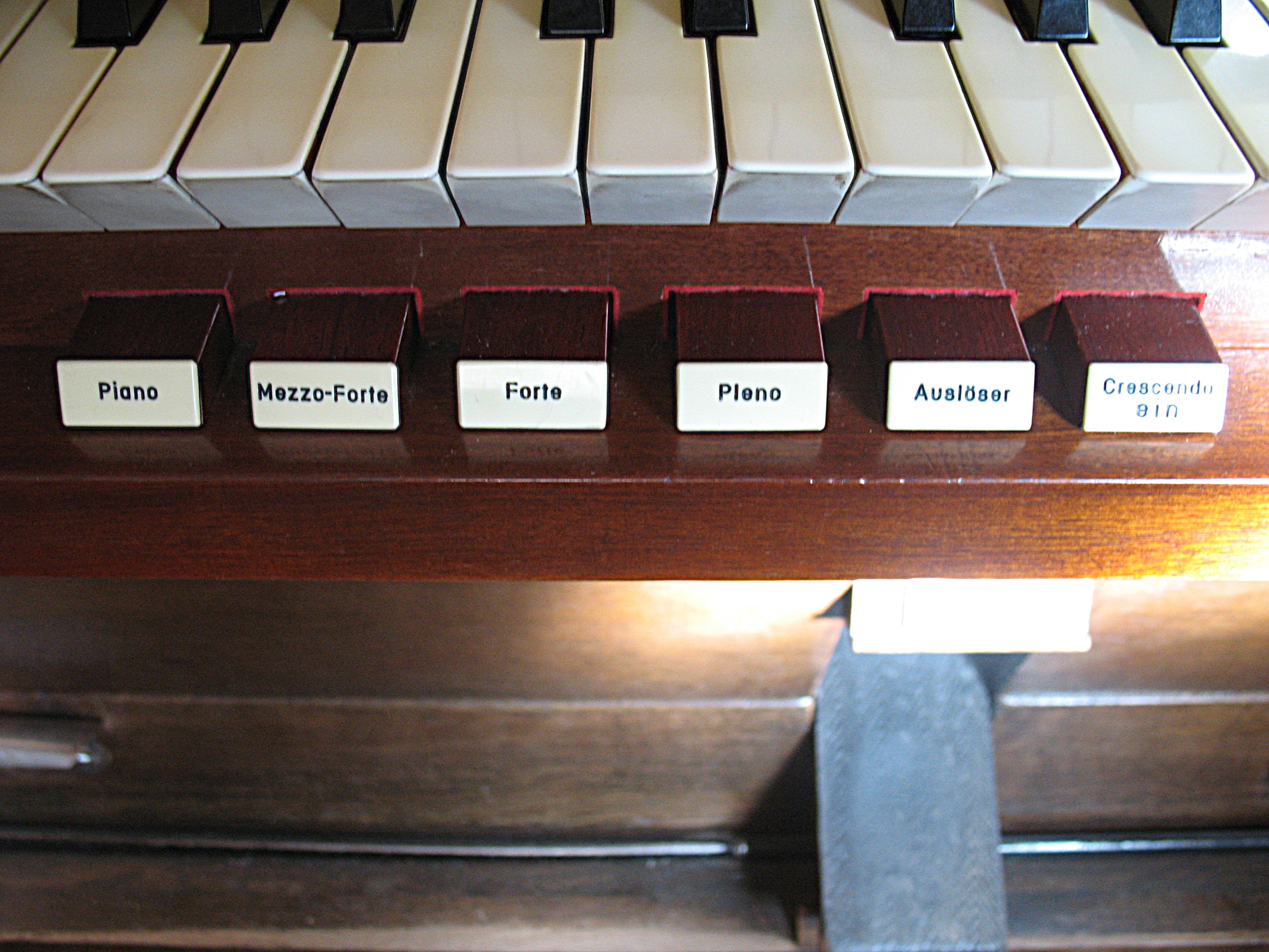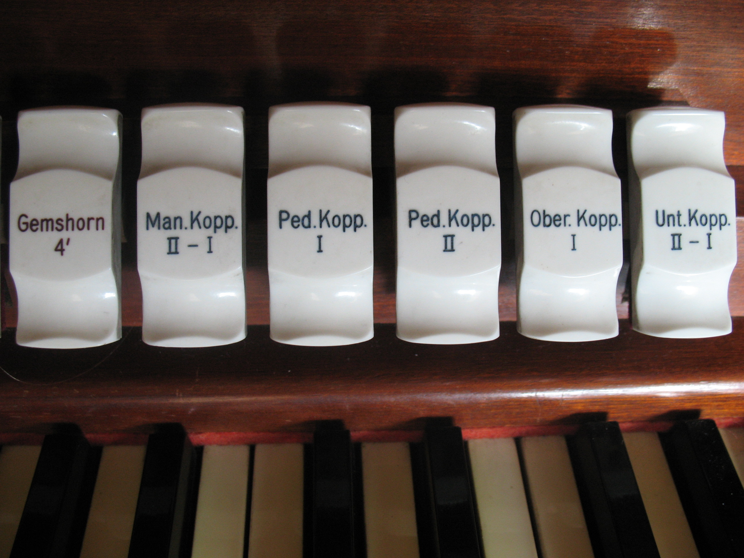 | Spielhilfen | Die Koppeln sind als Registerwippen über der Manualklaviatur ausgeführt. Die sonstigen Spielhilfen sind als Taster unter der Manualklaviatur ausgeführt. Crescendo ist als Tritt ausgeführt. |