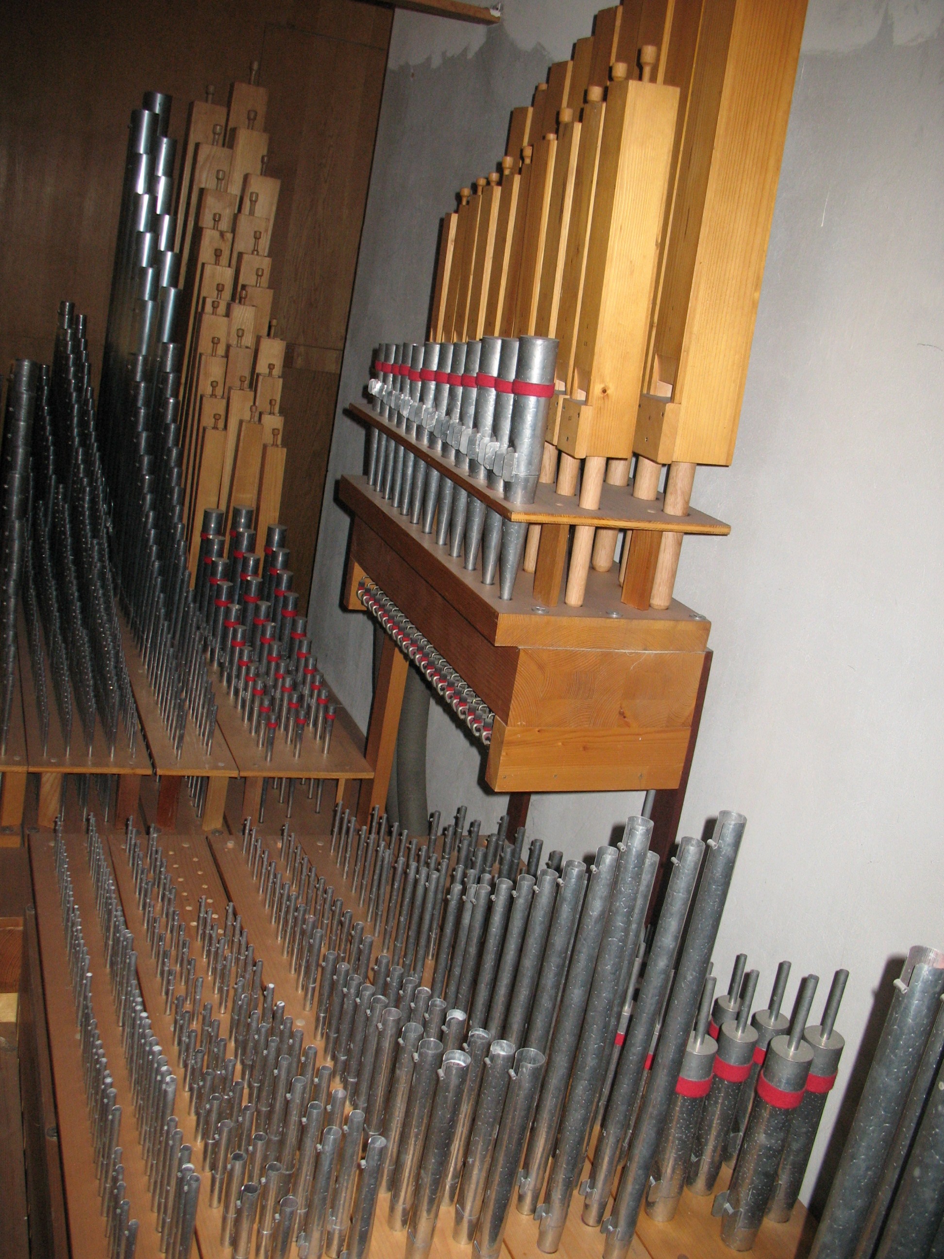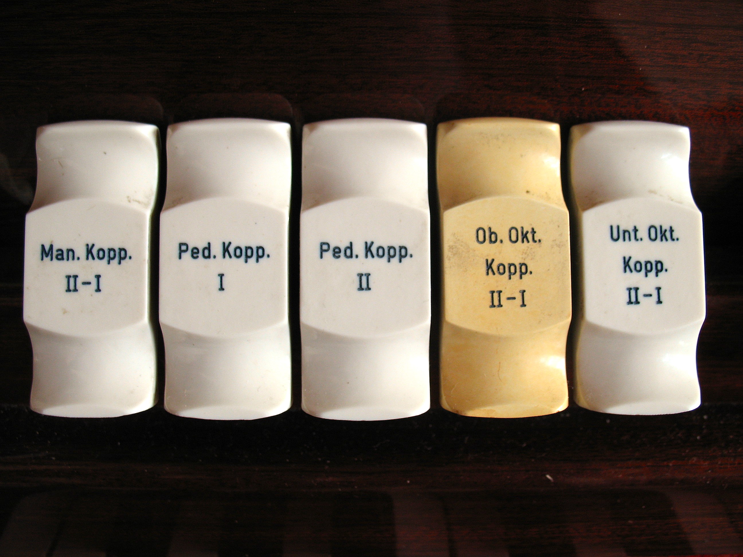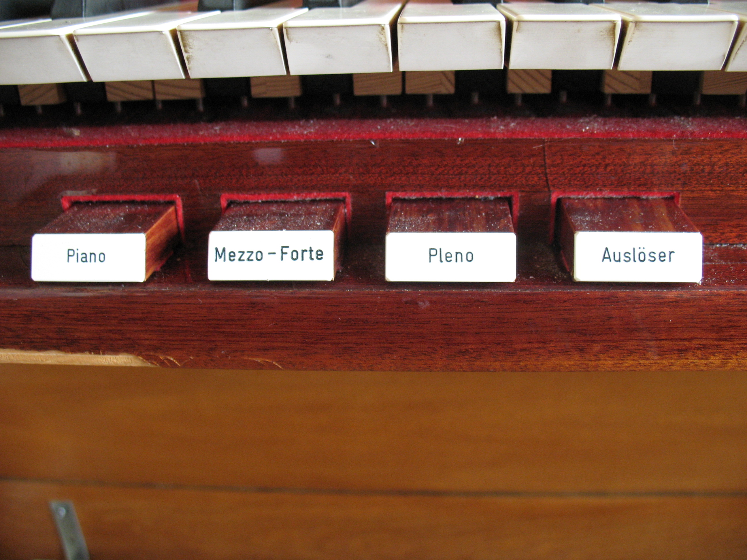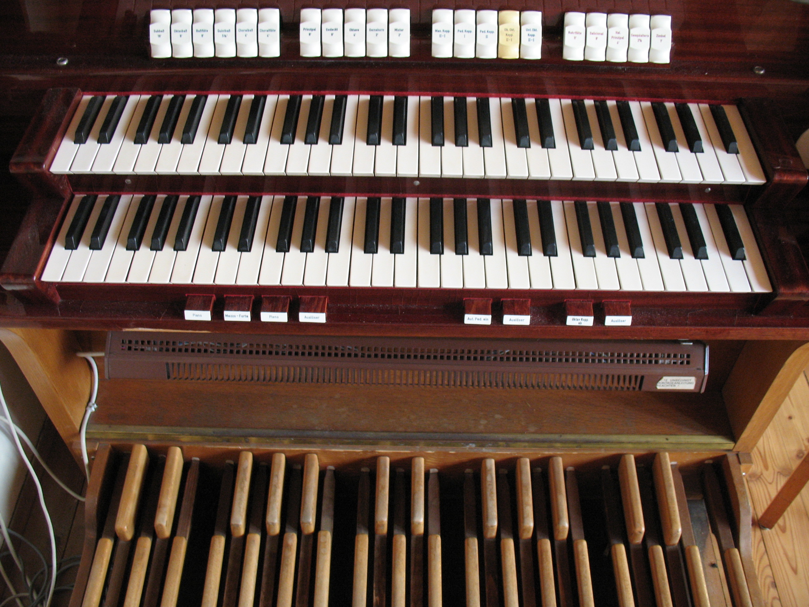 | Spielhilfen | Die Koppeln sind als Registerwippen ausgeführt. Die Kombinationen und anderen Spielhilfen sind als rechteckige Taster unter der Manualklaviatur ausgeführt. |