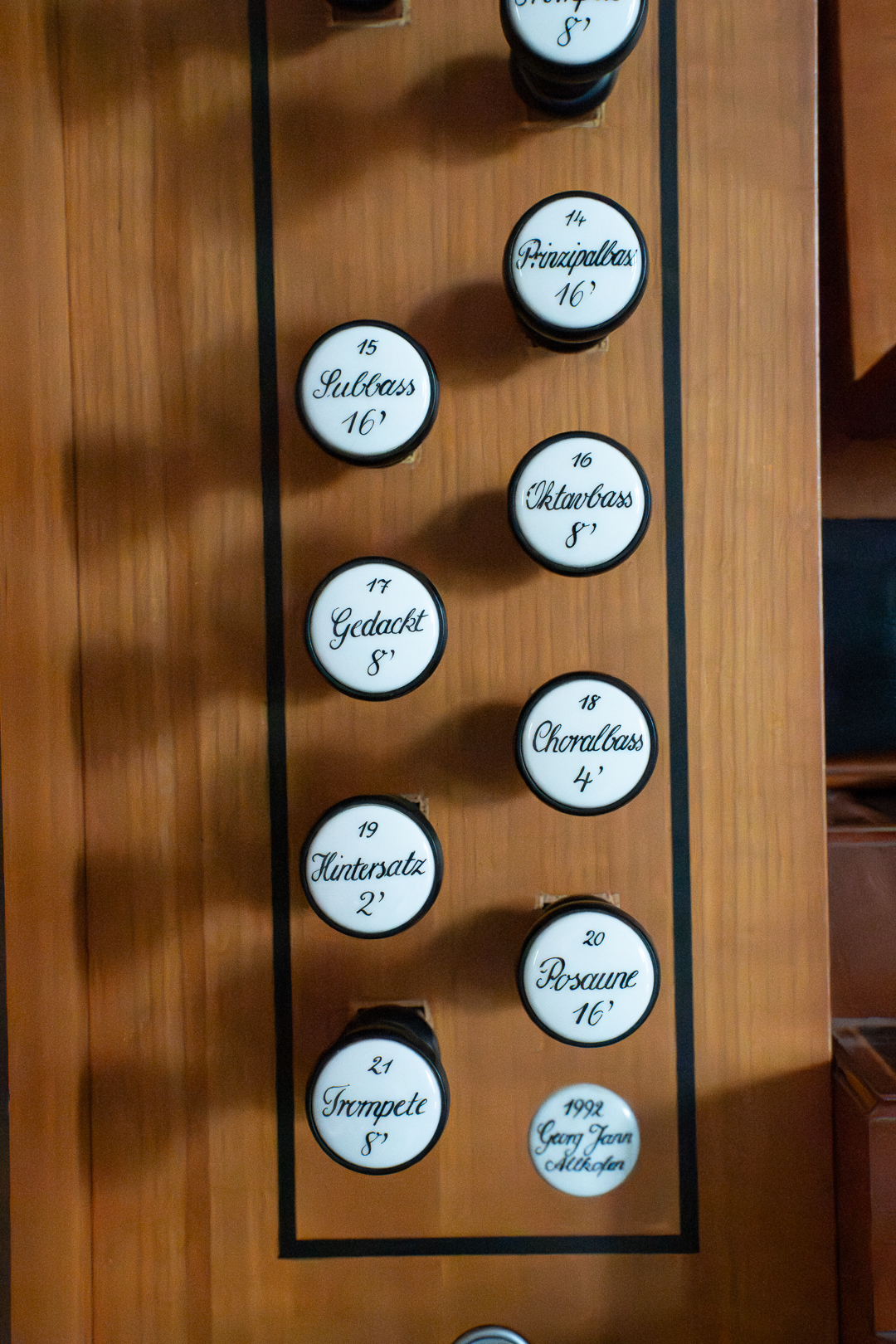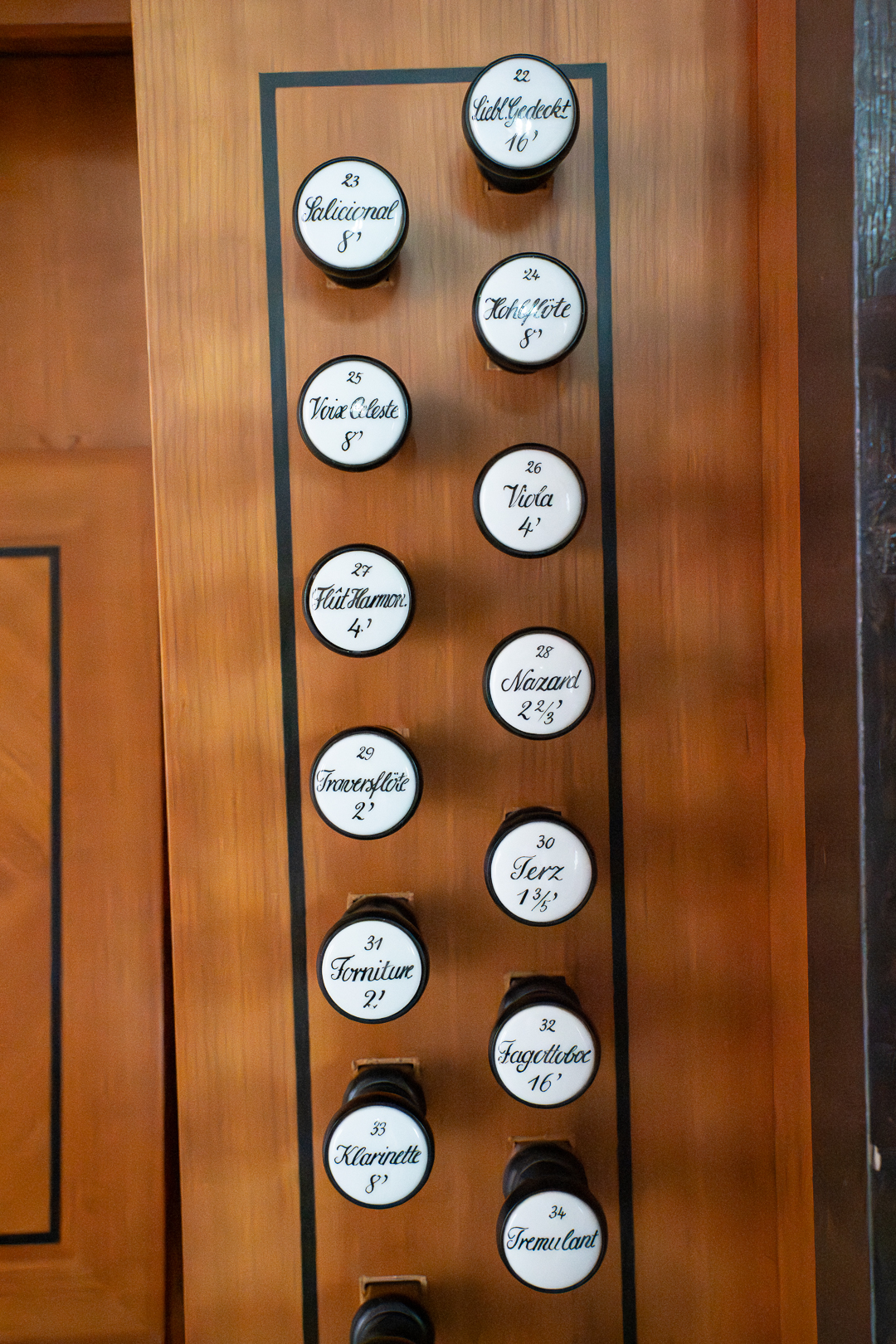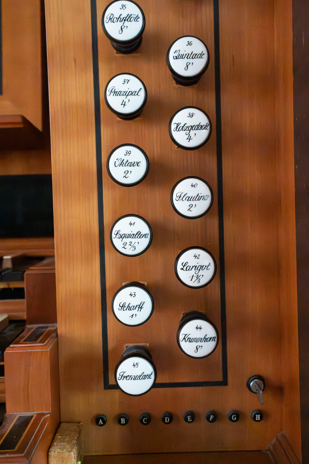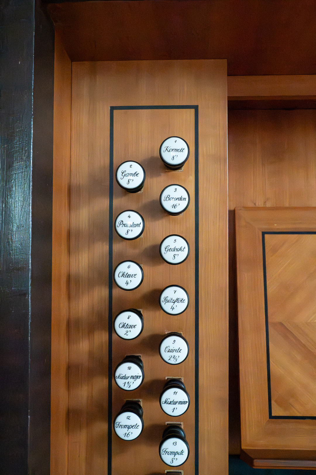 | Spielhilfen | Das Instrument ist mit 128 Setzerkombinationen ausgestattet. Spiel- und Registertraktur sind mechanisch. |