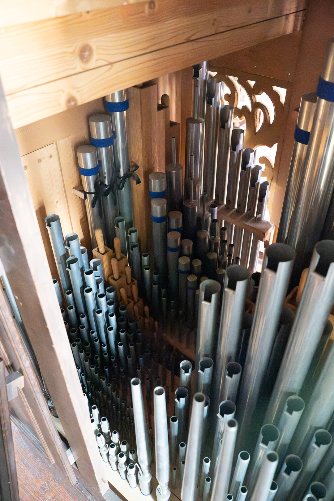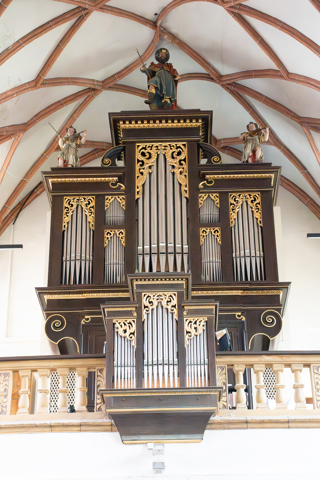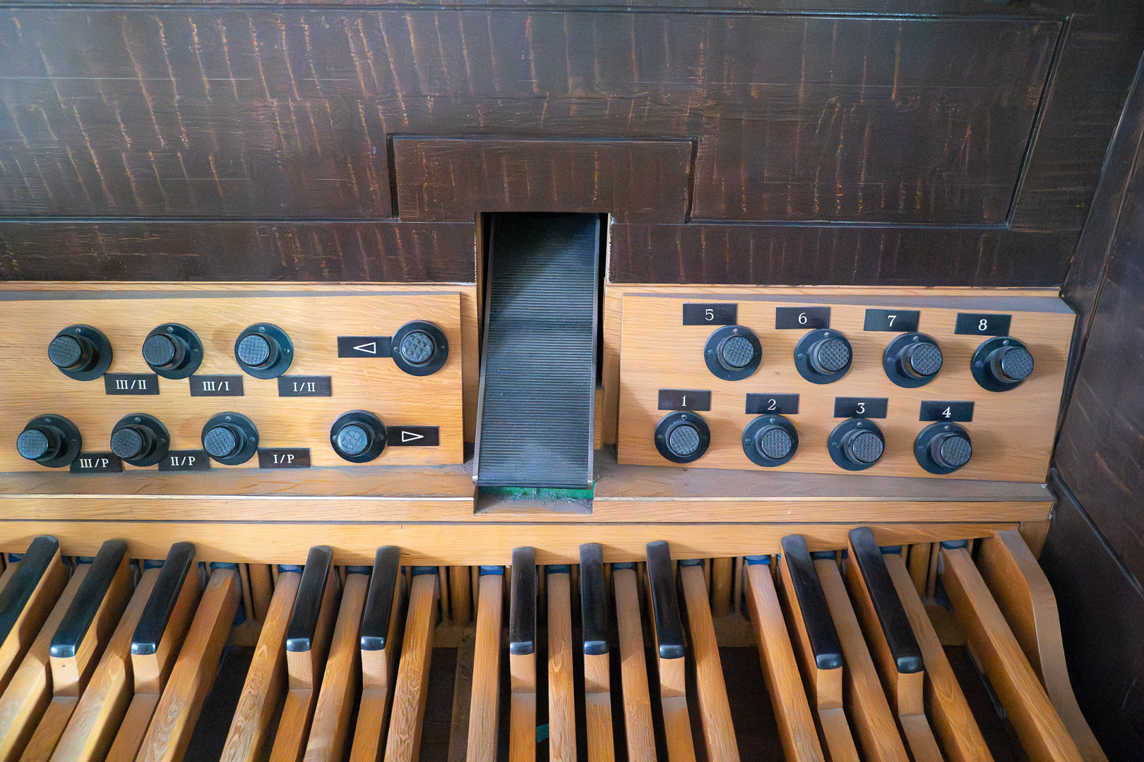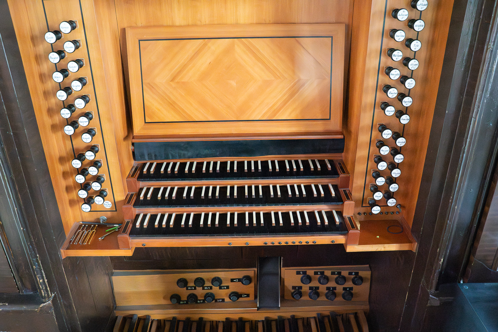 | Spielhilfen | Das Instrument ist mit 128 Setzerkombinationen ausgestattet. Spiel- und Registertraktur sind mechanisch. |