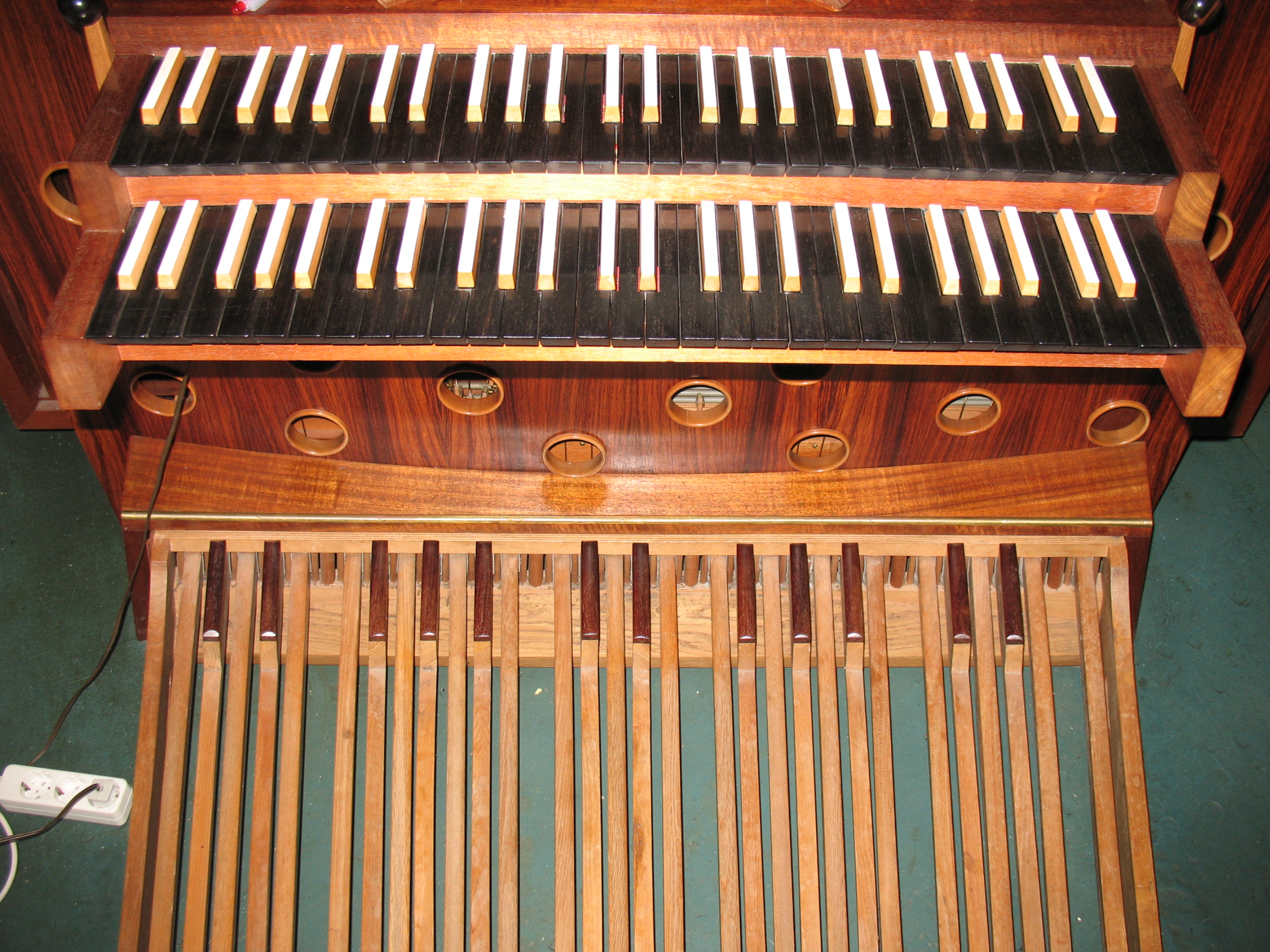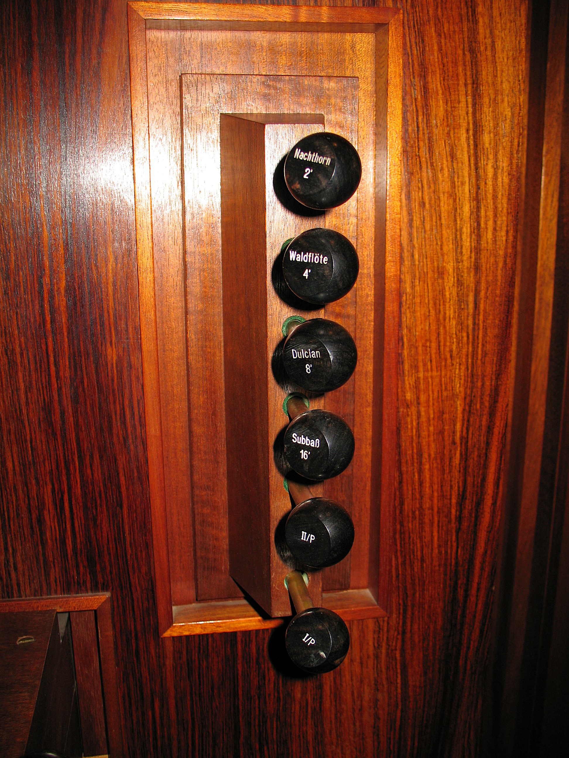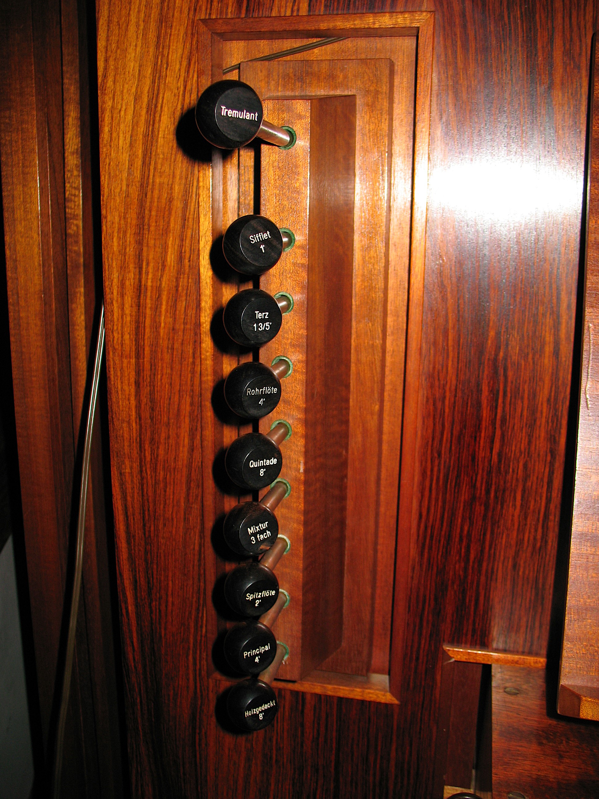 | Spielhilfen | Die Koppeln und der Tremulant sind als Registerzüge ausgeführt. |
