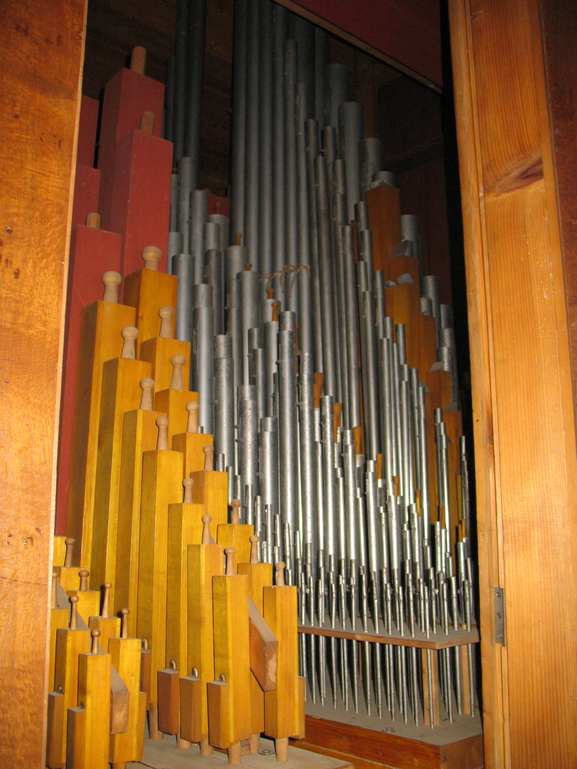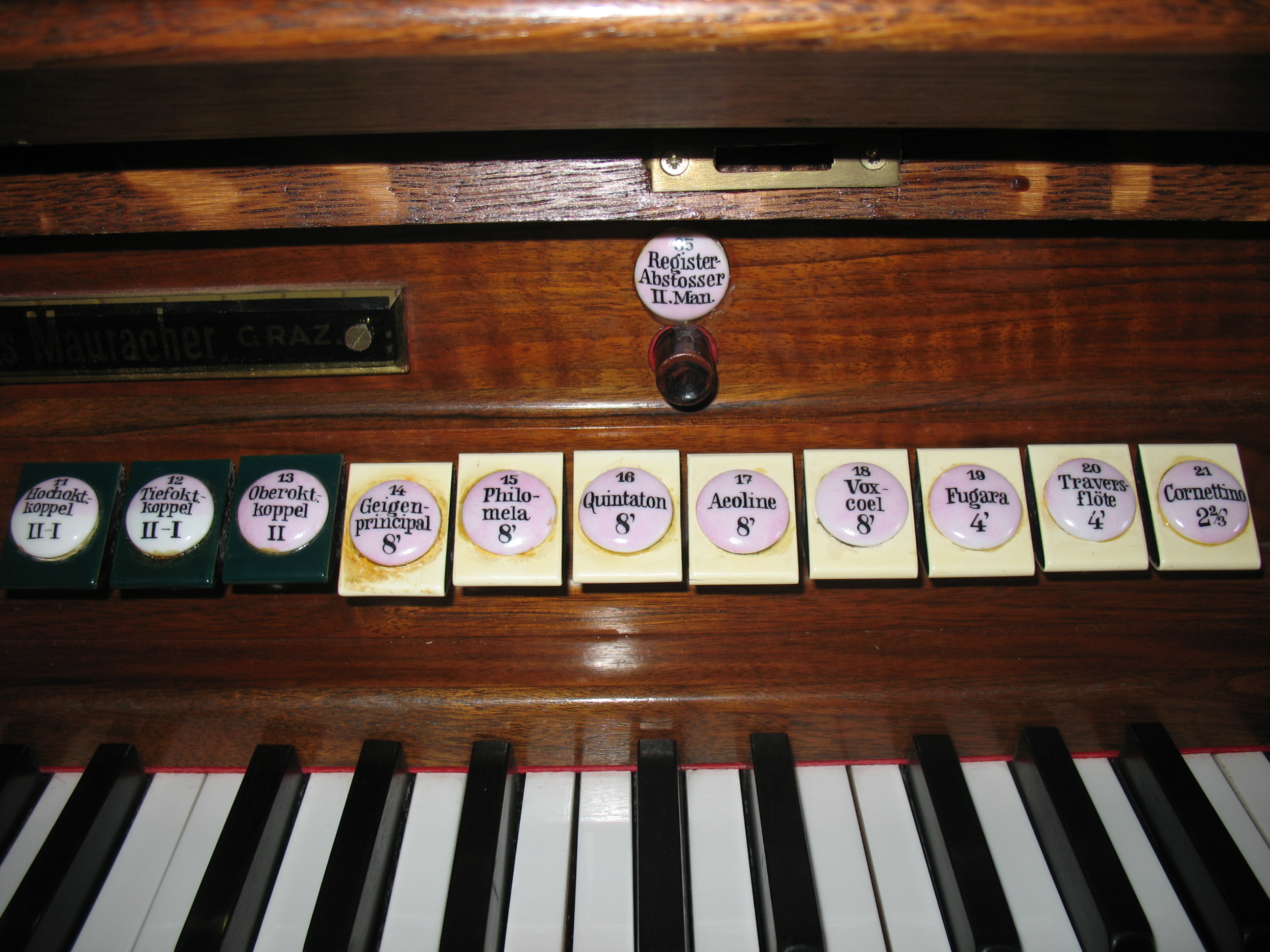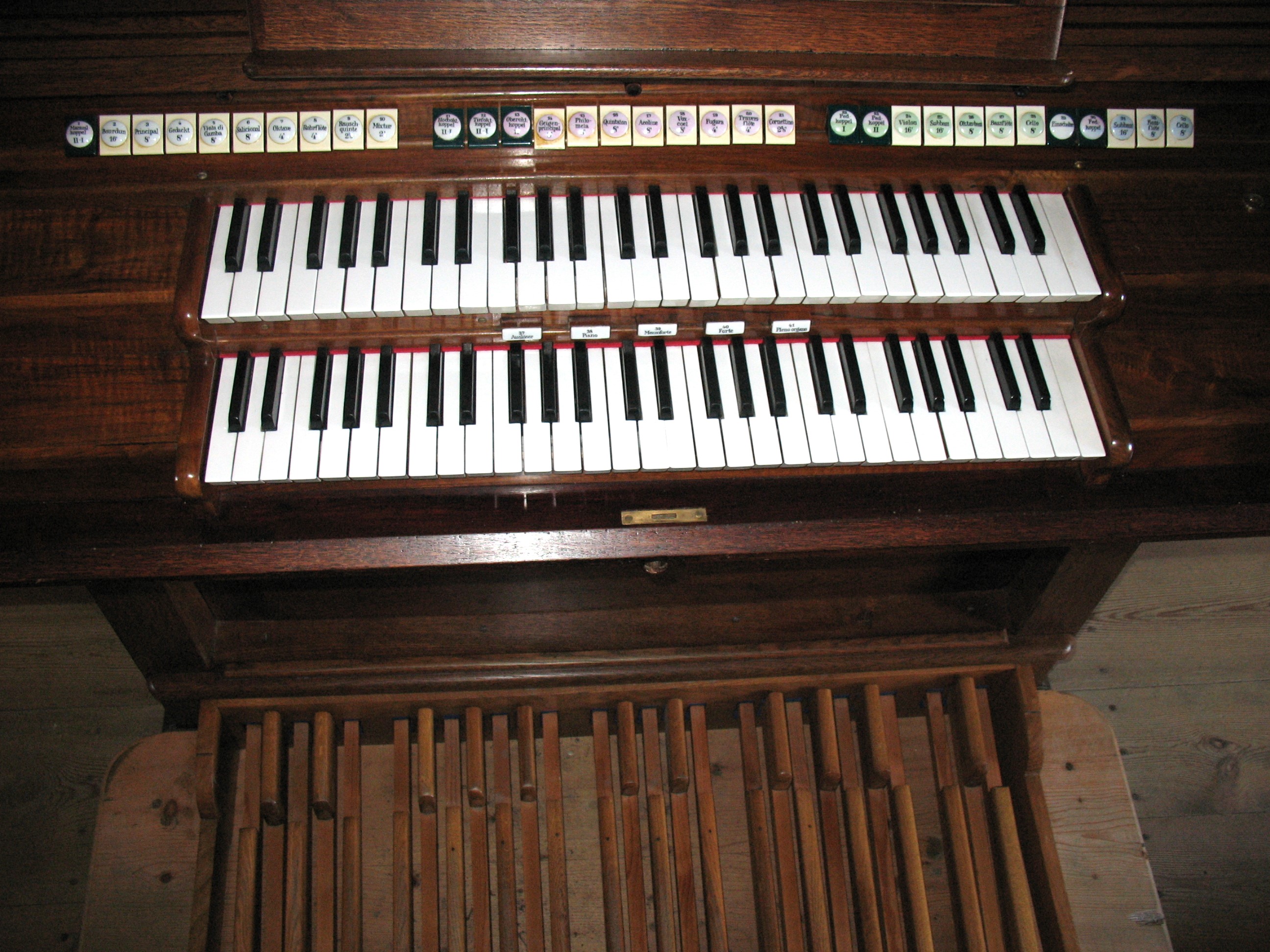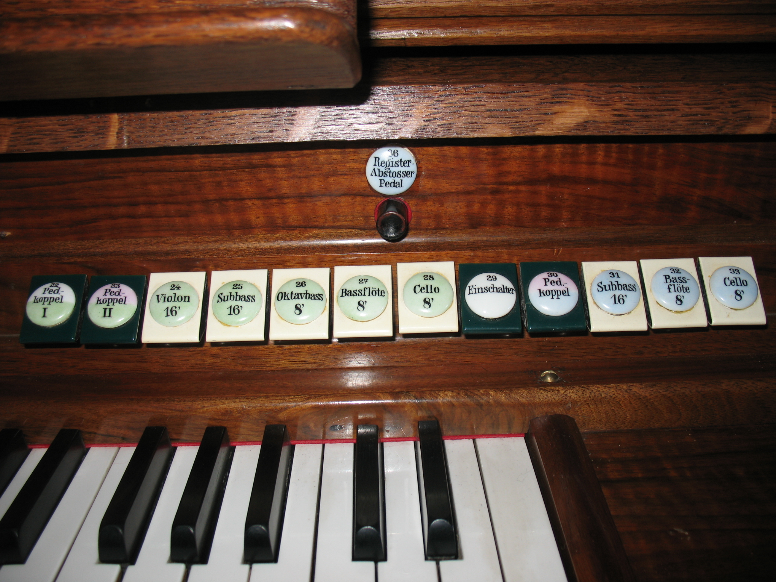 | Spielhilfen | Die Koppeln sind als Registerwippen über der Manualklaviatur ausgeführt. Die festen Kombinationen sind mit Tastern zwischen den beiden Manualklaviaturen zu schalten. |