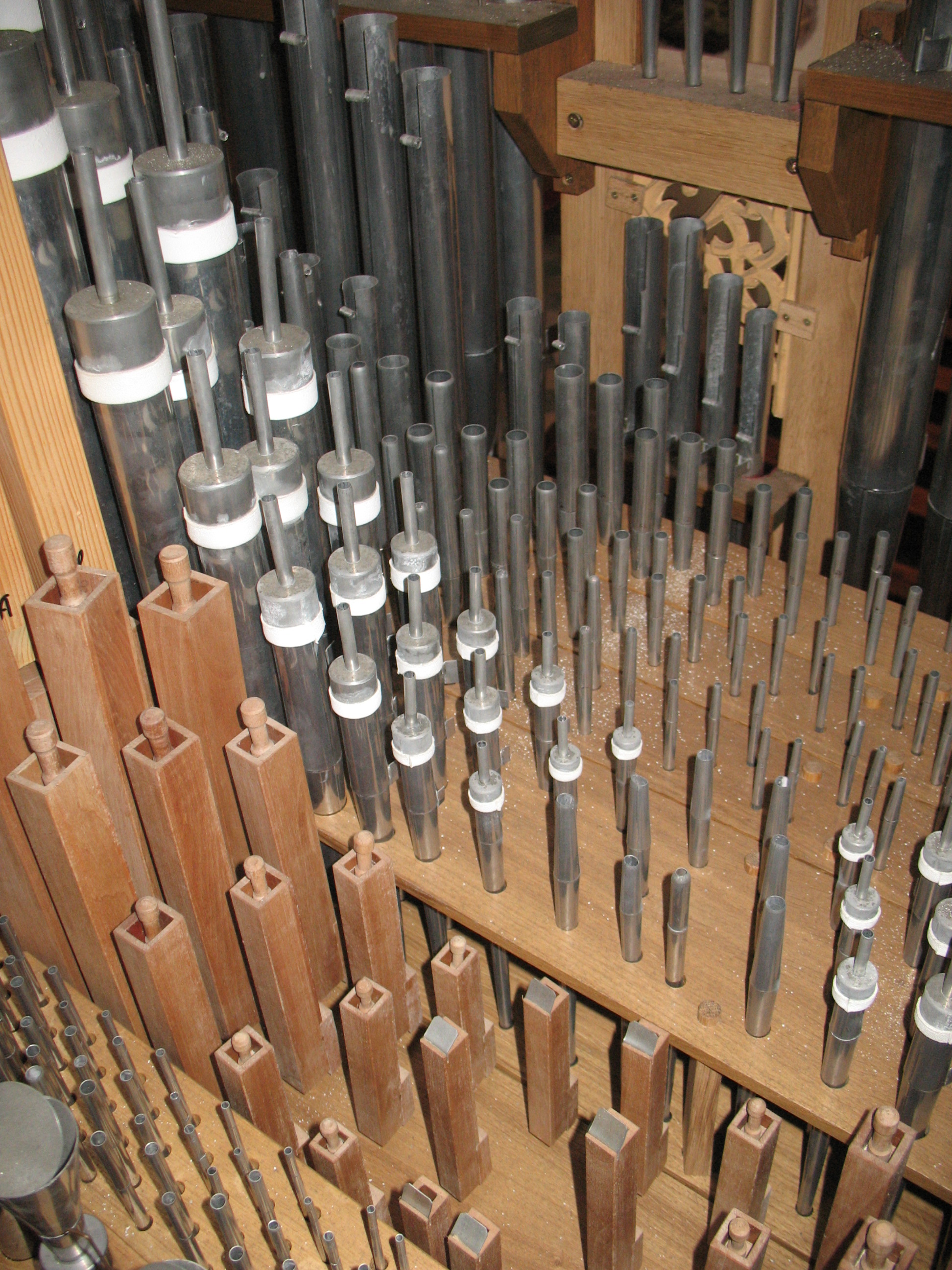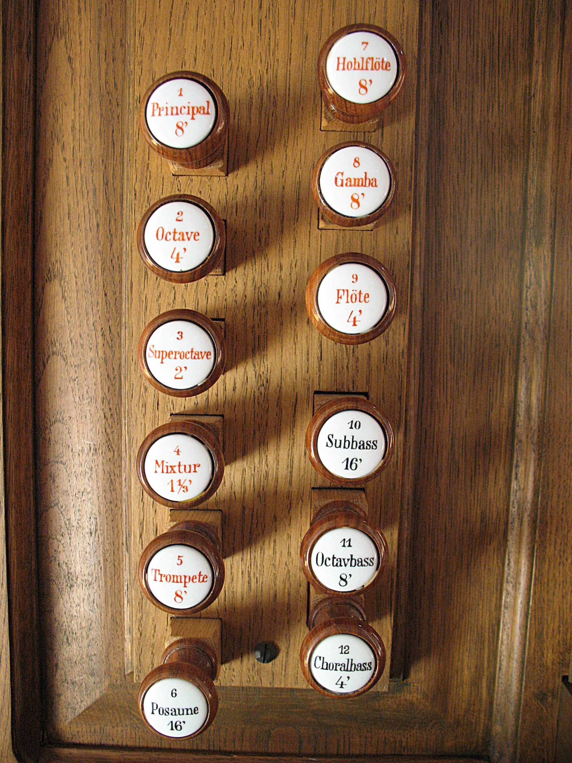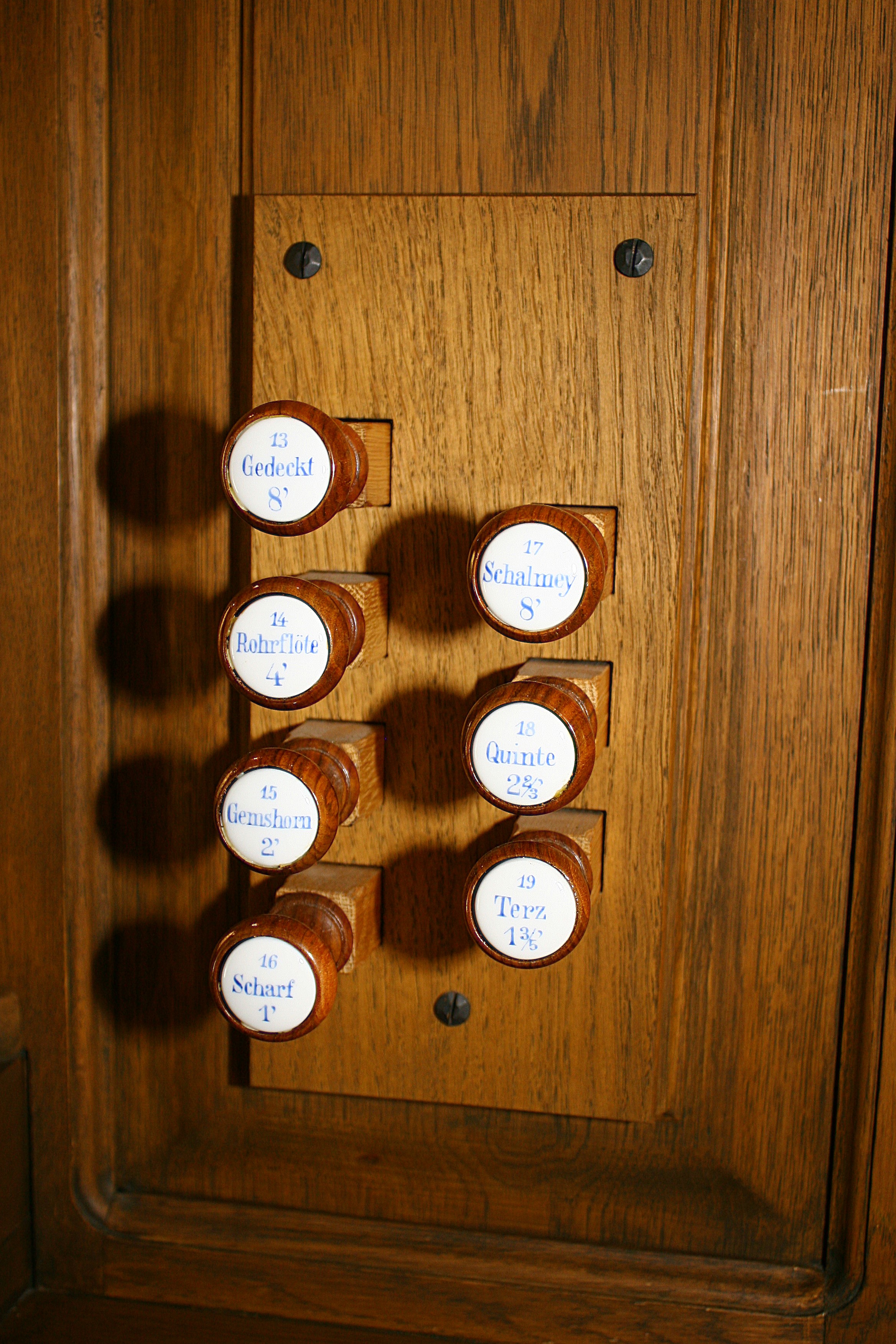 | Spielhilfen | Die Koppeln sind als Tritte über der Pedalklavitur ausgeführt. |
