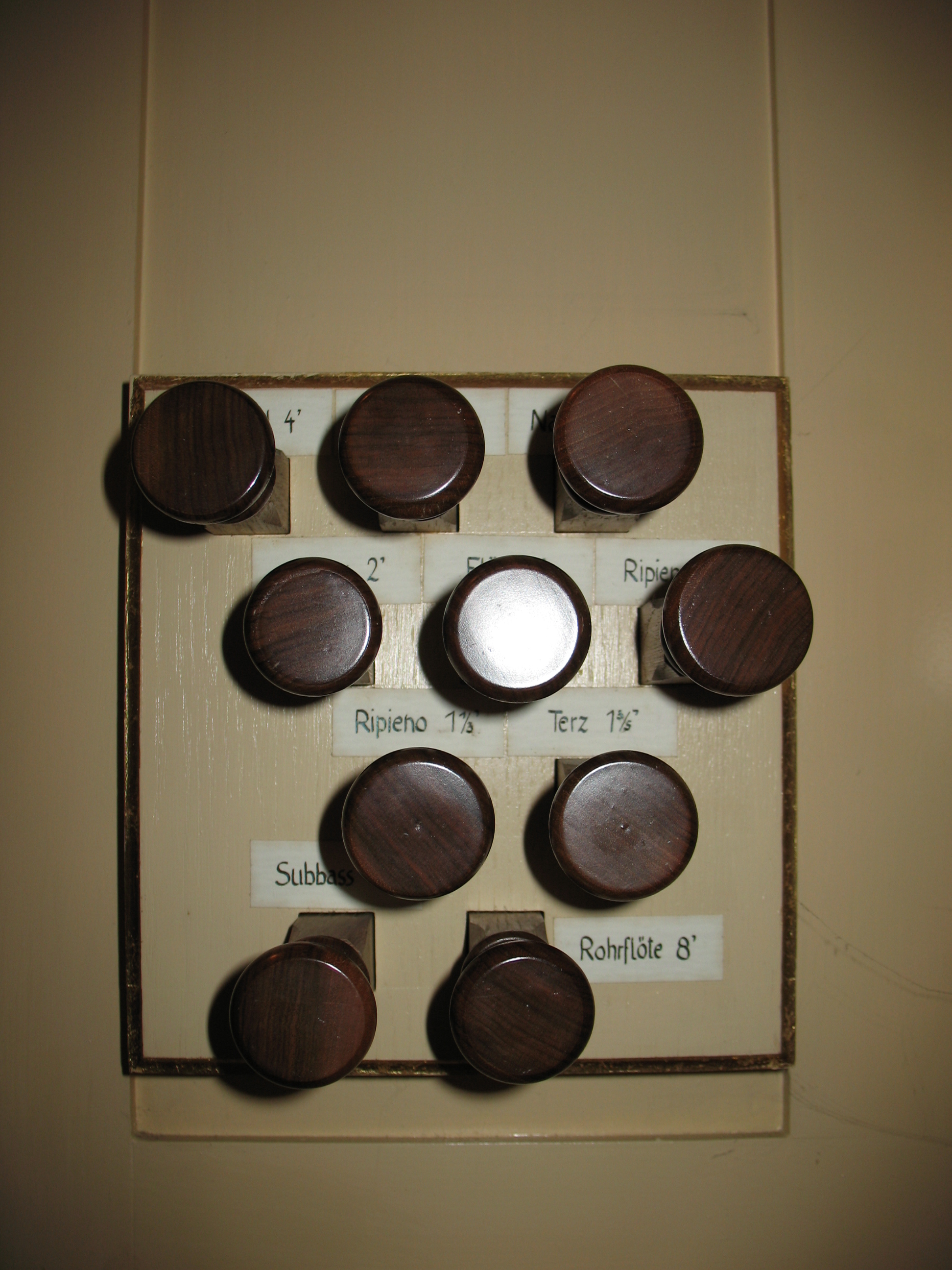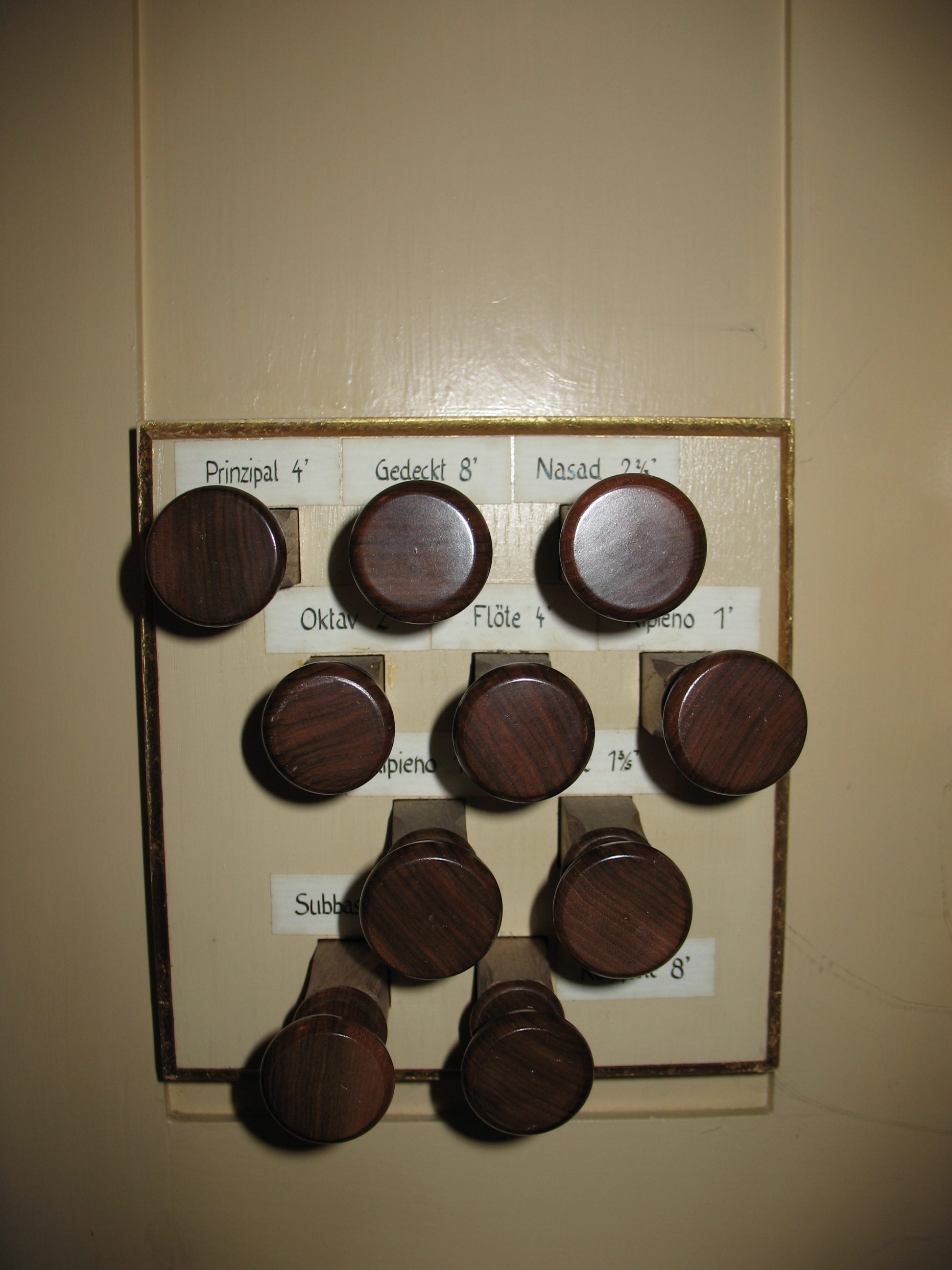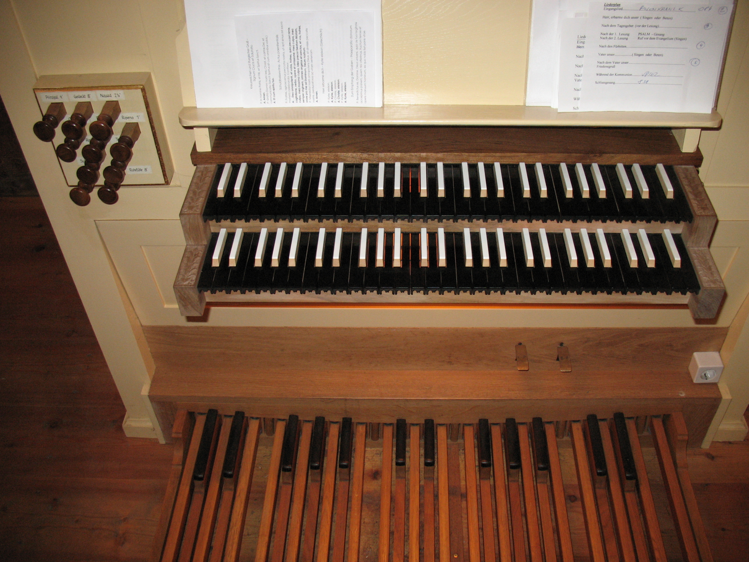 | Spielhilfen | Die Koppeln sind als Tritte über der Pedalklaviatur ausgeführt. |