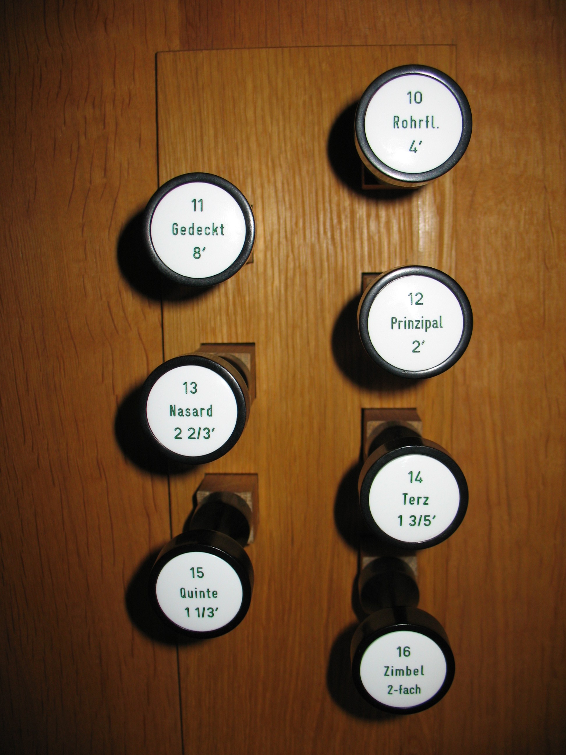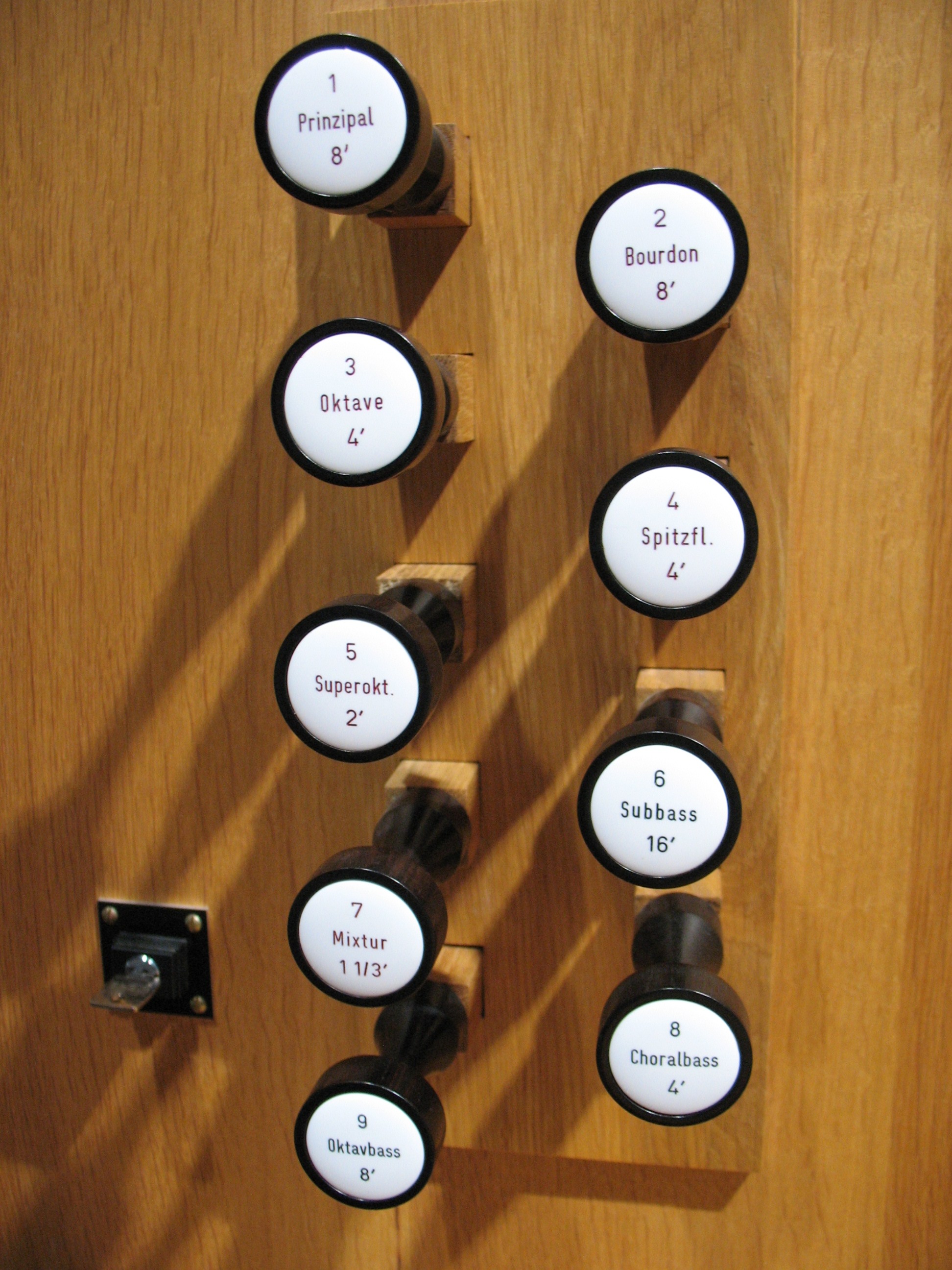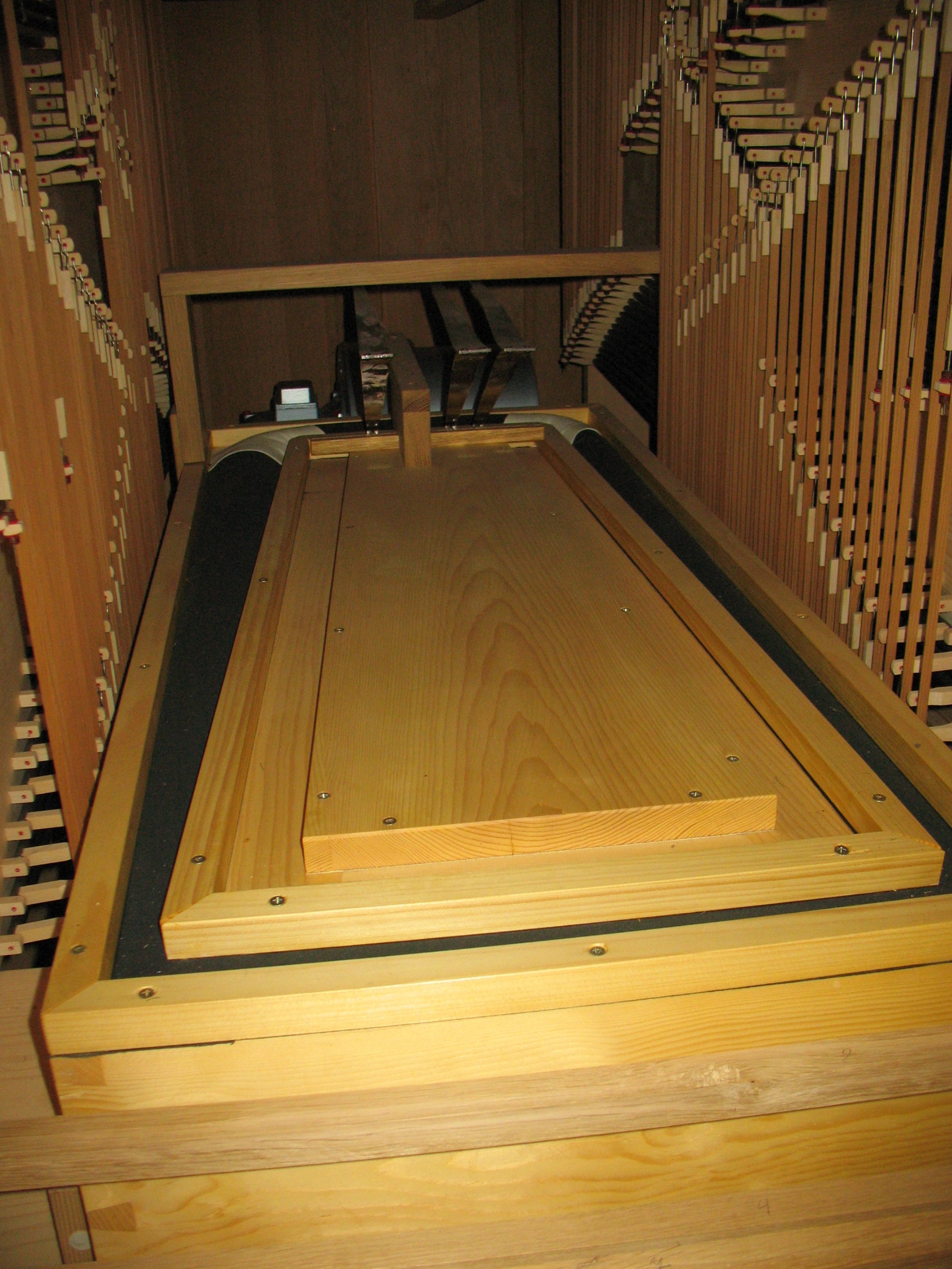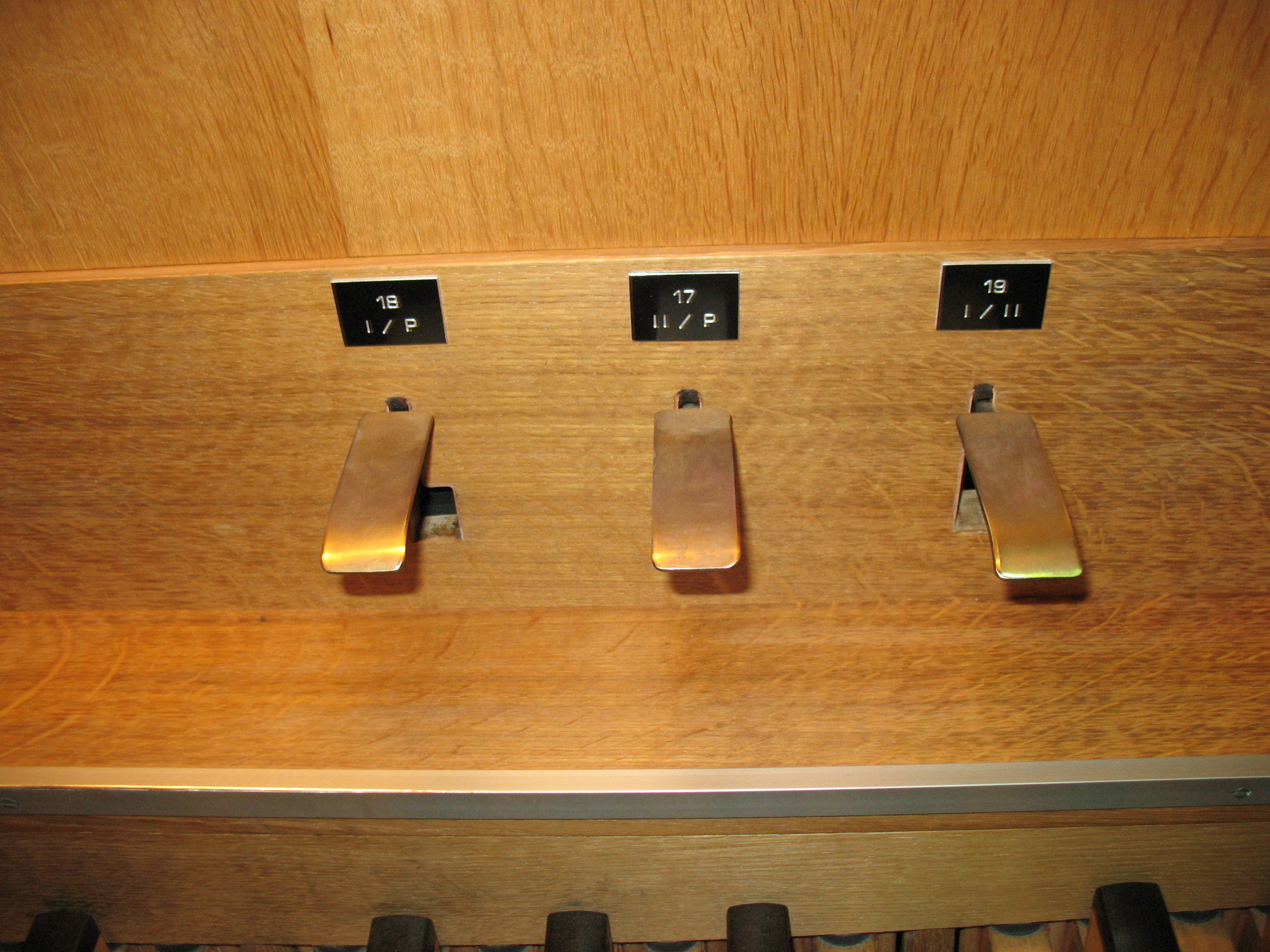 | Spielhilfen | Die Koppeln sind als Tritte über der Pedalklaviatur ausgeführt |