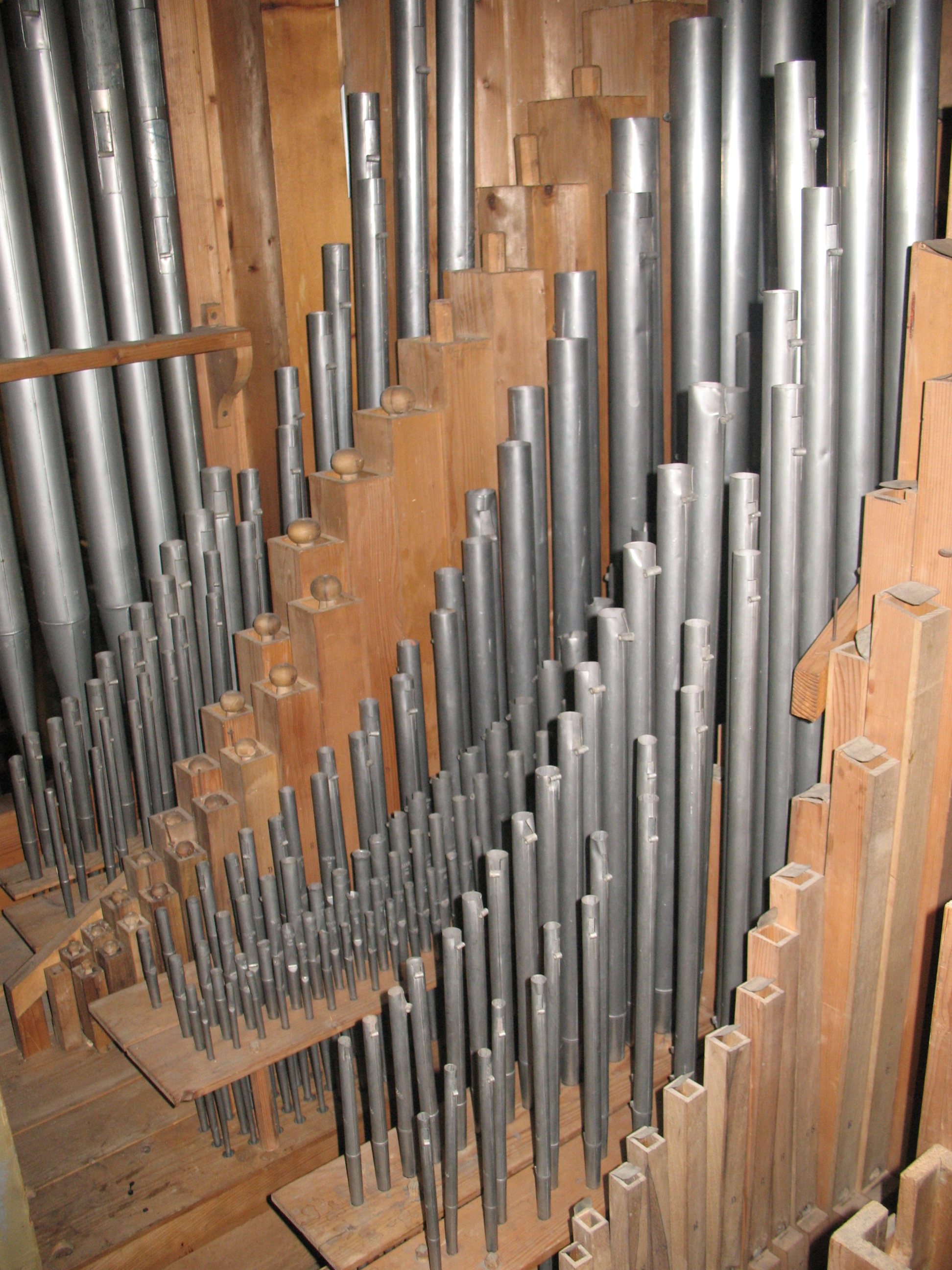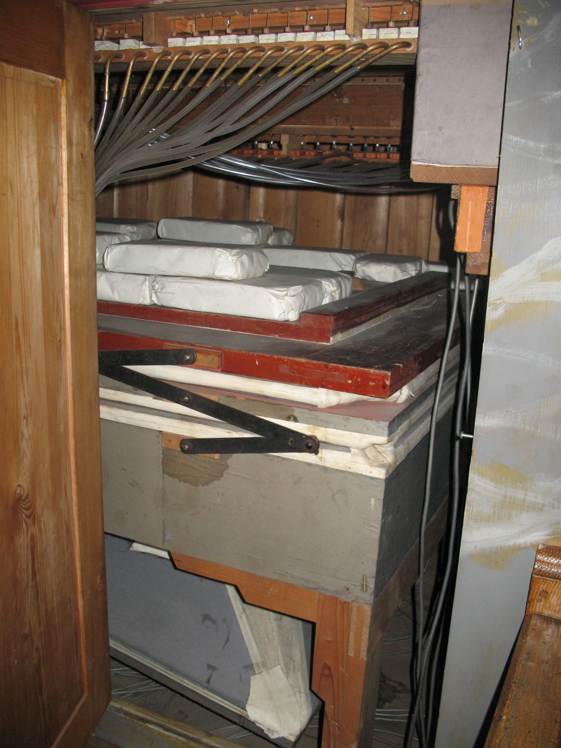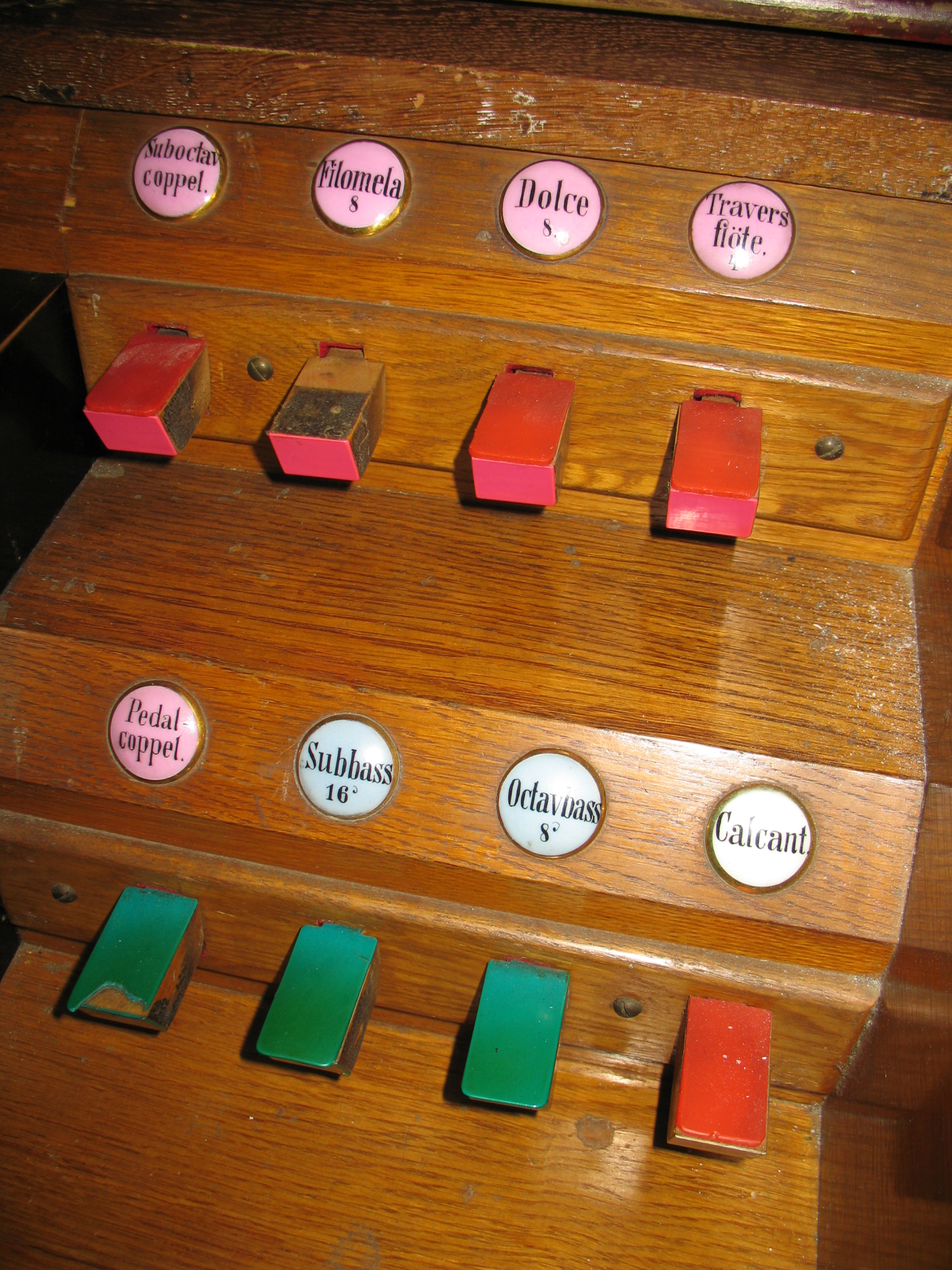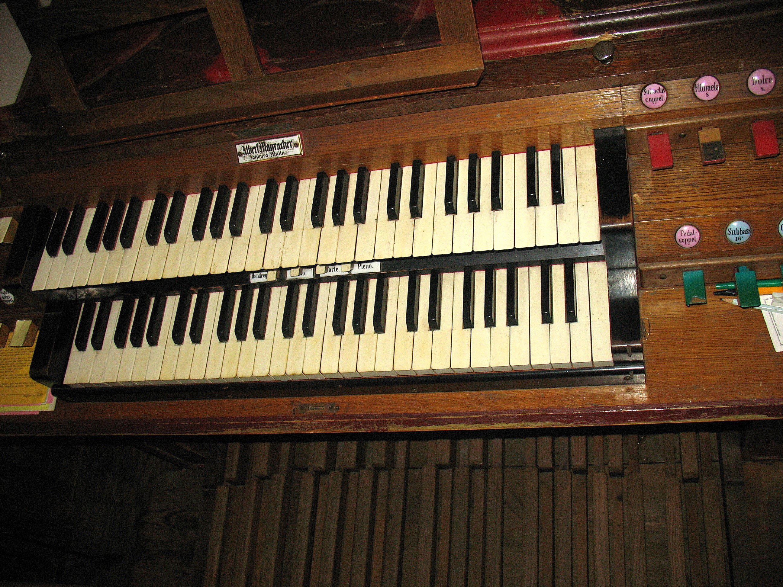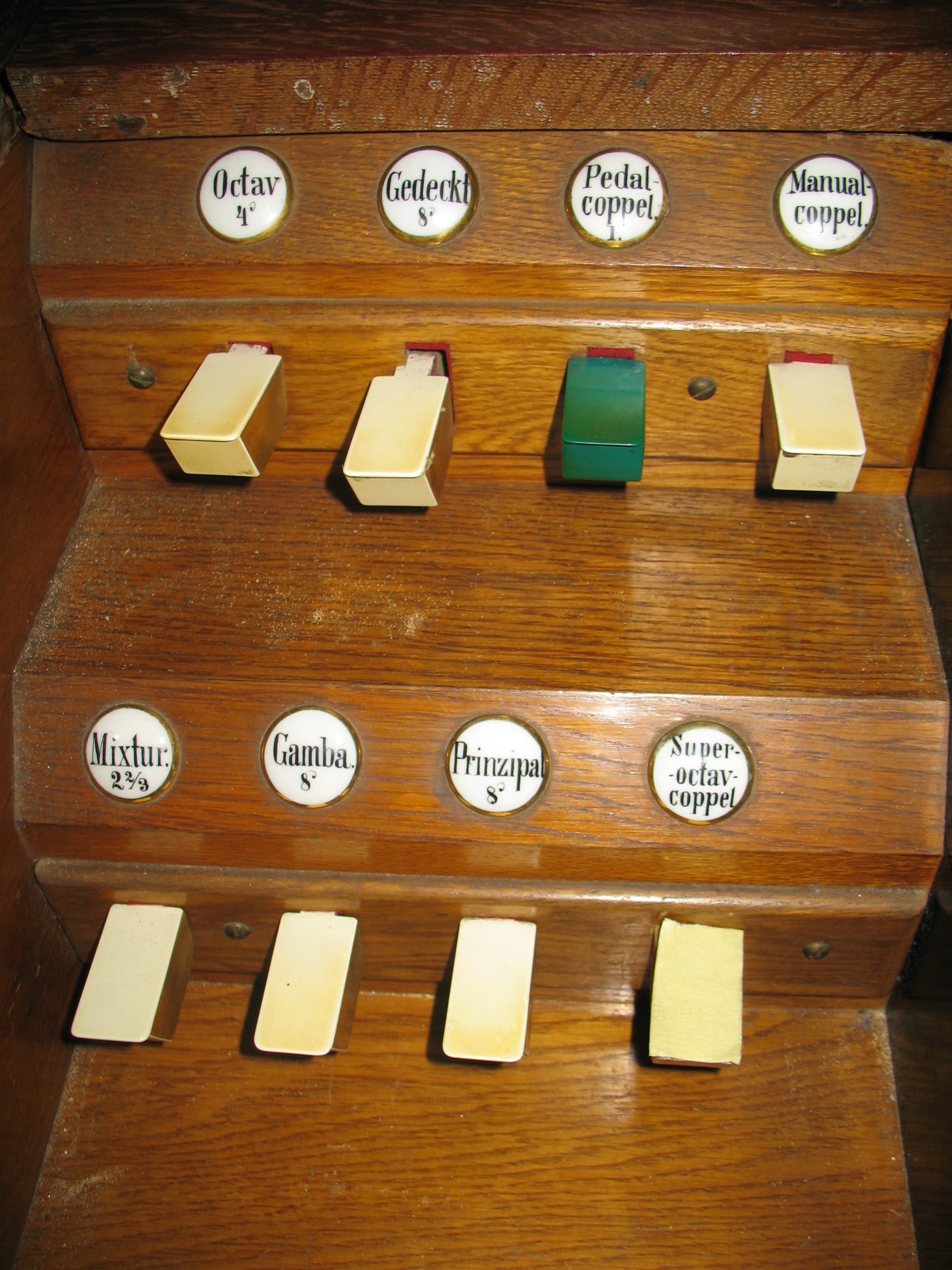 | Spielhilfen | Die Koppeln und der Calcant sind als Registerwippen rechts und links der Klaviaturen ausgefürht. Die festen Kombinationen sind als Taster (zum Hinunterdrücken) zwischen den beiden Manualklaviaturen ausgeführt. |