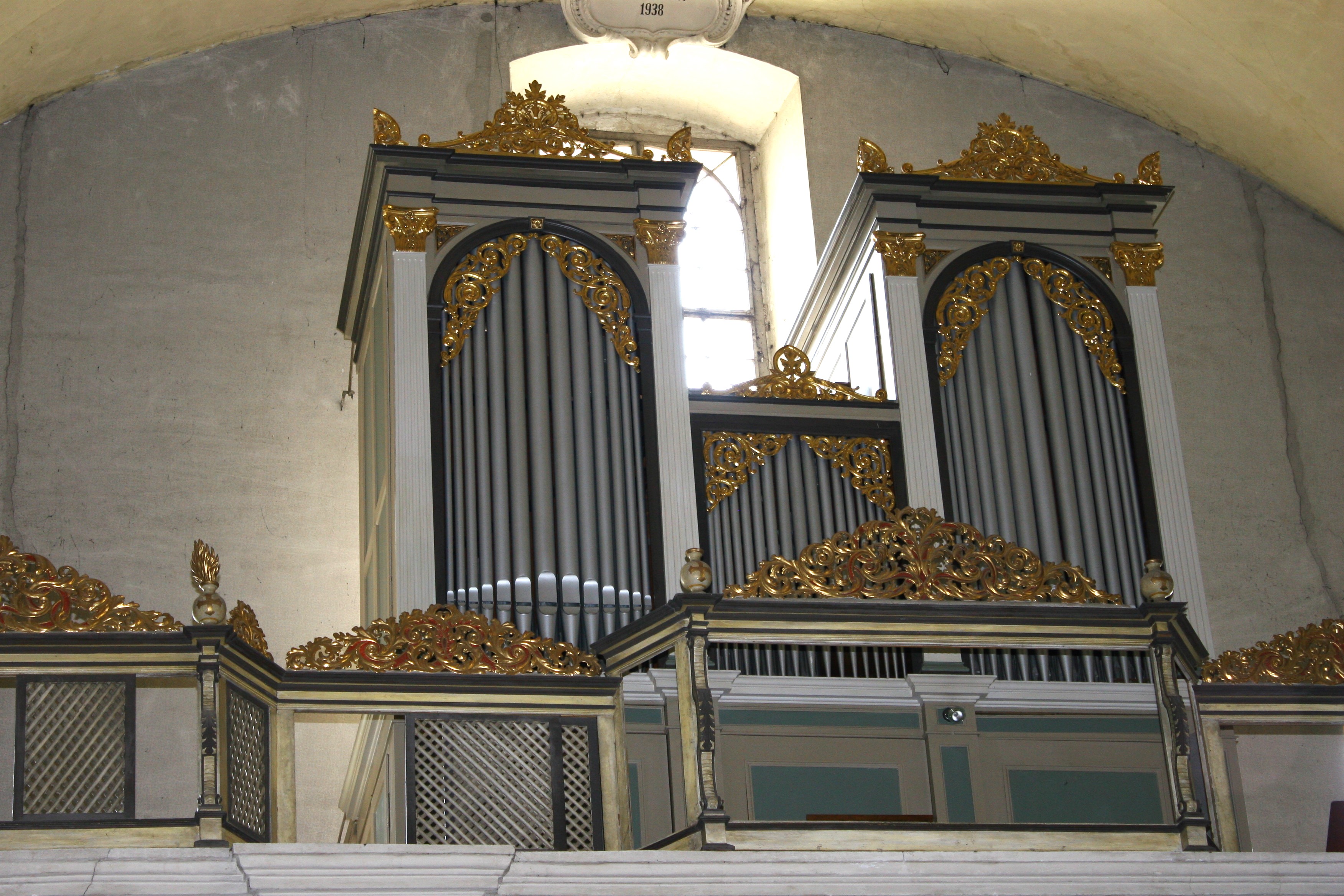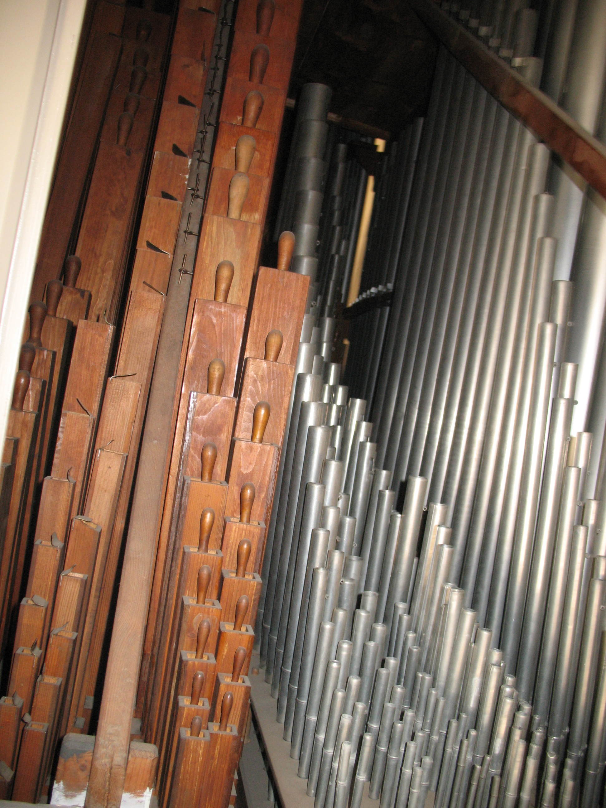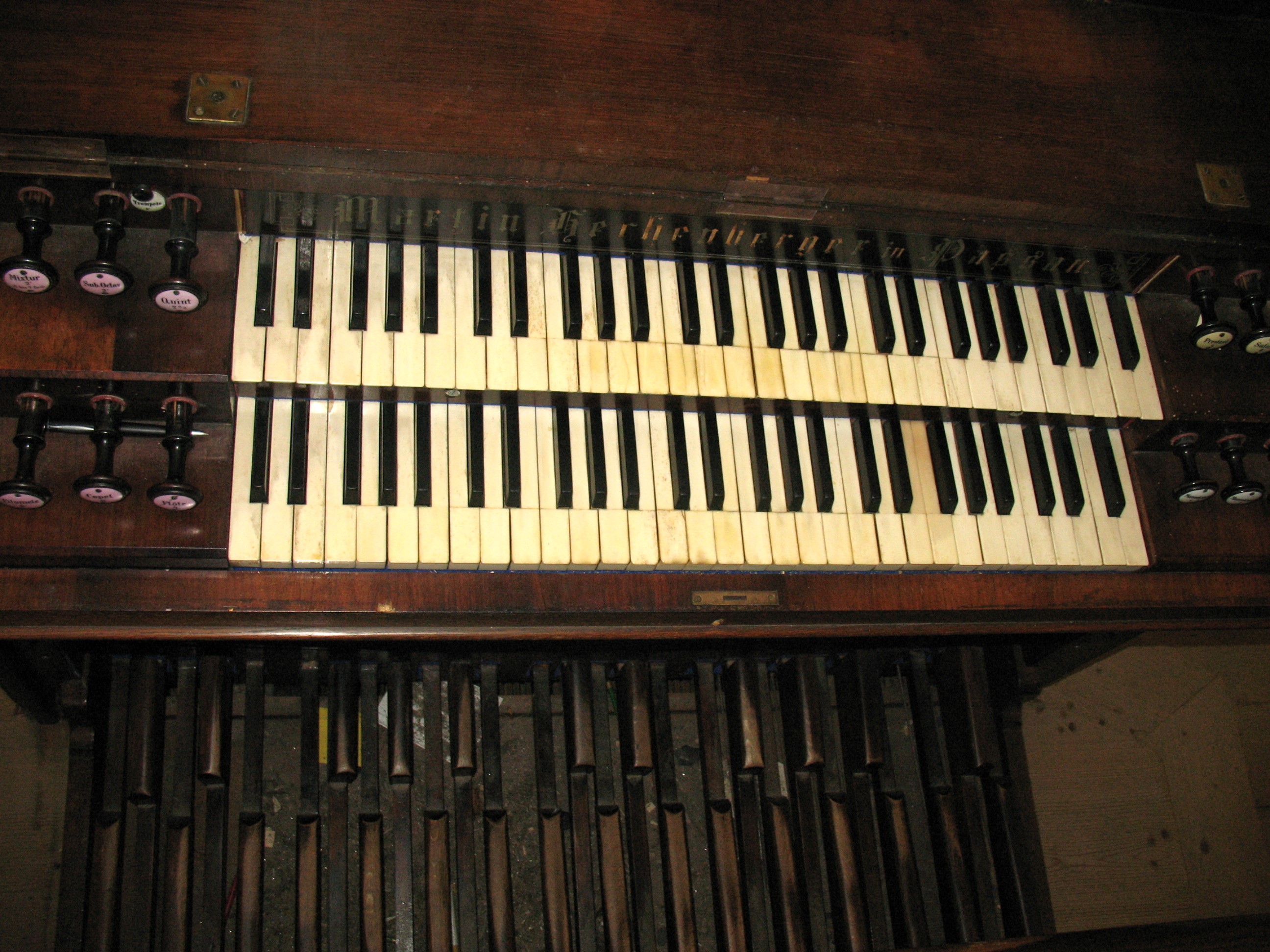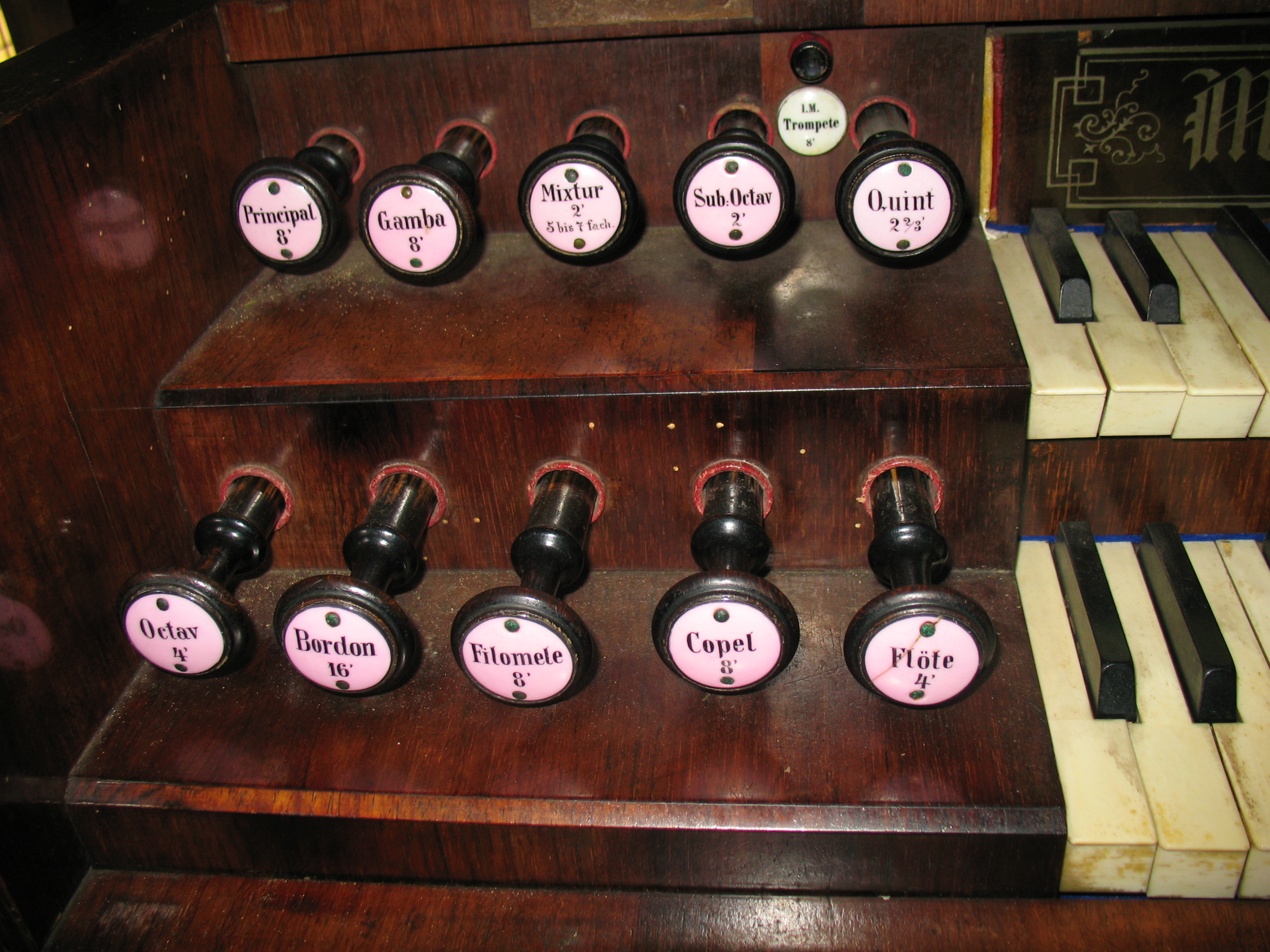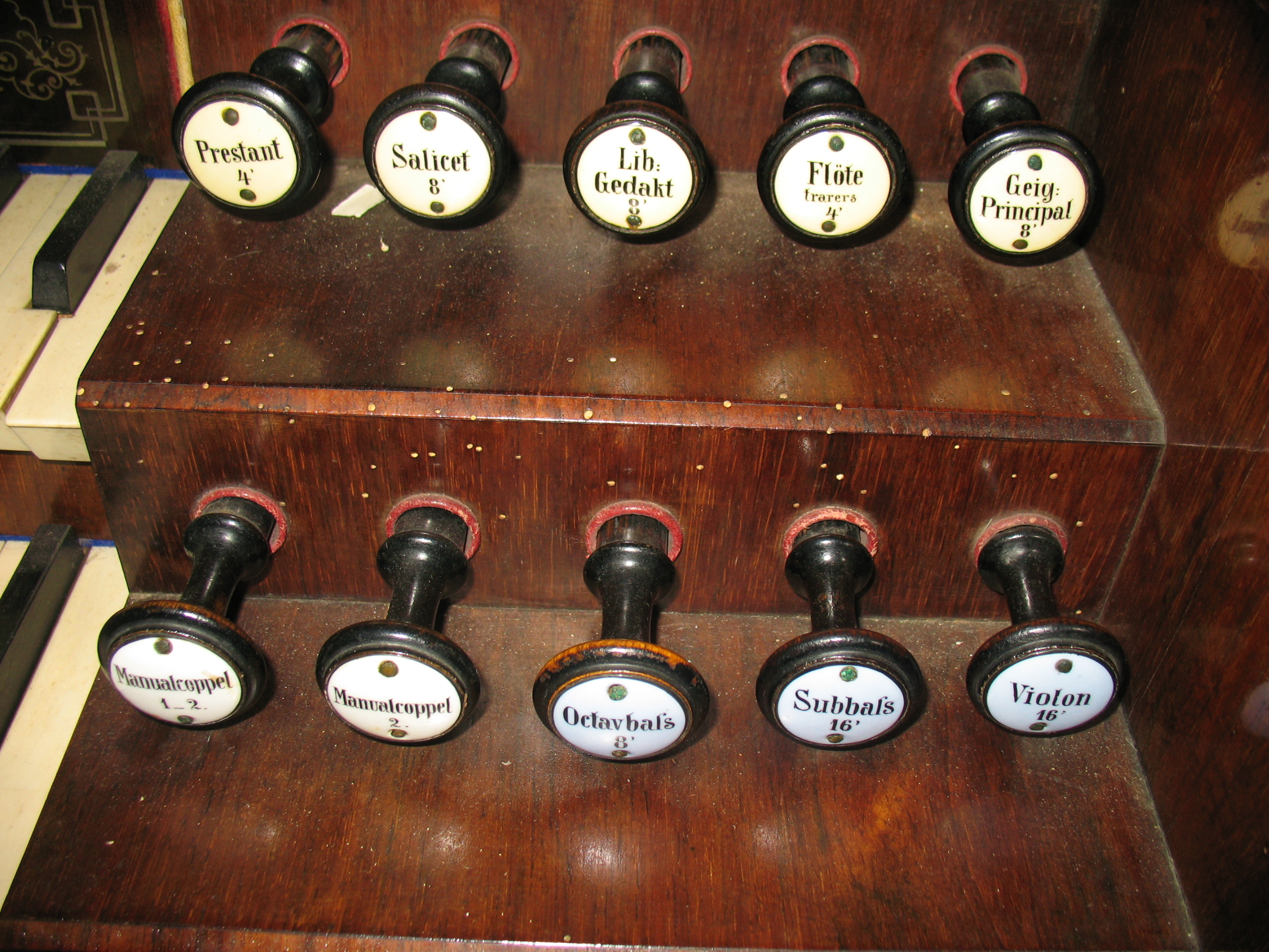 | Spielhilfen | Die beiden Manualkoppeln sind als Registerzüge ausgeführt Die beiden Pedalkoppeln sind als Tritte über der Pedalklaviatur ausgeführt |