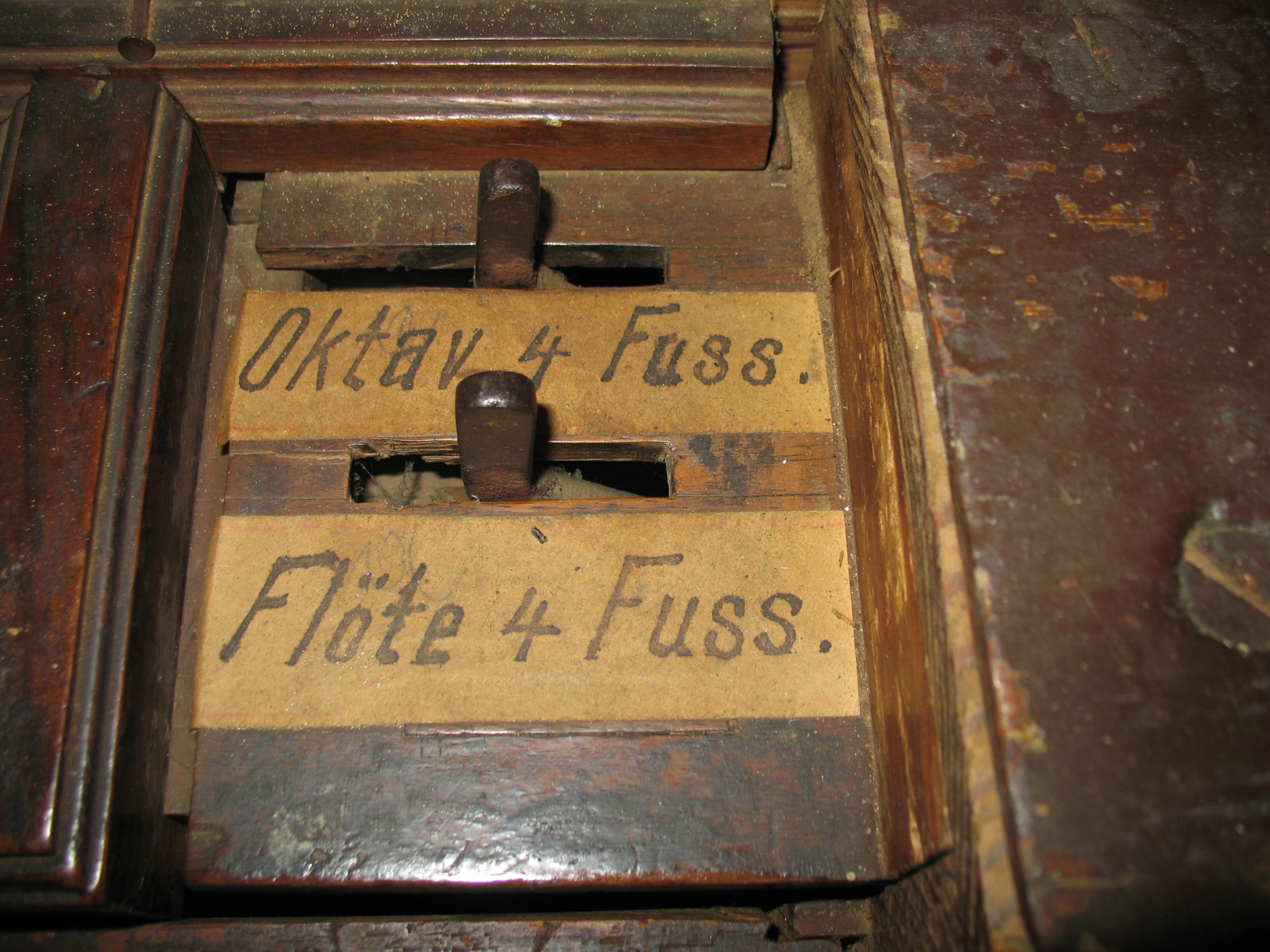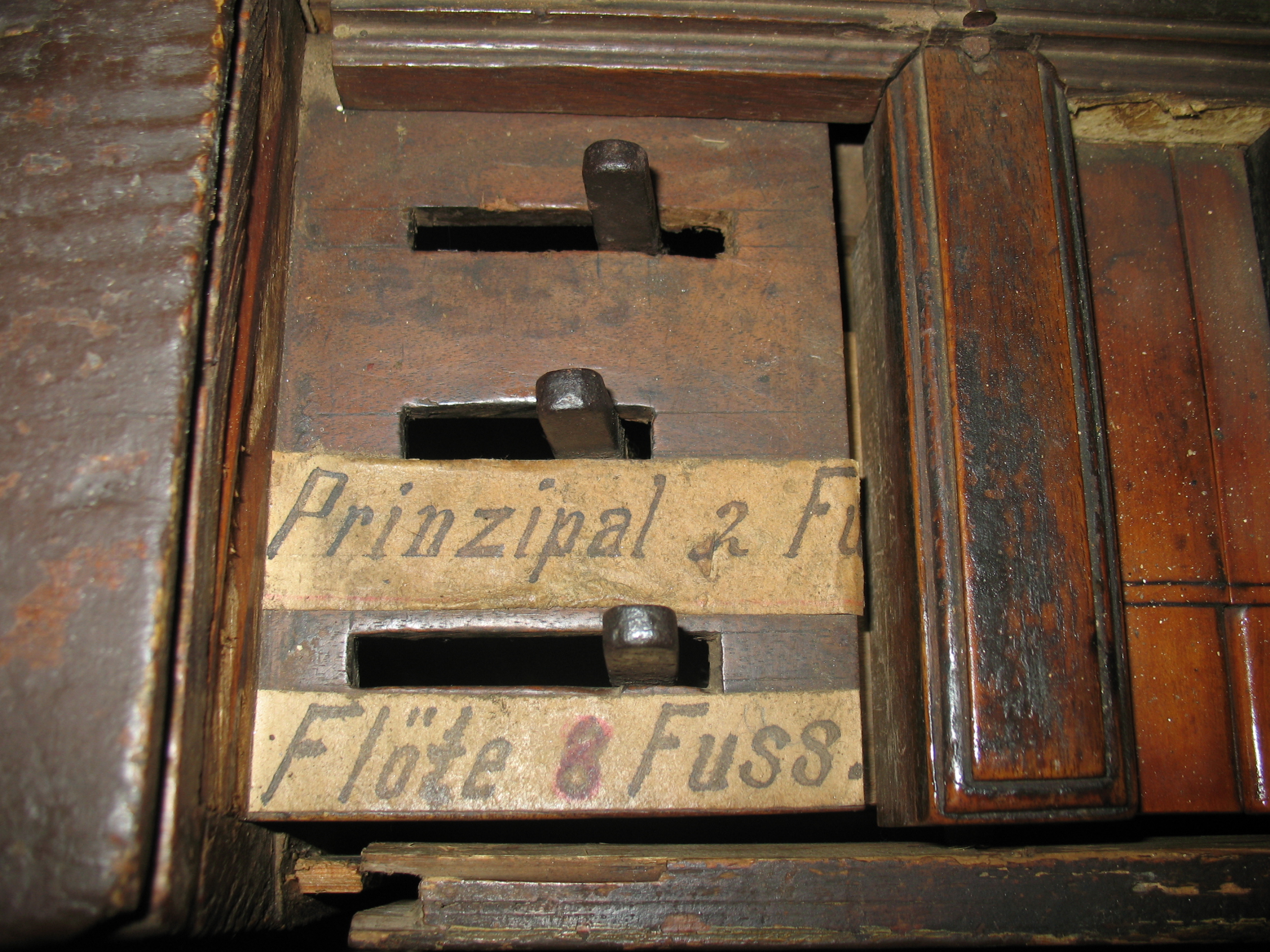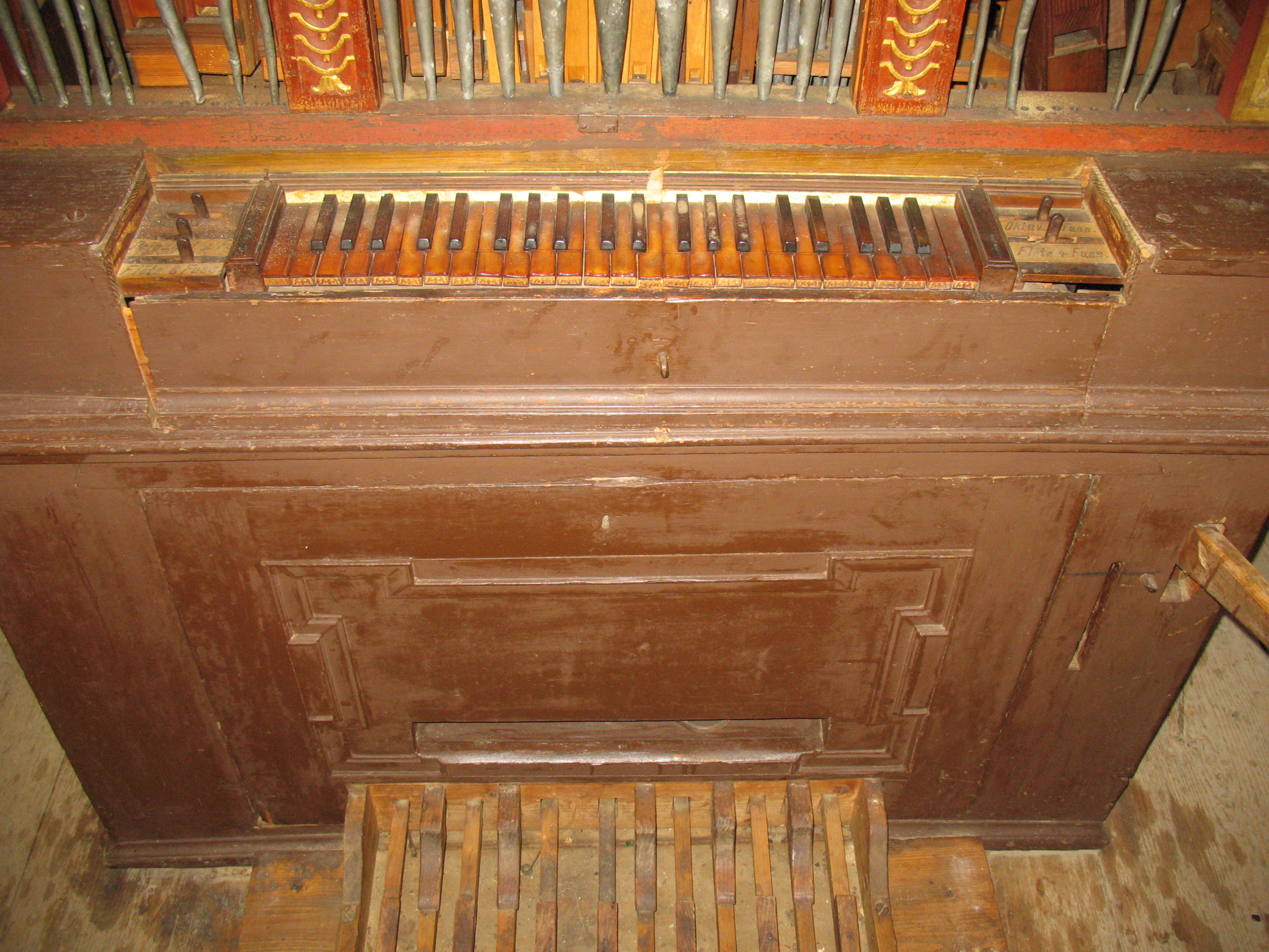 Die Tastenvorderfronten sind gleich verziert wie bei der Orgel in der